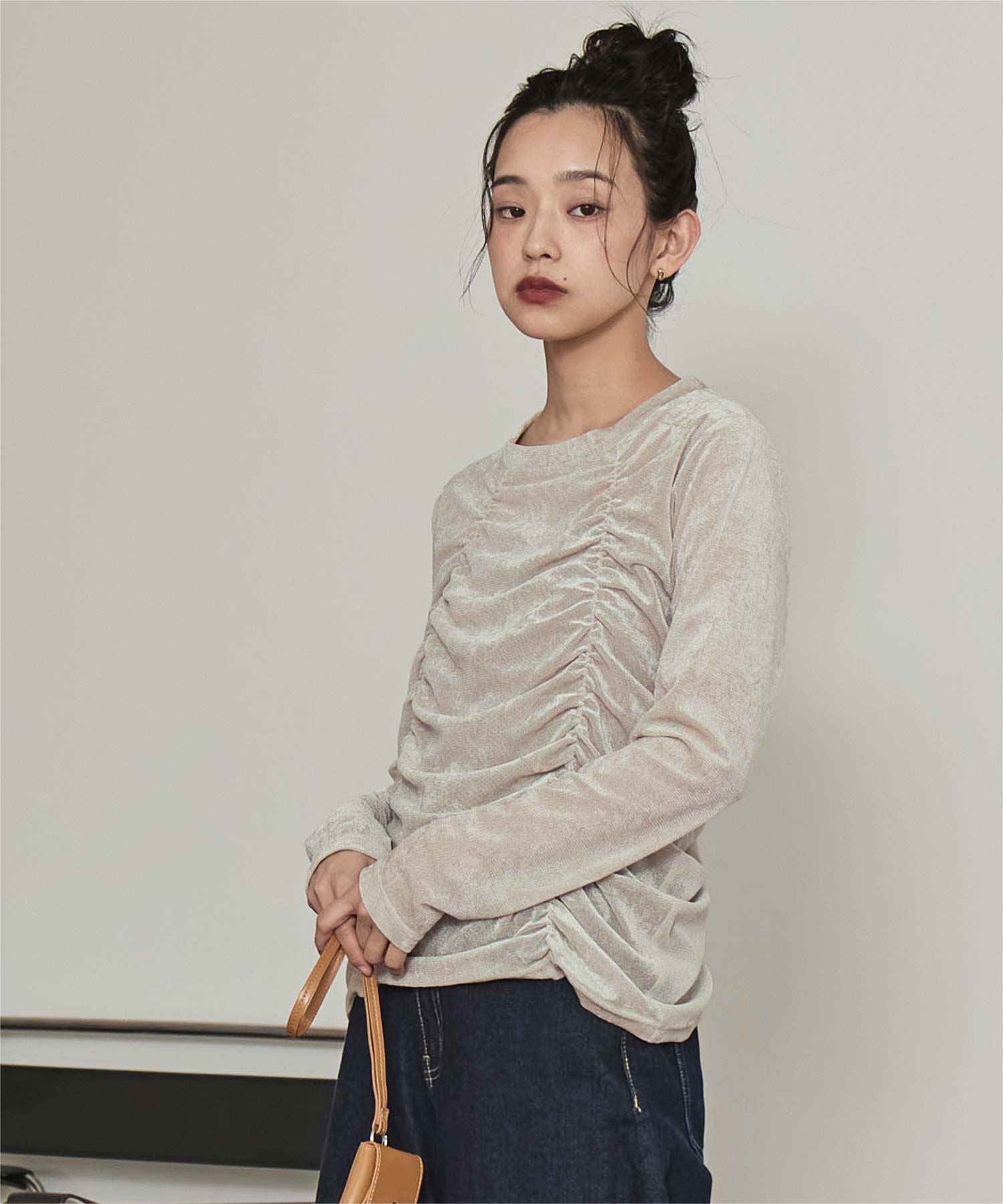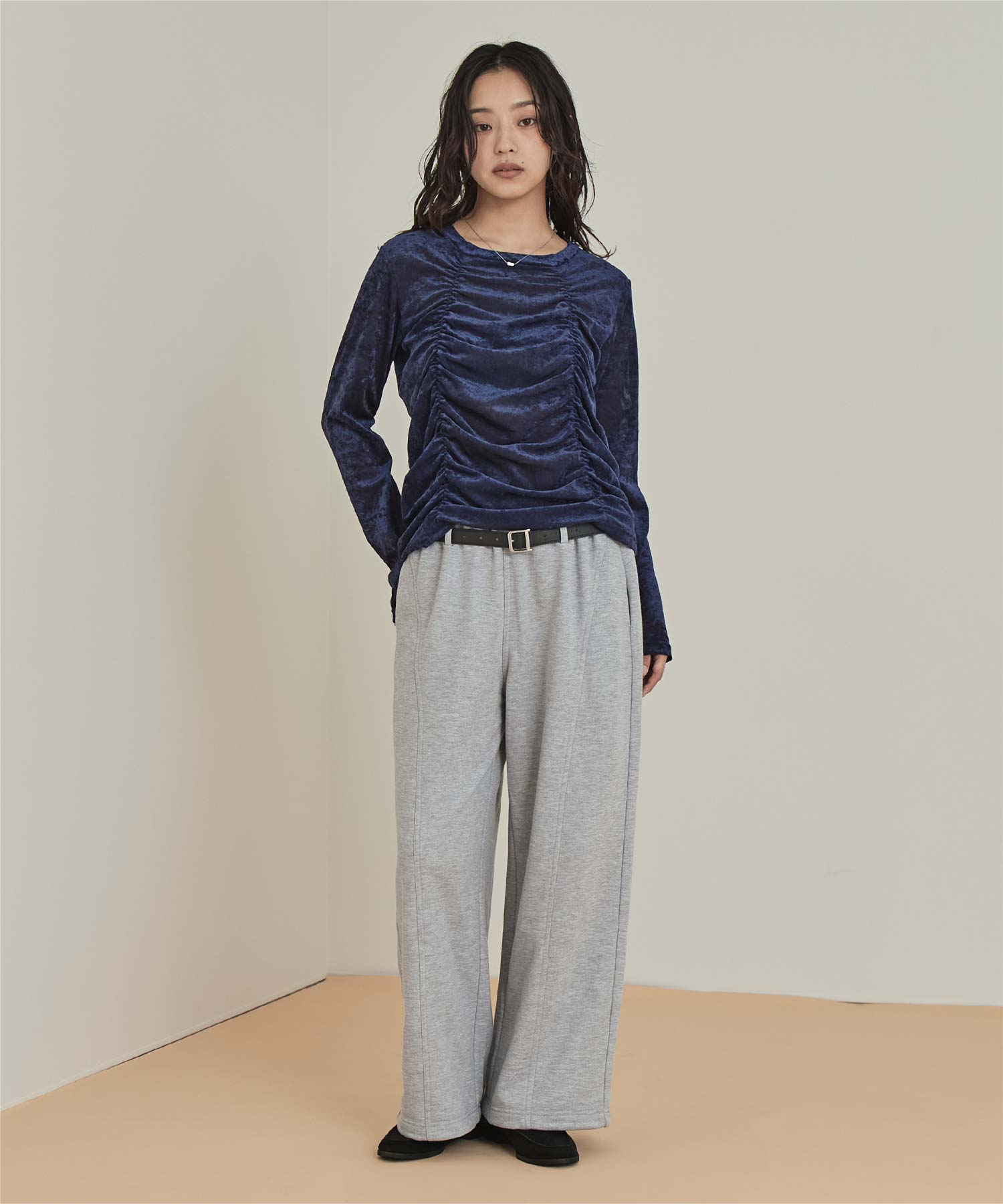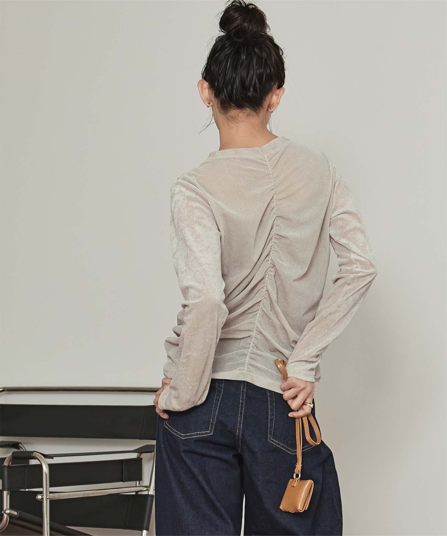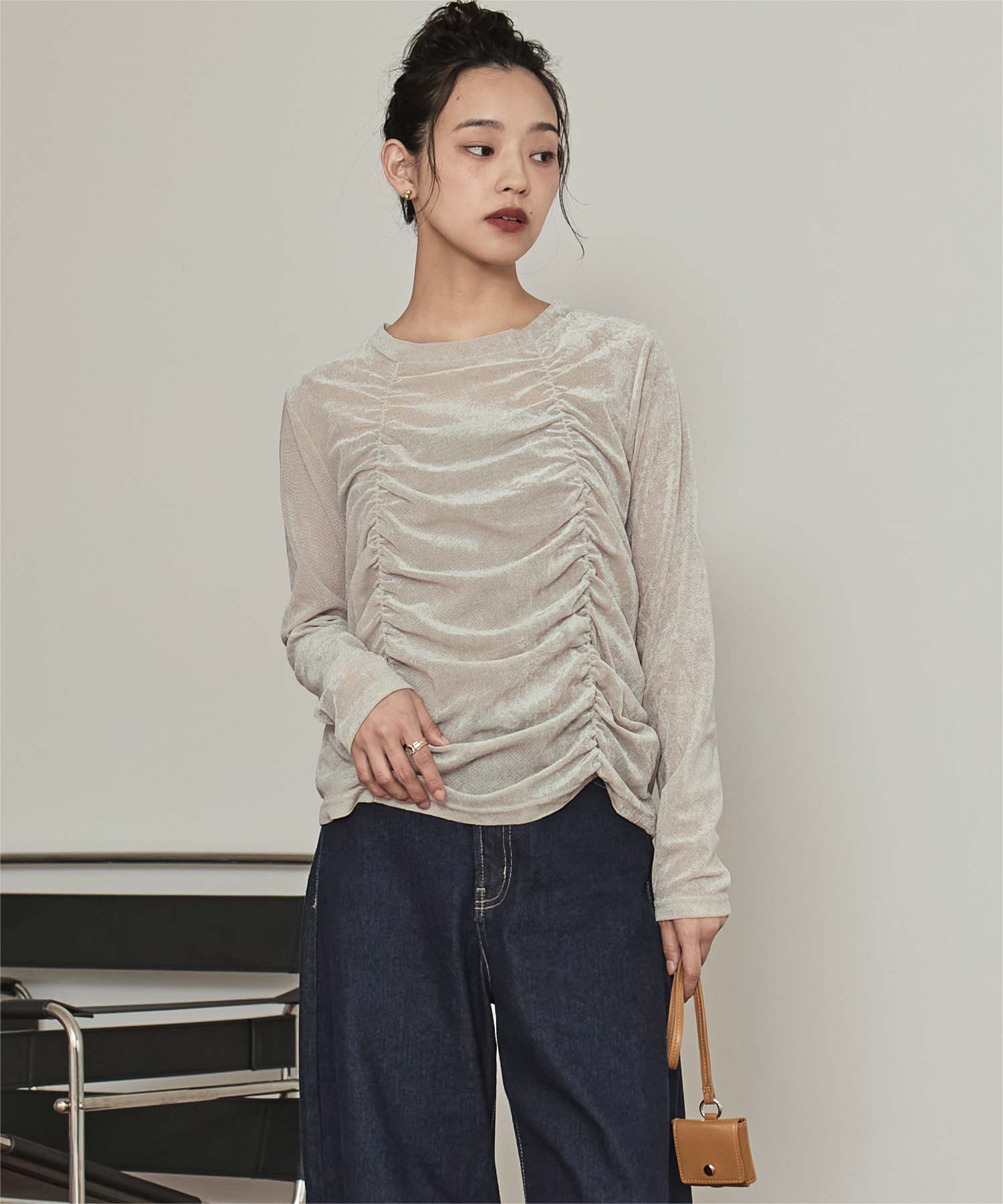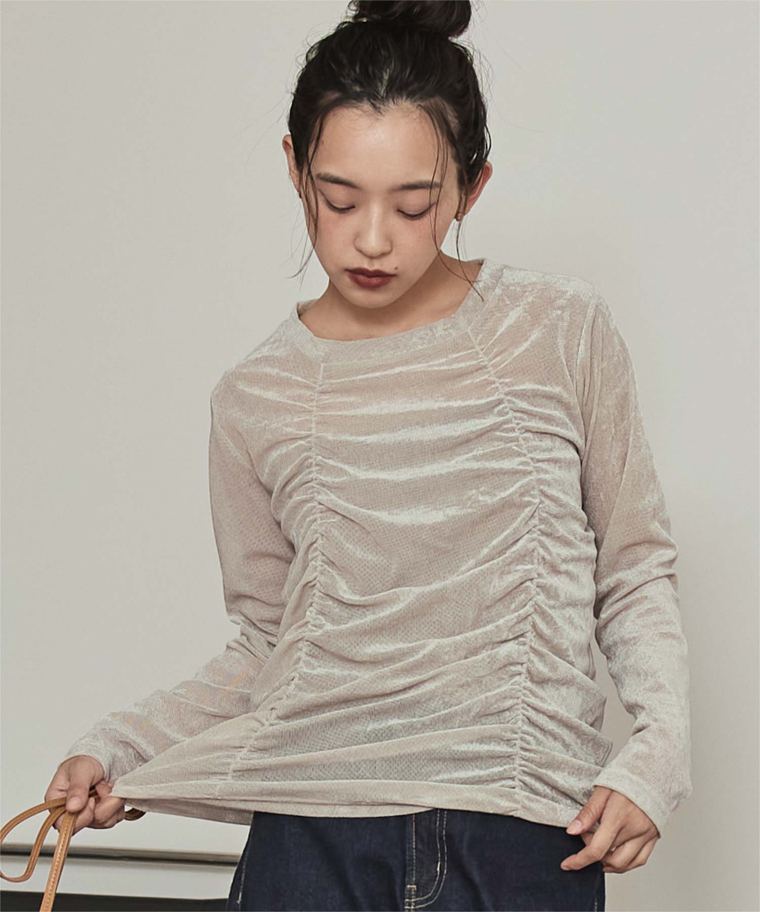 ・長めの袖とサイドギャザーがポイントのデザイントップス