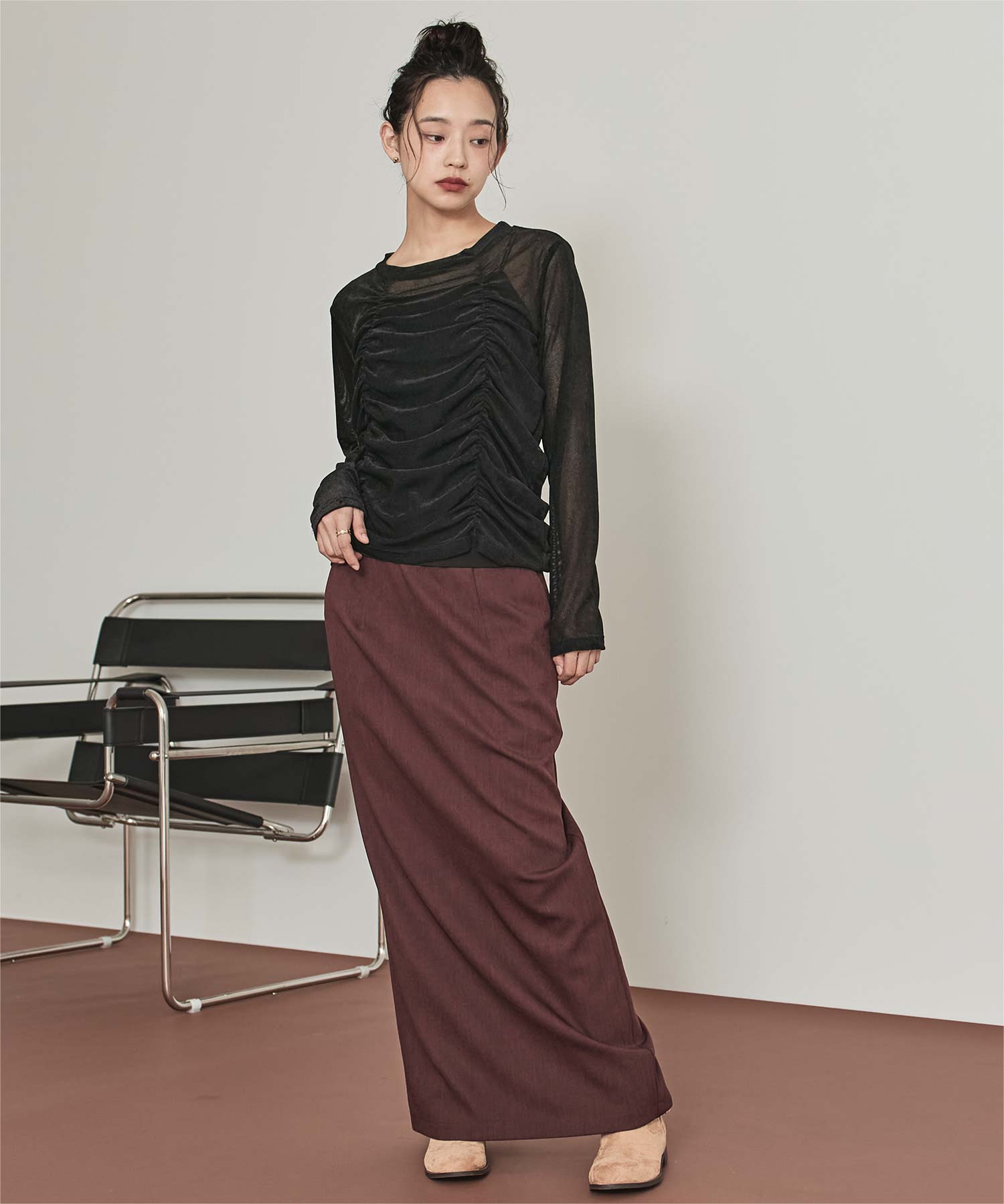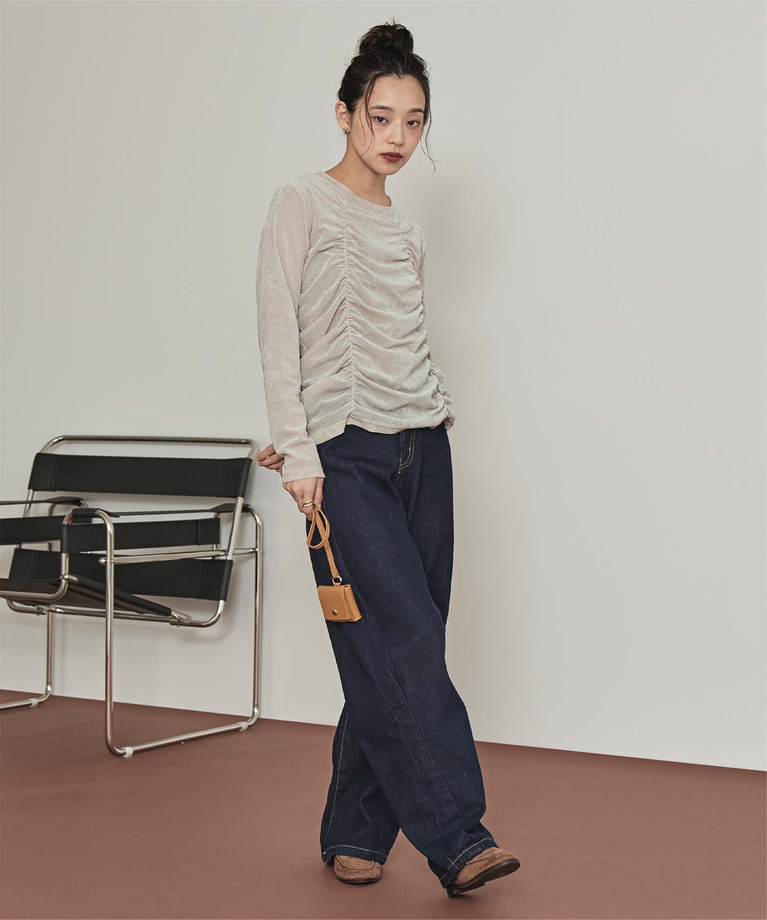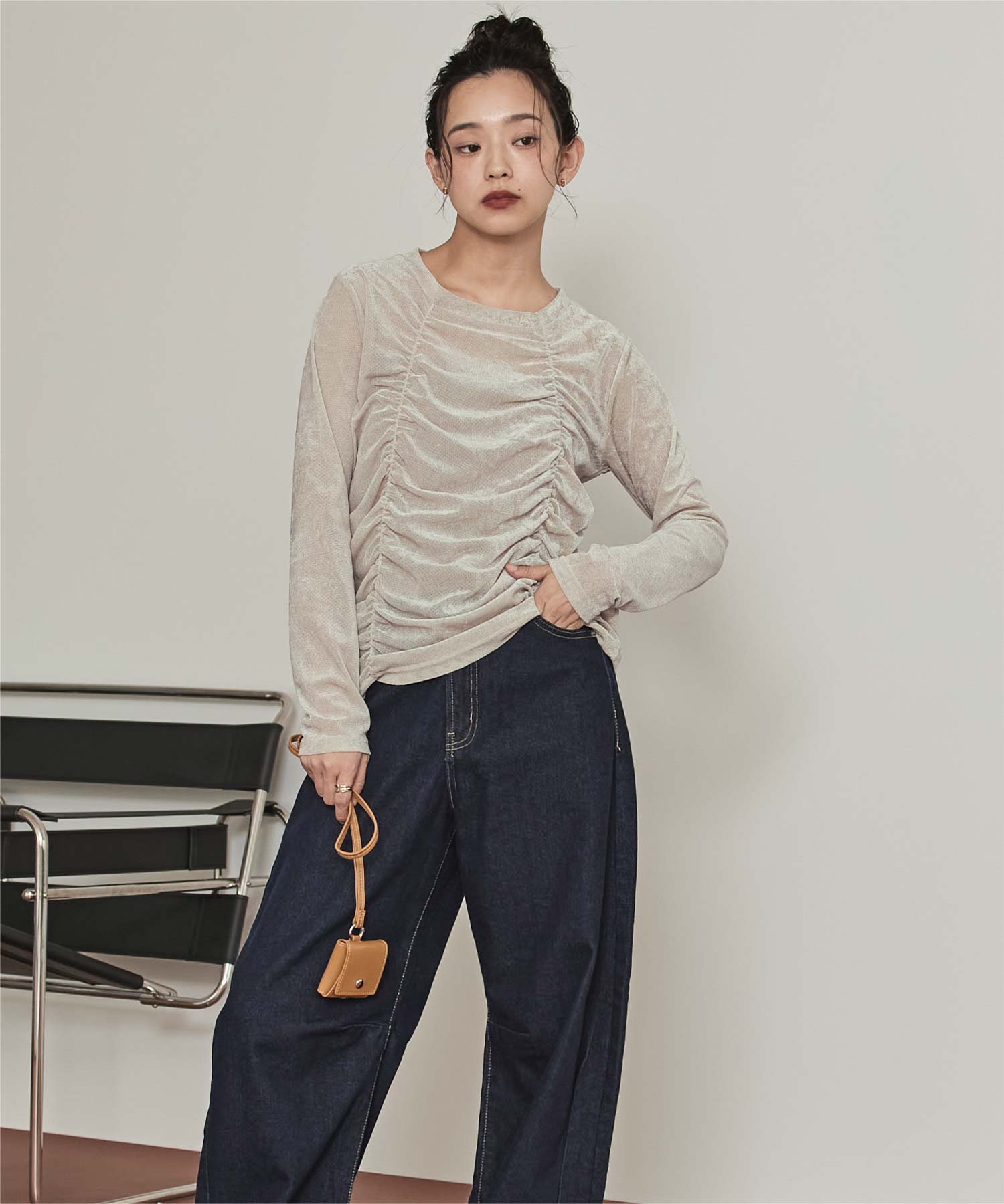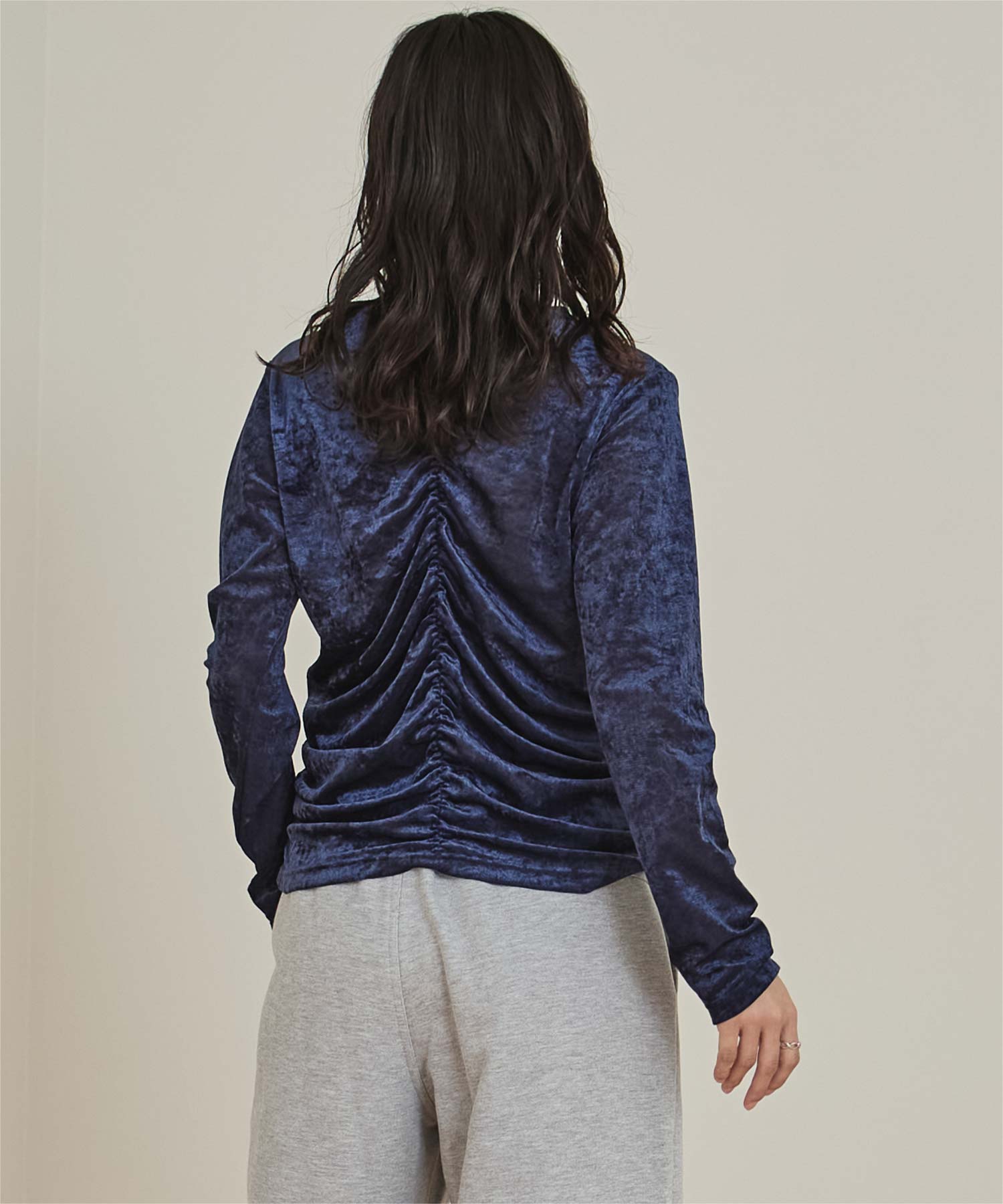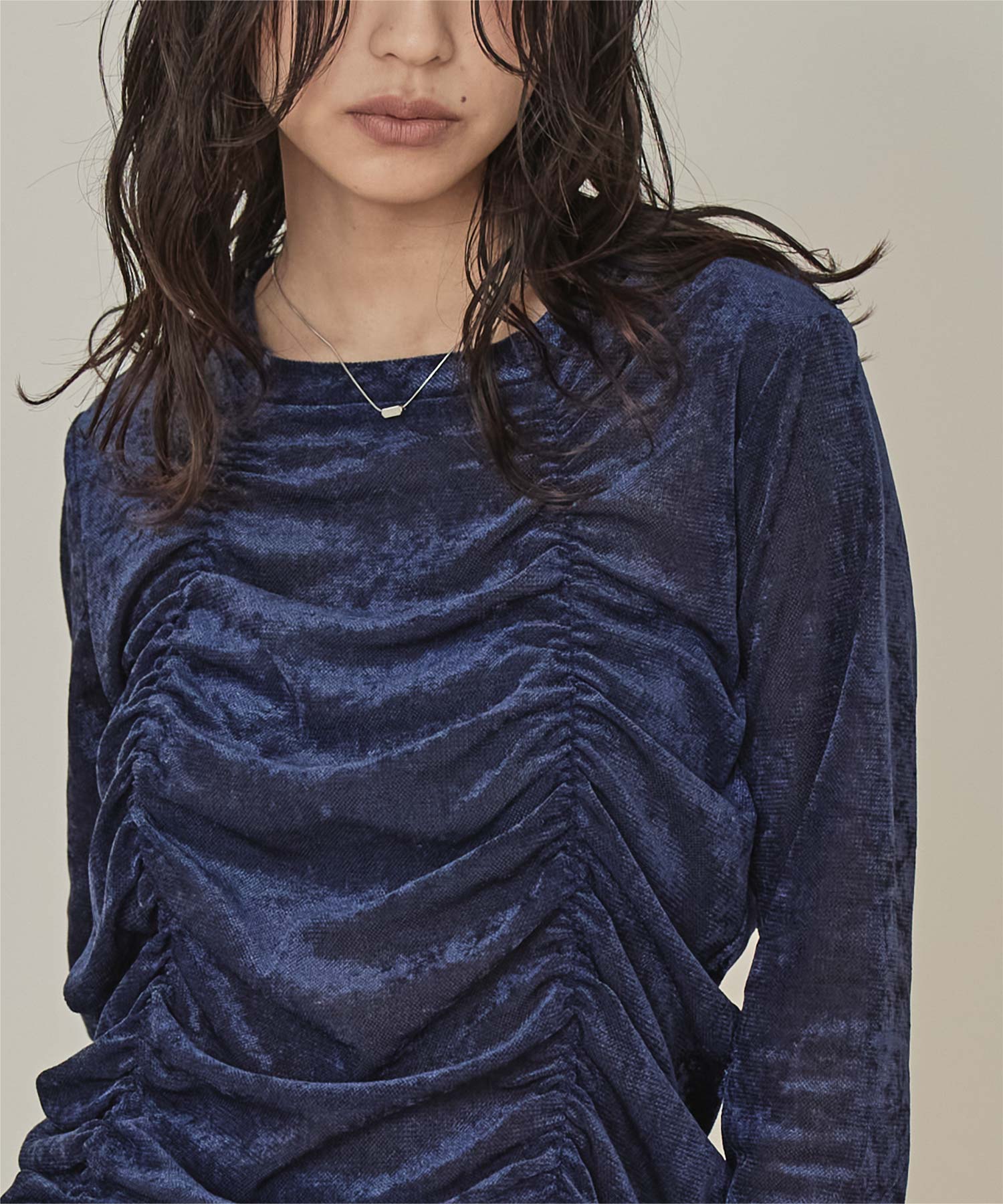 ・長めの袖とサイドギャザーがポイントのデザイントップス
