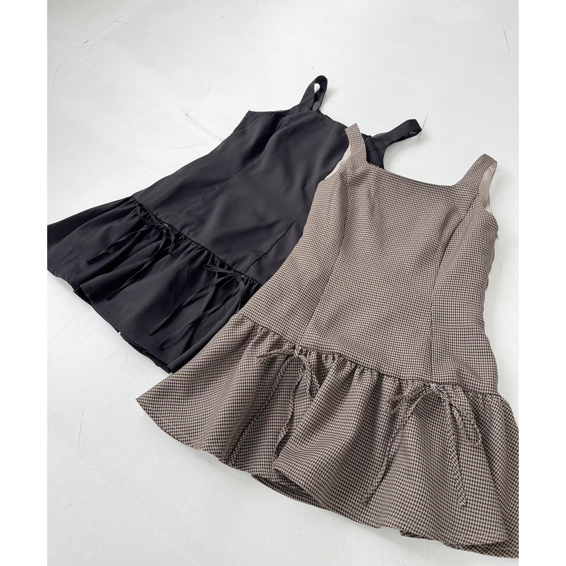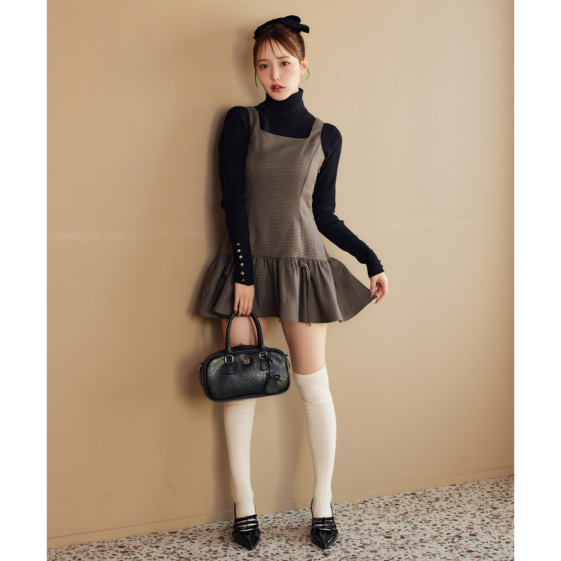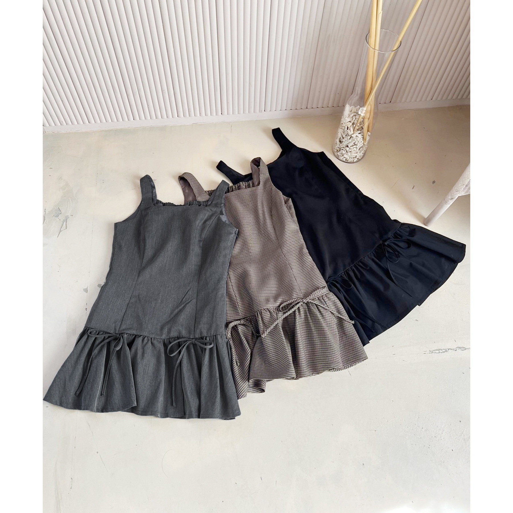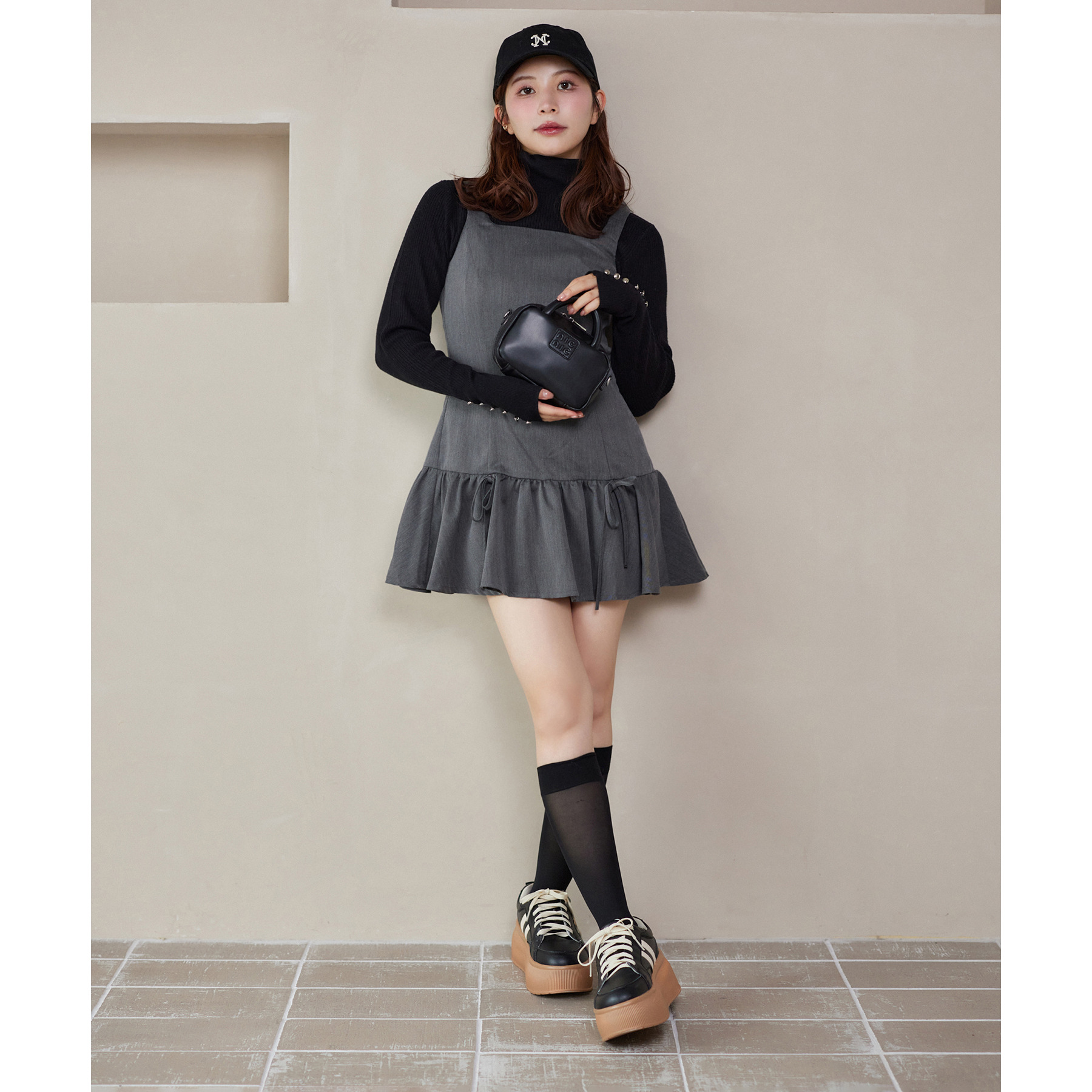 ふんわり広がるシルエットとさりげないリボンが可愛らしいミニジャンパースカート