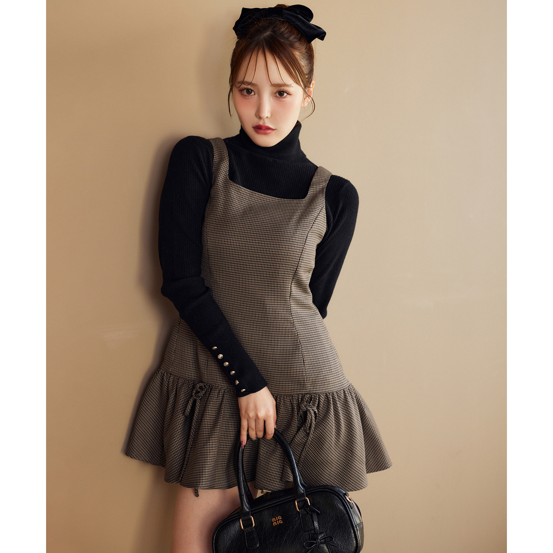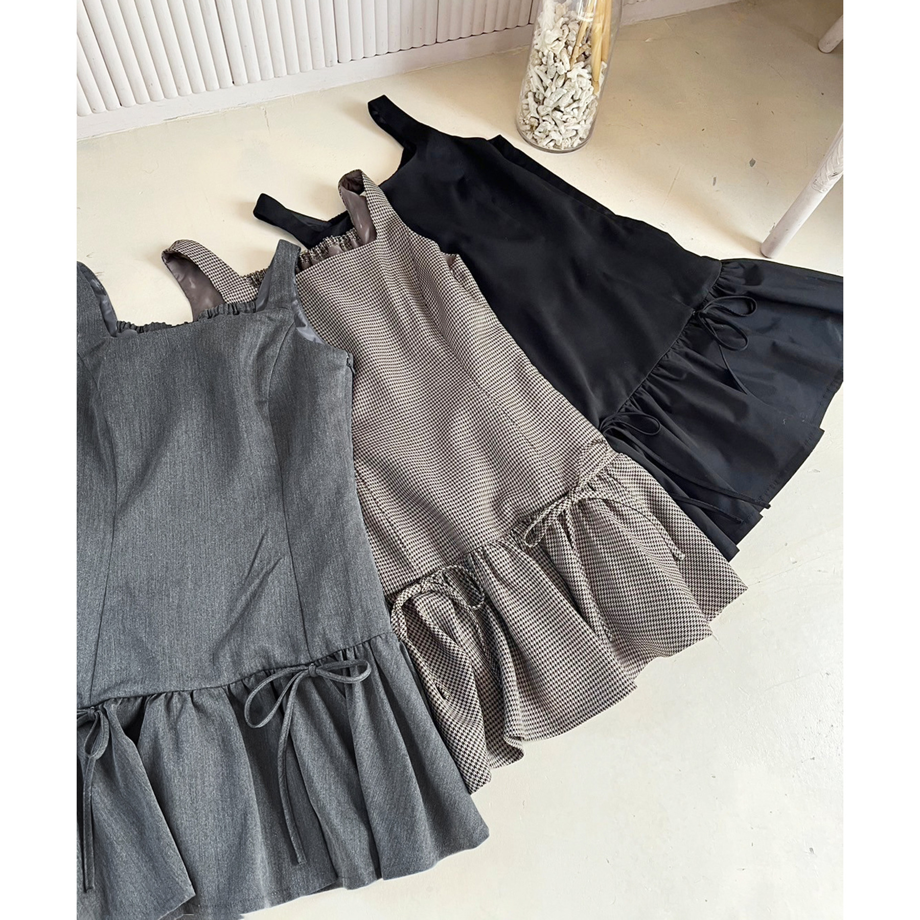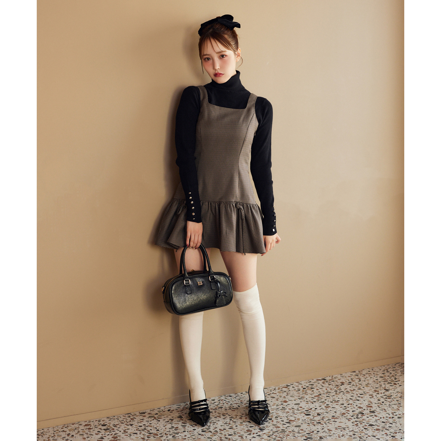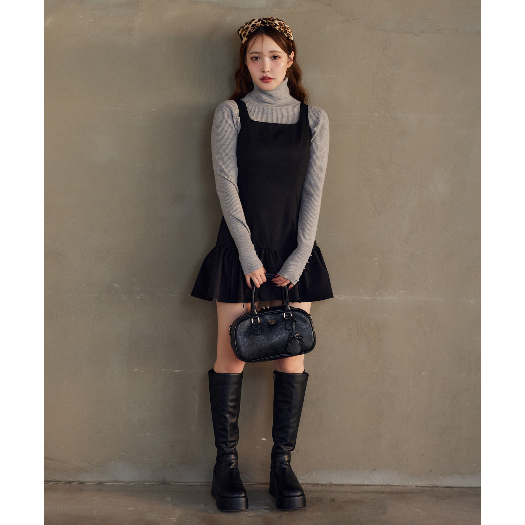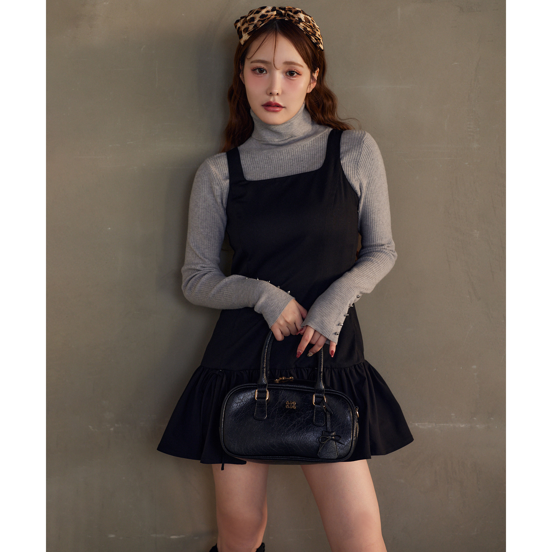 ふんわり広がるシルエットとさりげないリボンが可愛らしいミニジャンパースカート