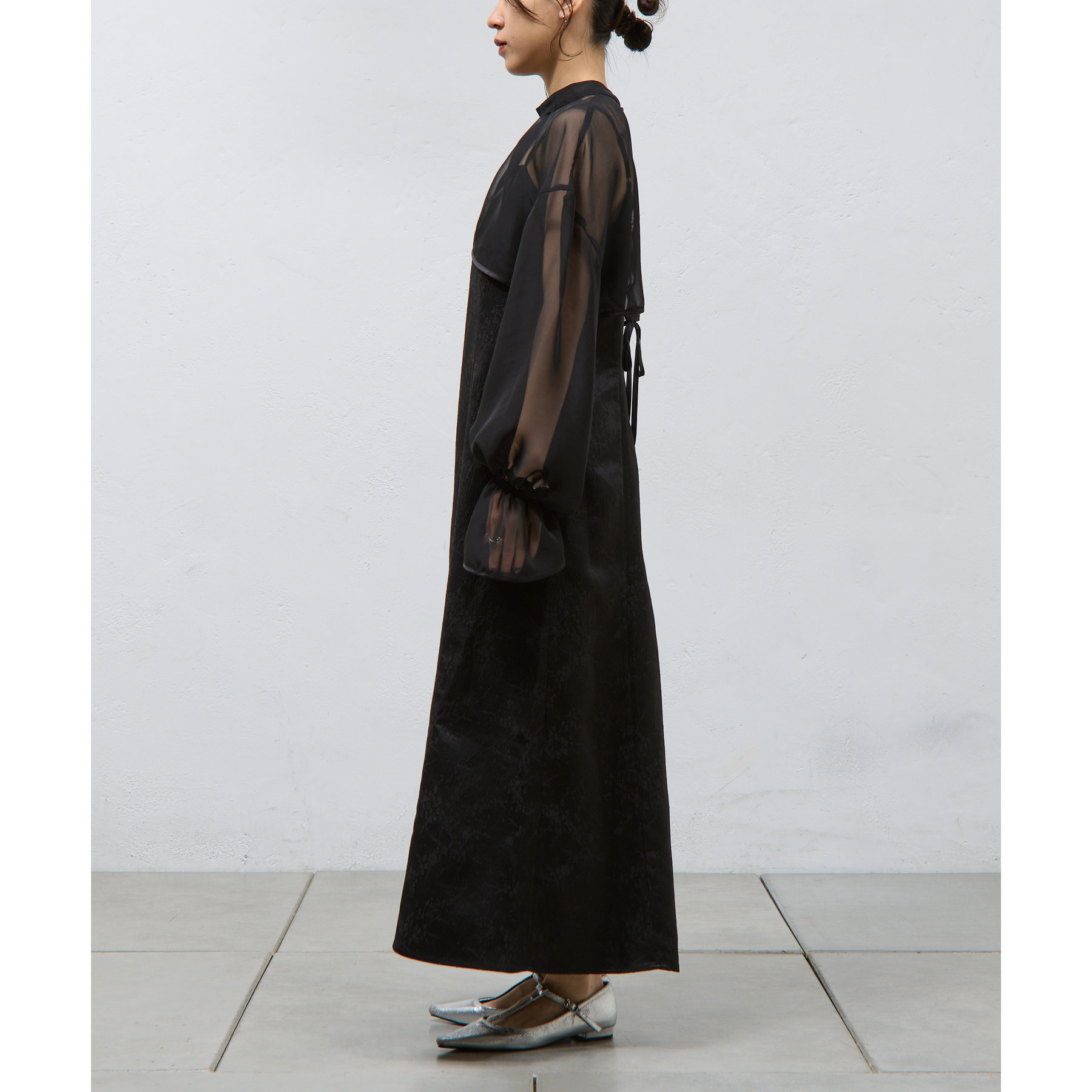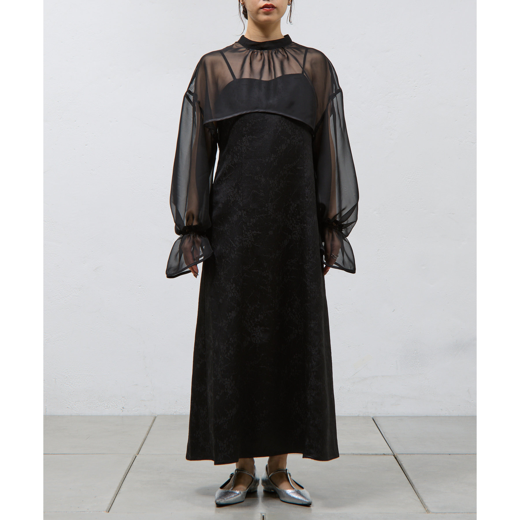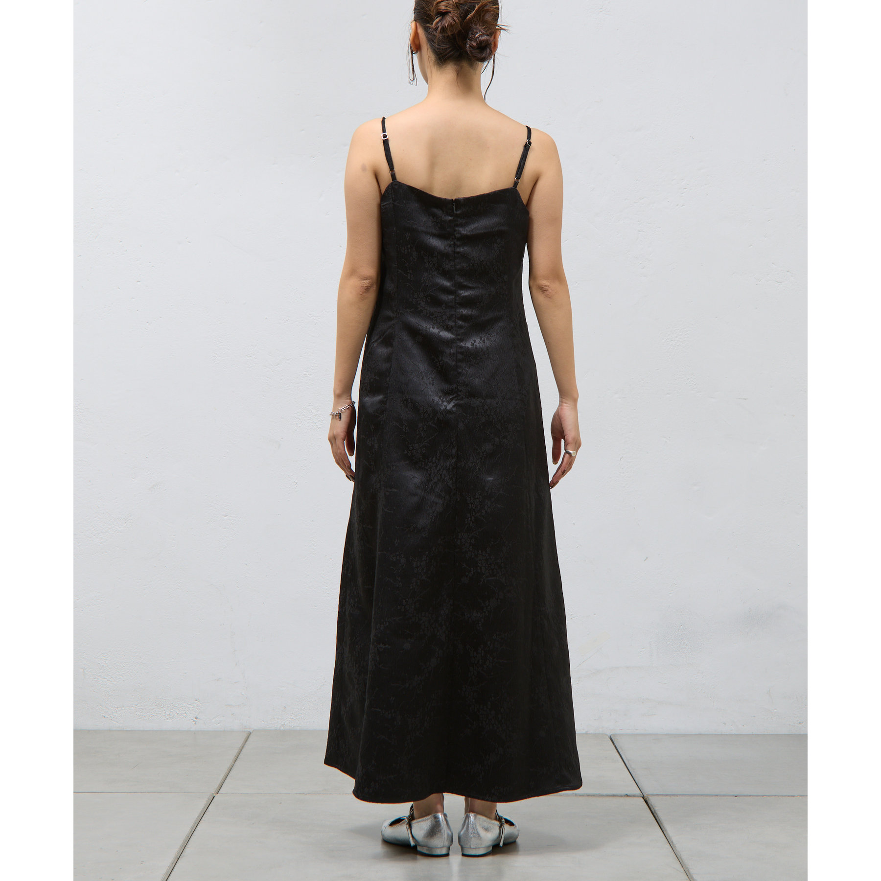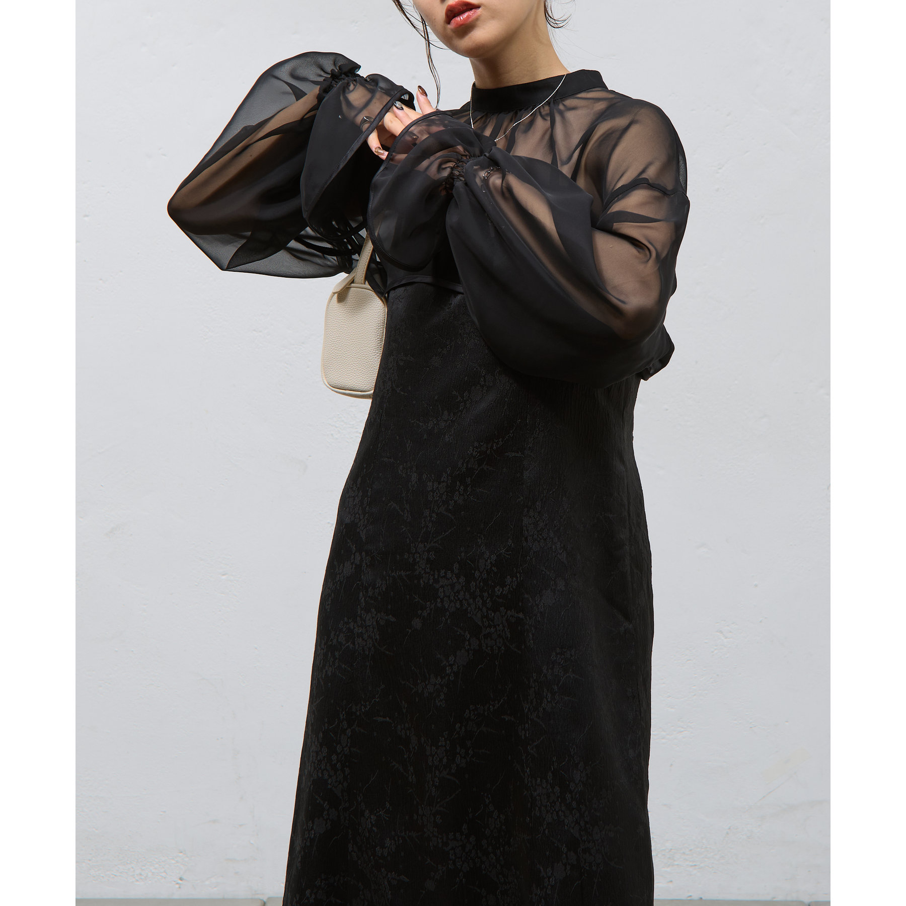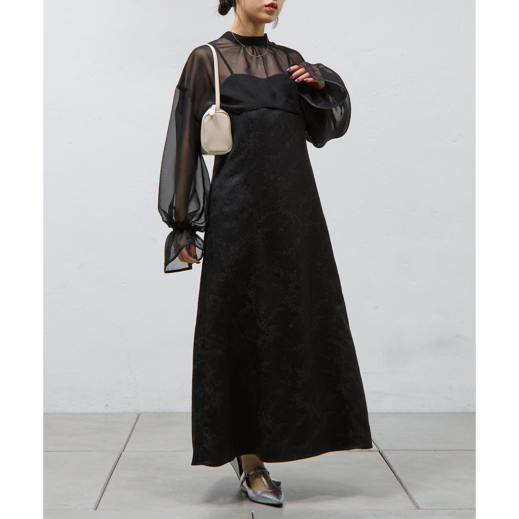ワンピースはジャガードで、揺れるたびさり気ない光沢感が高見え