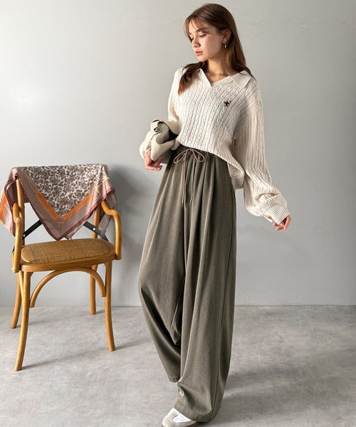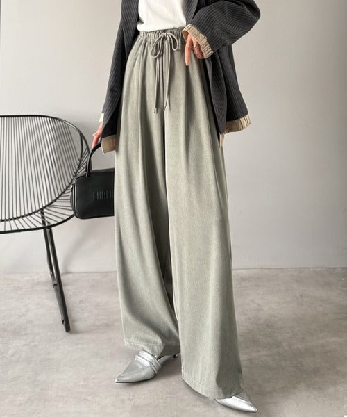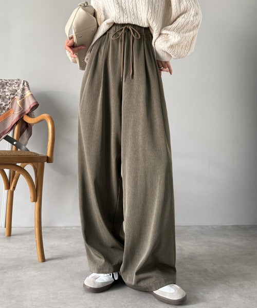 リラックス感たっぷりのワイドシルエットと総ゴムウエストで、履き心地は抜群。