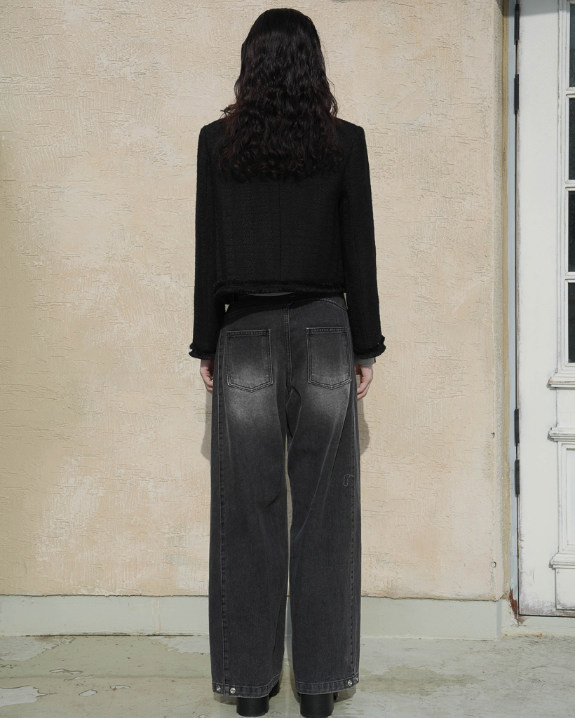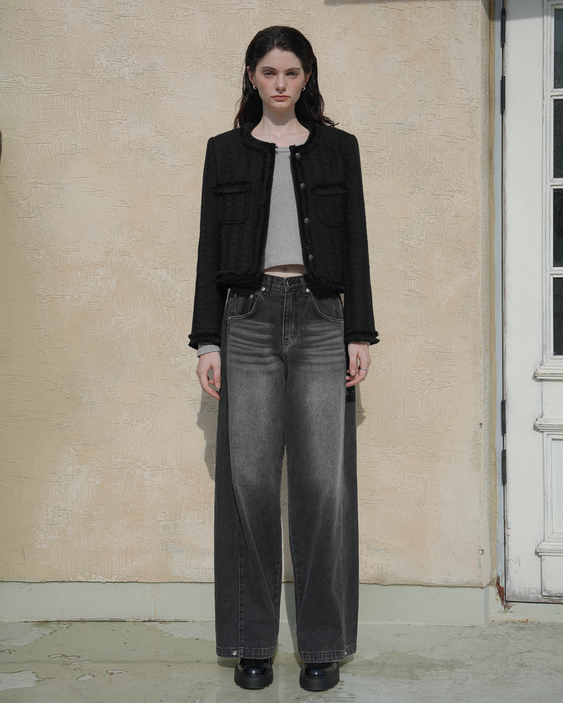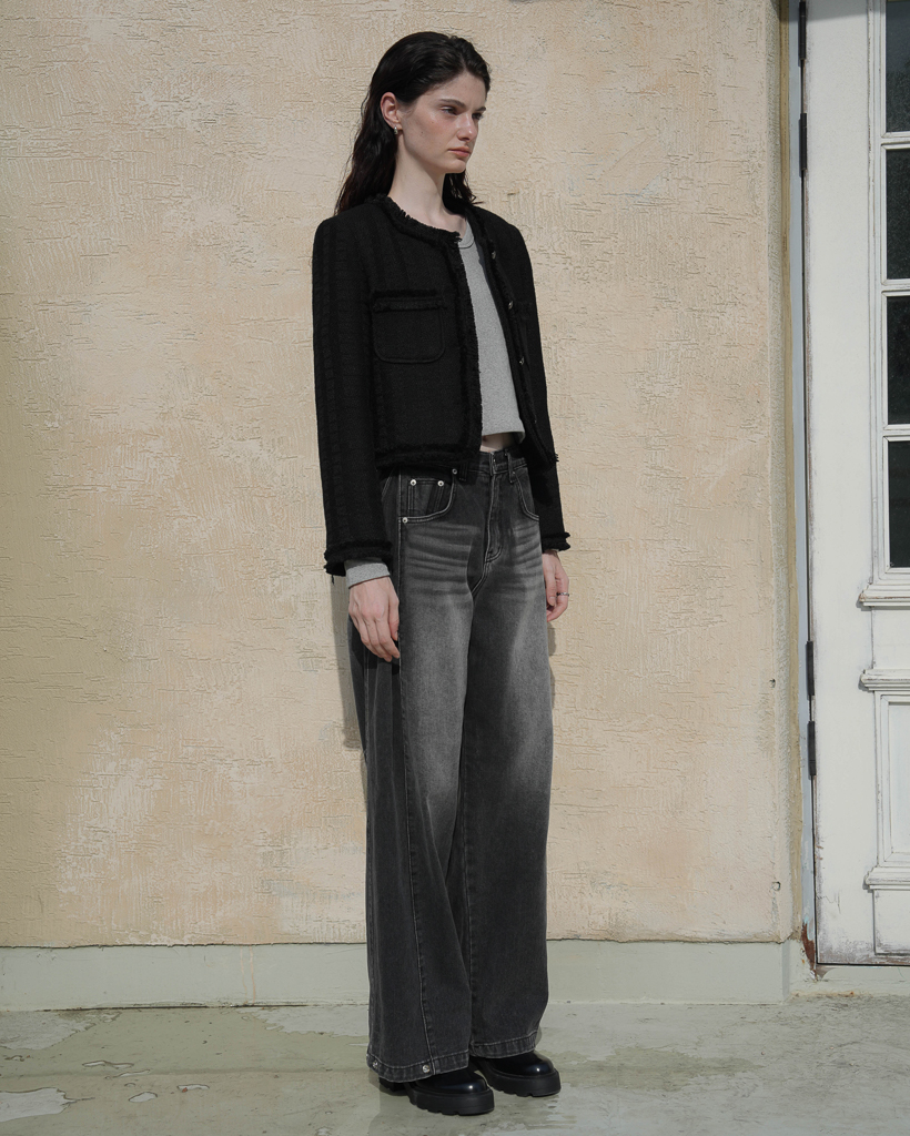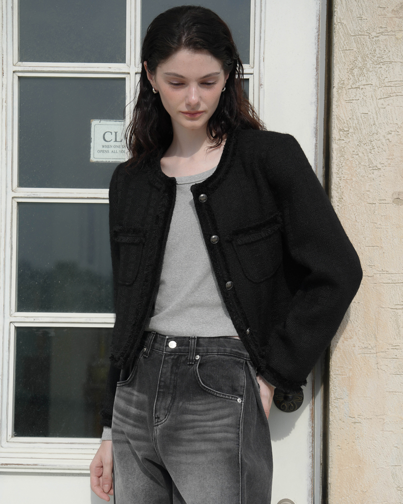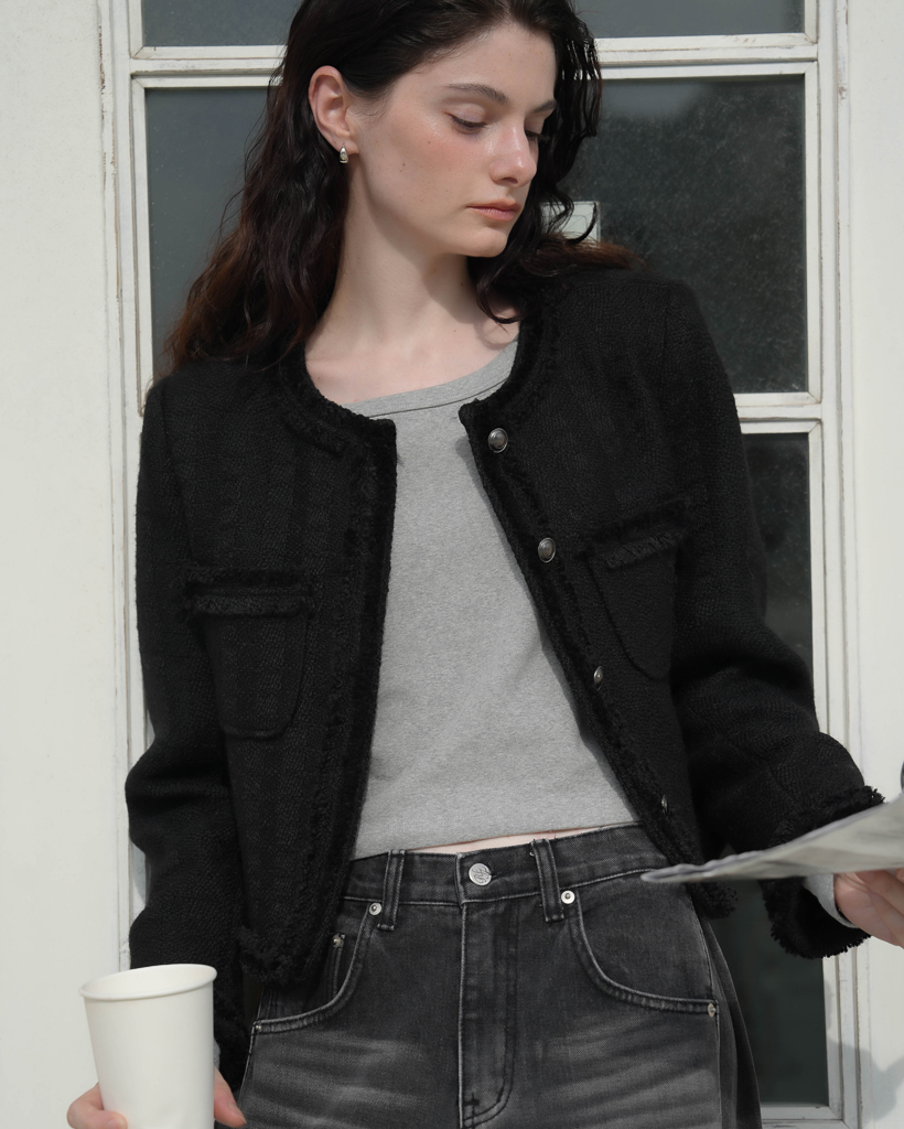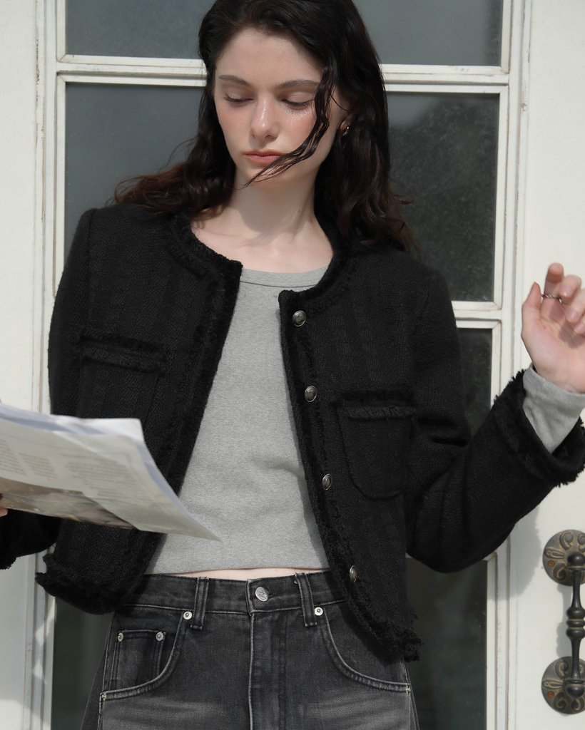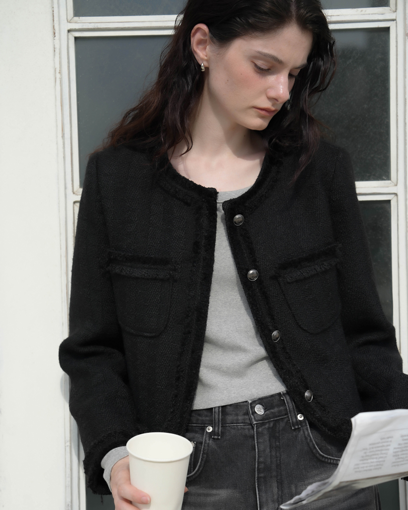 Fringe Trimming Tweed Jacket [Black]