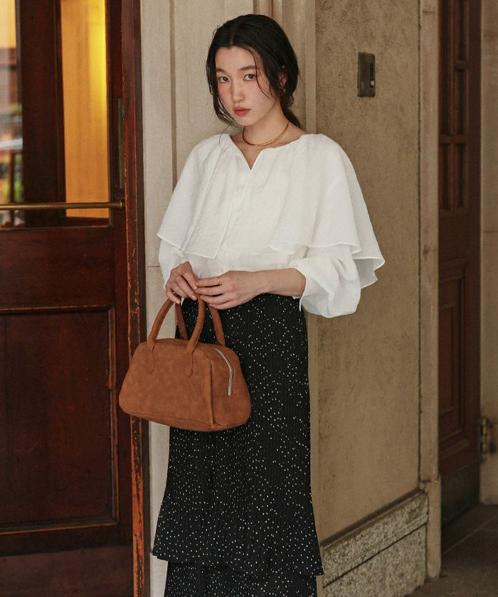 ・ほんのり表面感のある落ち感合繊素材で、動くシルエットも女性らしくかわいい1枚に