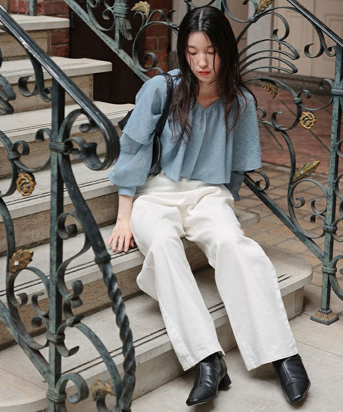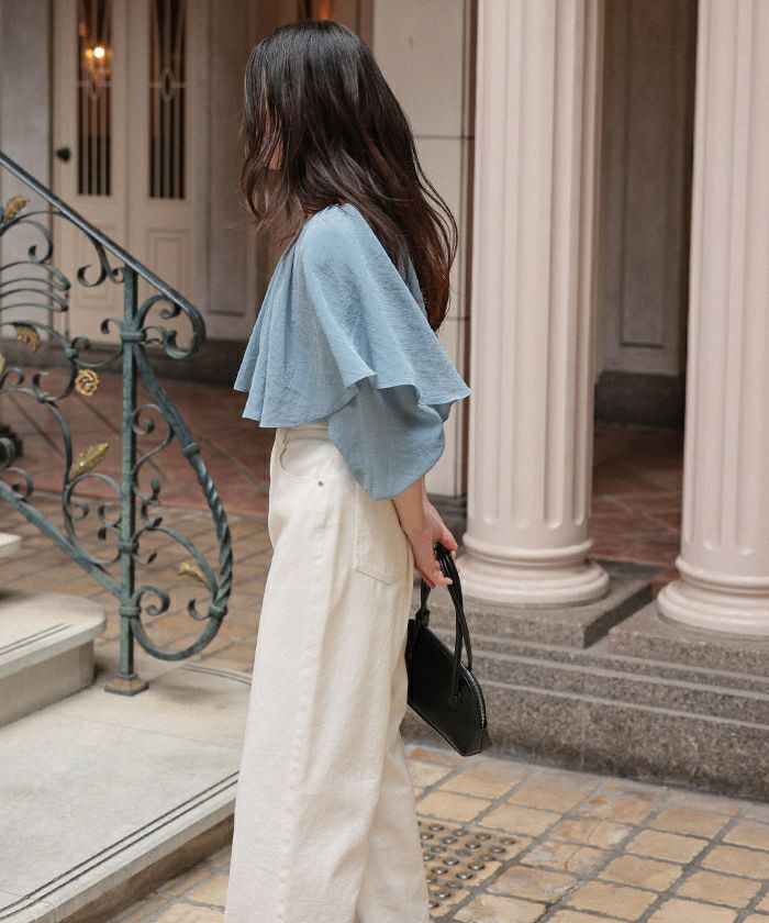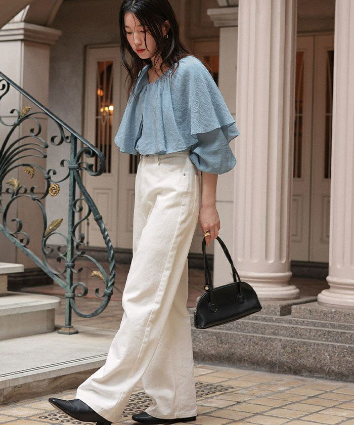 ・首元のフリルでインパクトはありつつVネックの襟ぐりラインなので、抜け感もありすっきりとした印象に