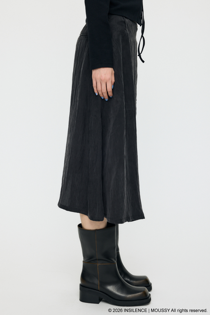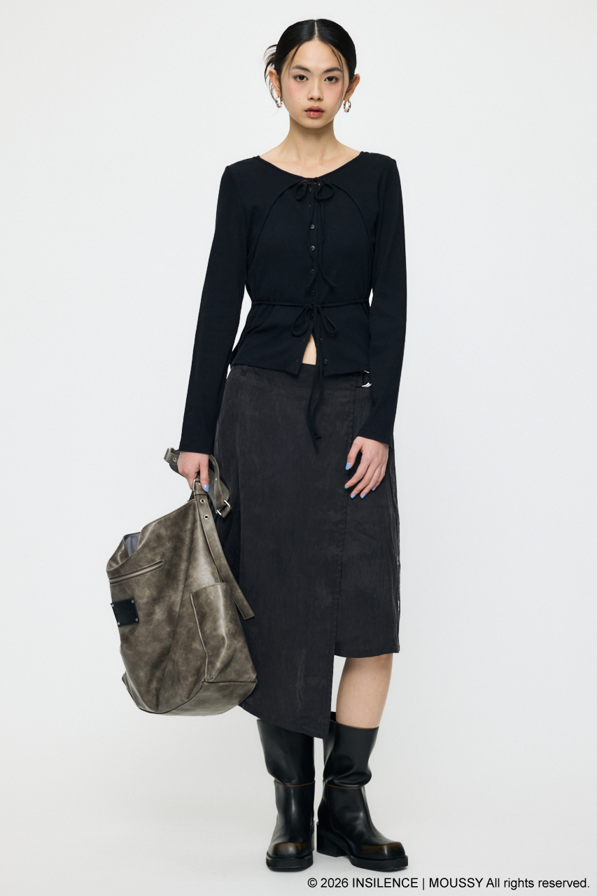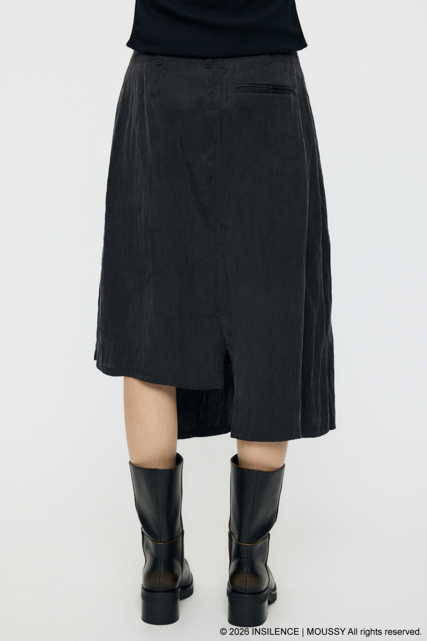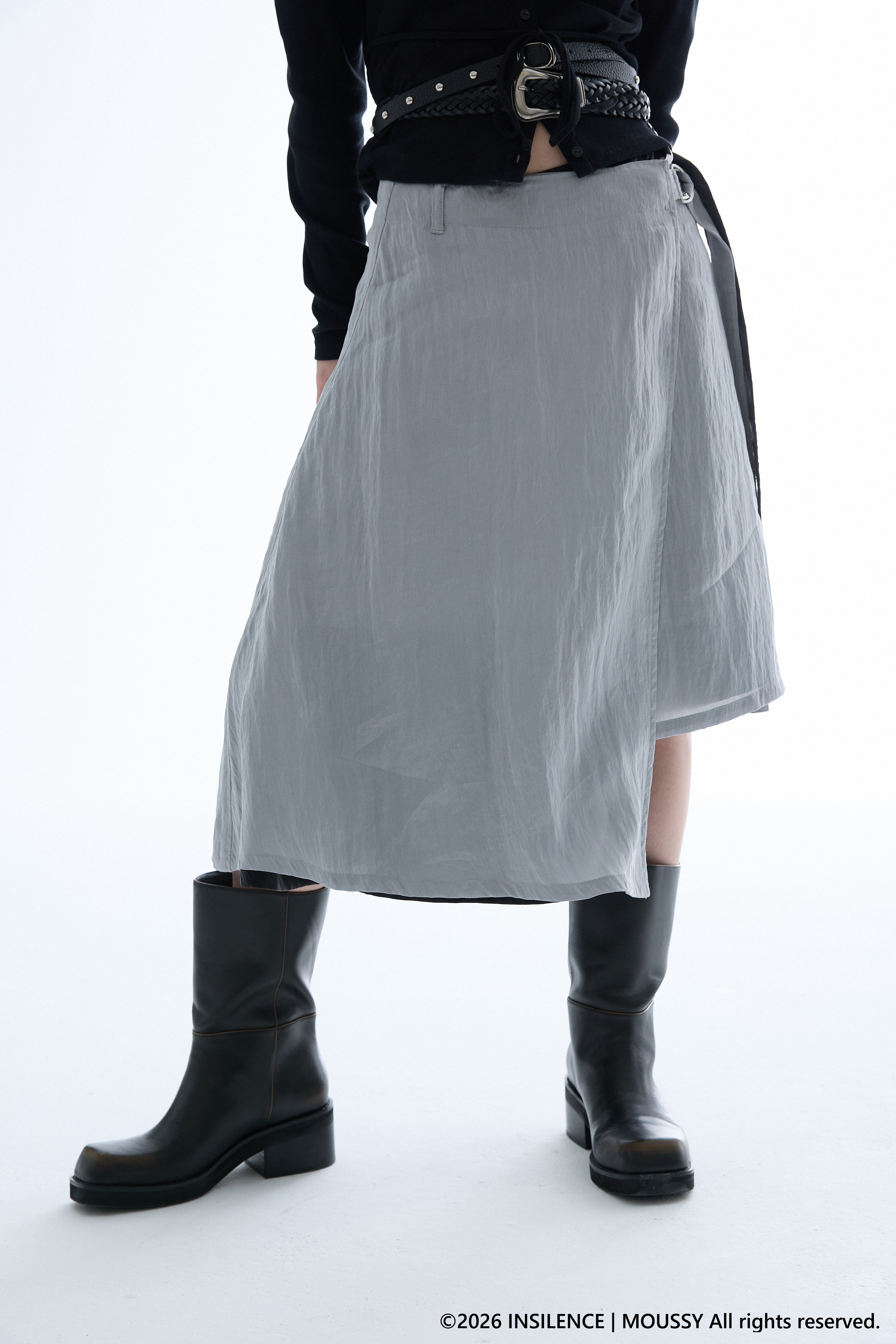 INSILENCEとのコラボレーションで完成した、アシンメトリーな表情が際立つベルト付きラップスカート。