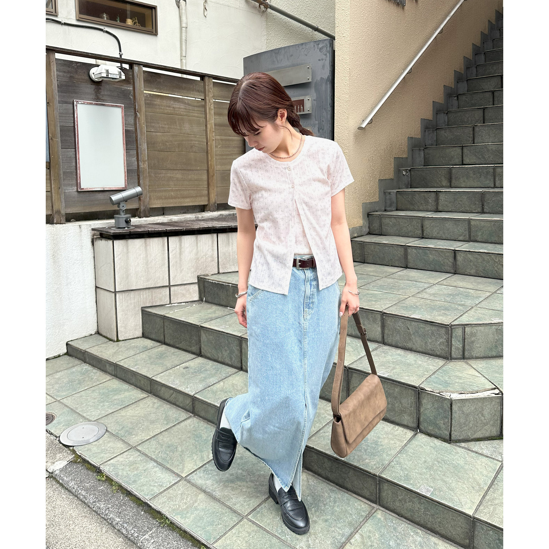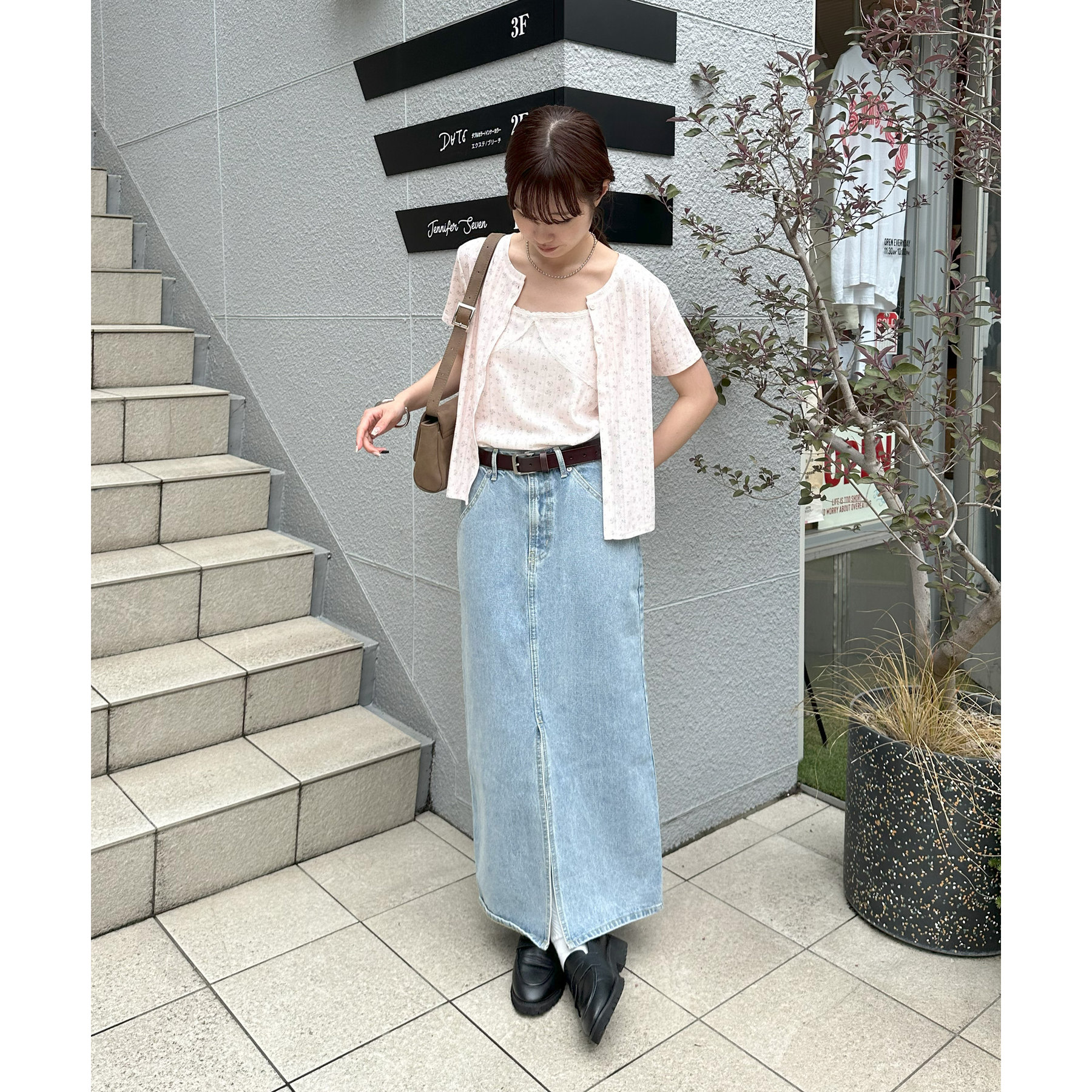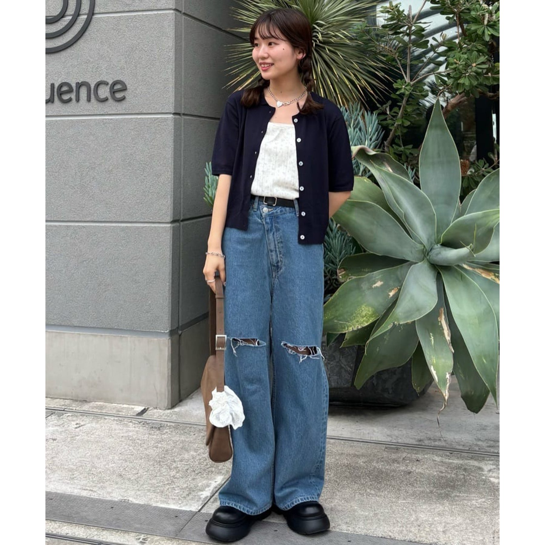 カーディガンはあえて2つボタンのデザインで、こなれた雰囲気をプラスしてくれます。