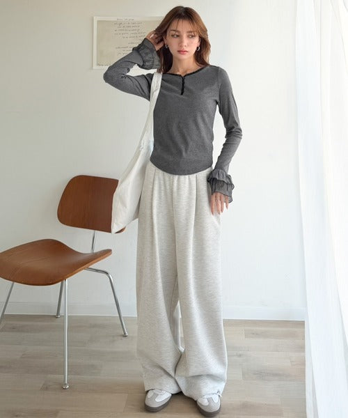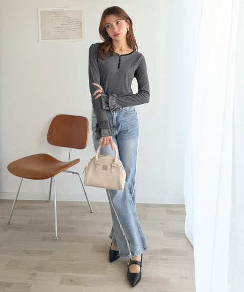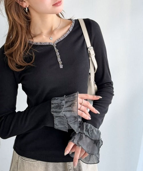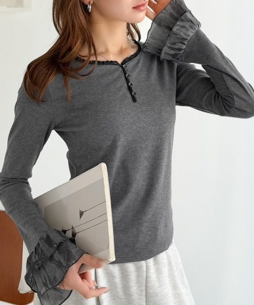 【mily bilet】大人フェミニンを叶える。袖フリルレースヘンリーネックトップス mi1359050