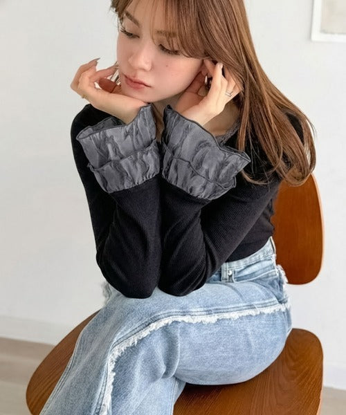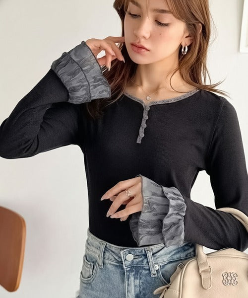 袖口のエンボス加工フリルとレースが上品に映えるインナートップス。
