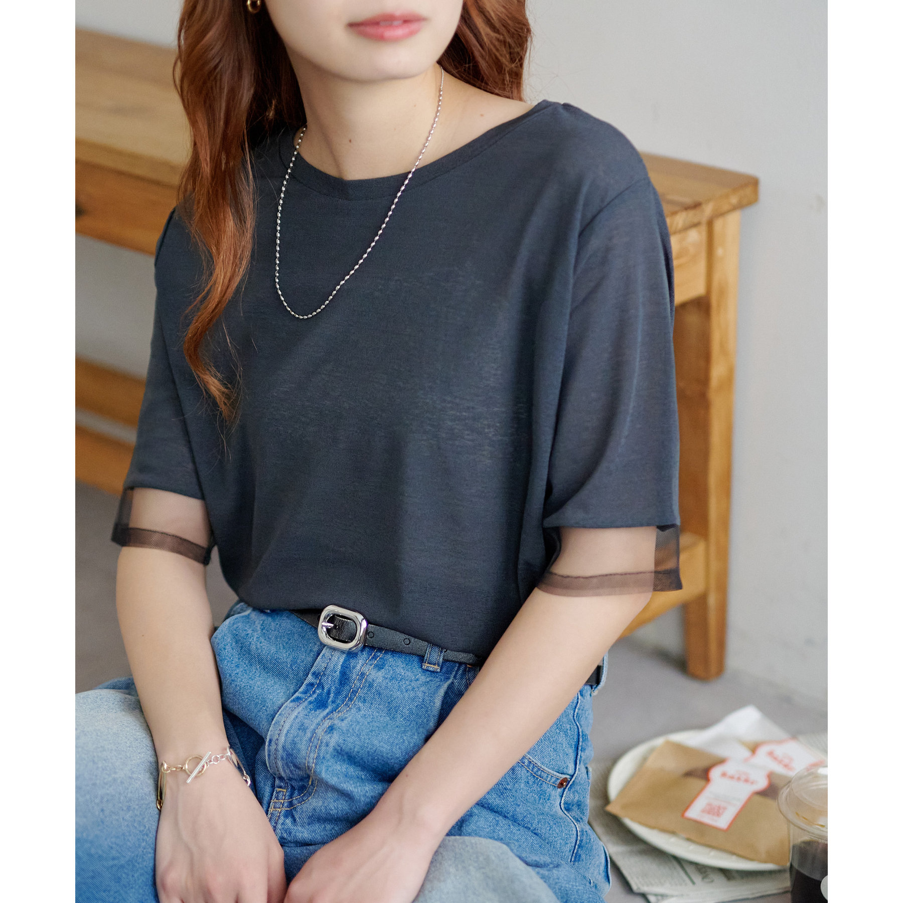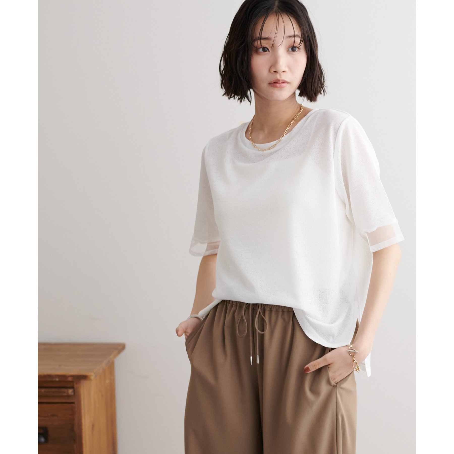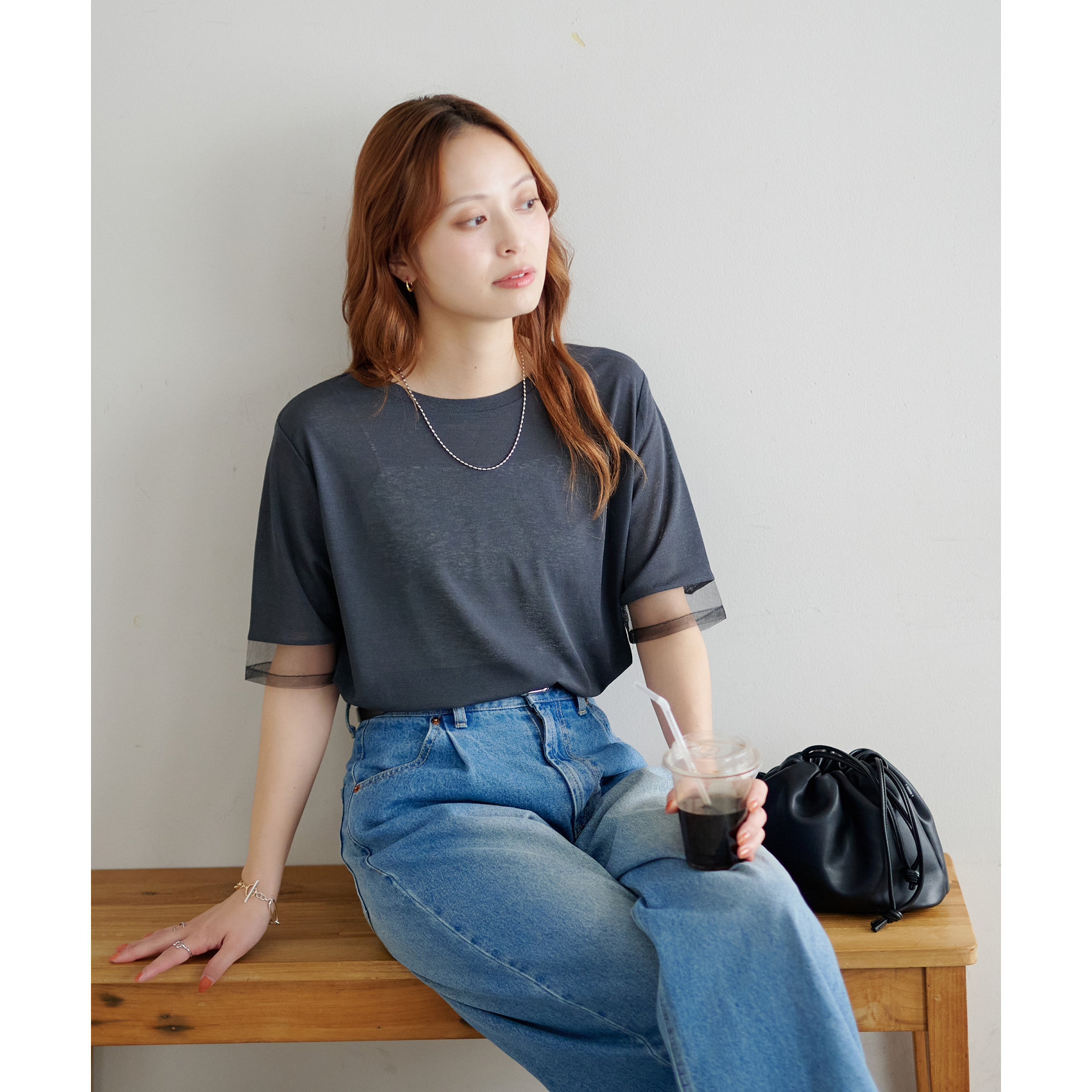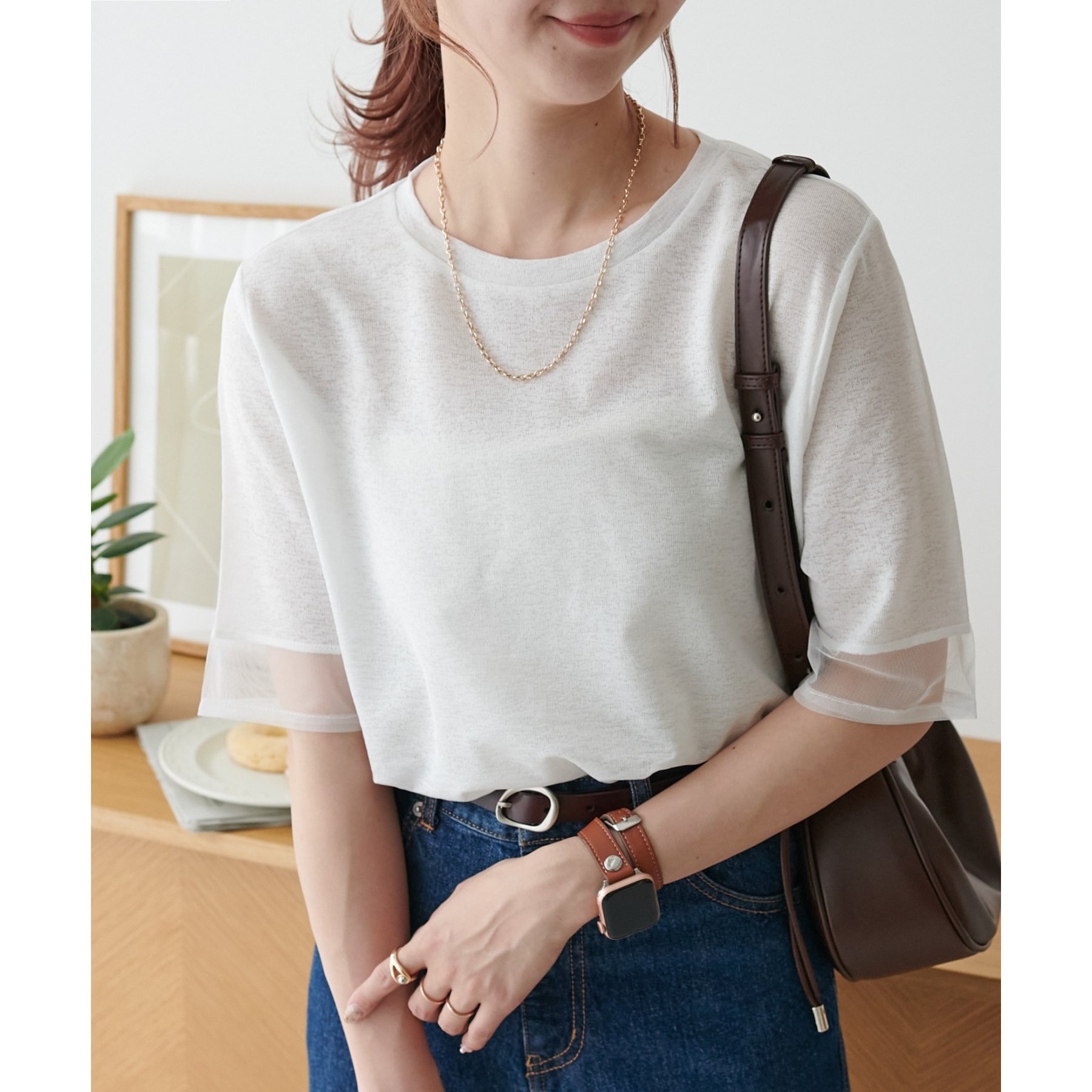 155cmスタッフ:シンプルだけど一枚でおしゃれに見える、袖の切替えデザインが魅力です。袖がシアーなので見た目も涼しく、春夏にぴったり!