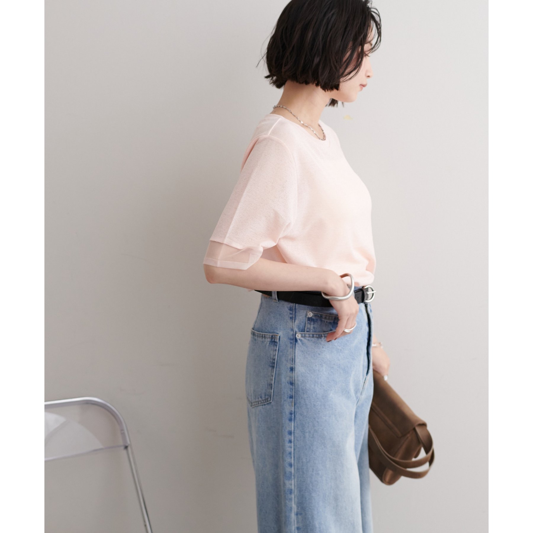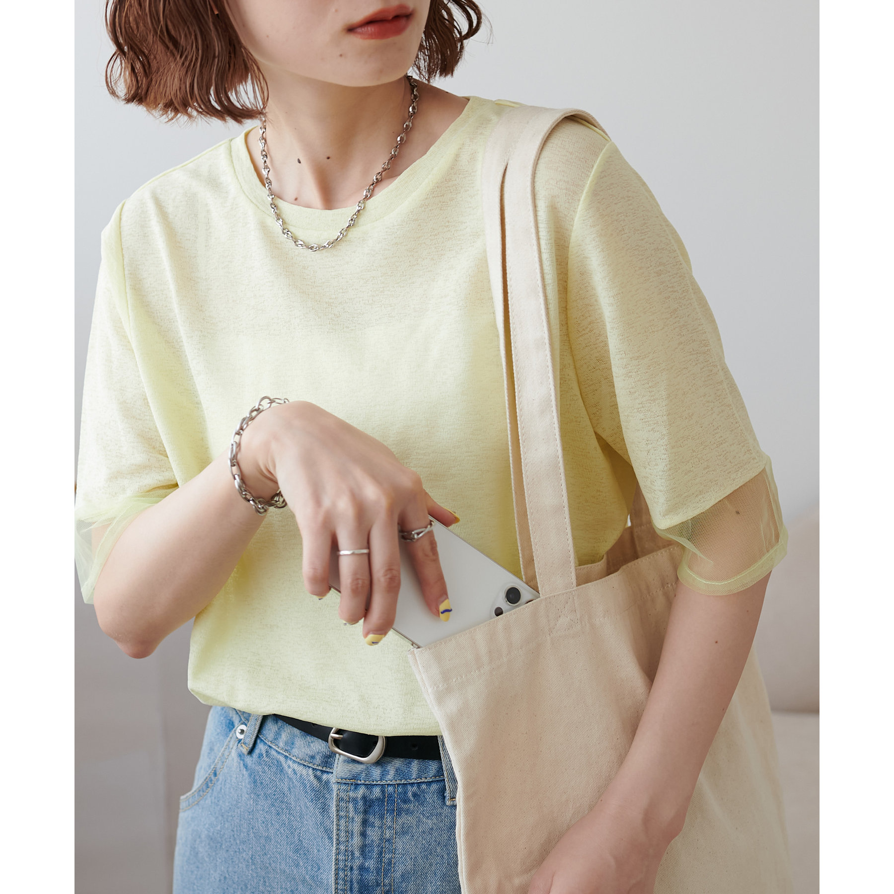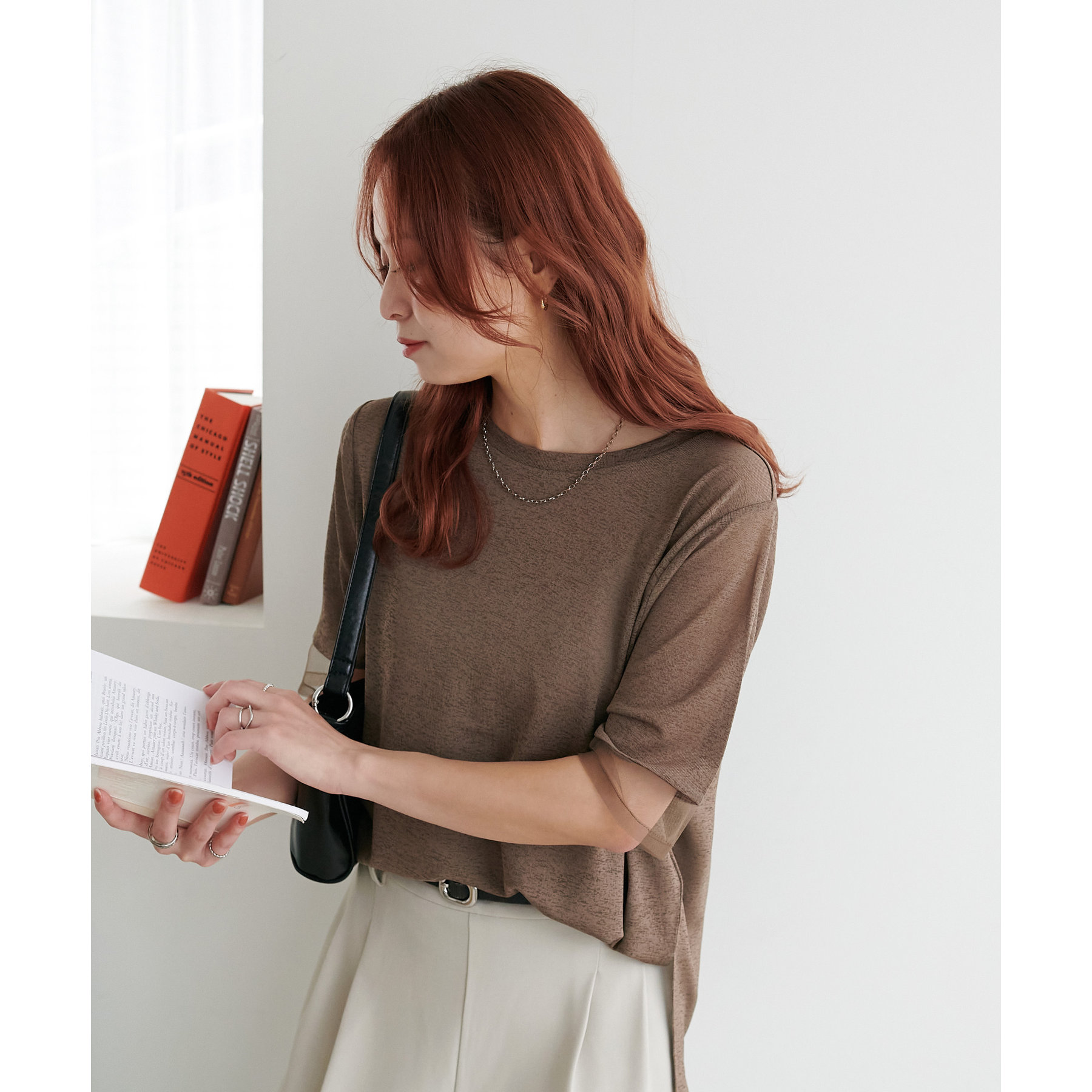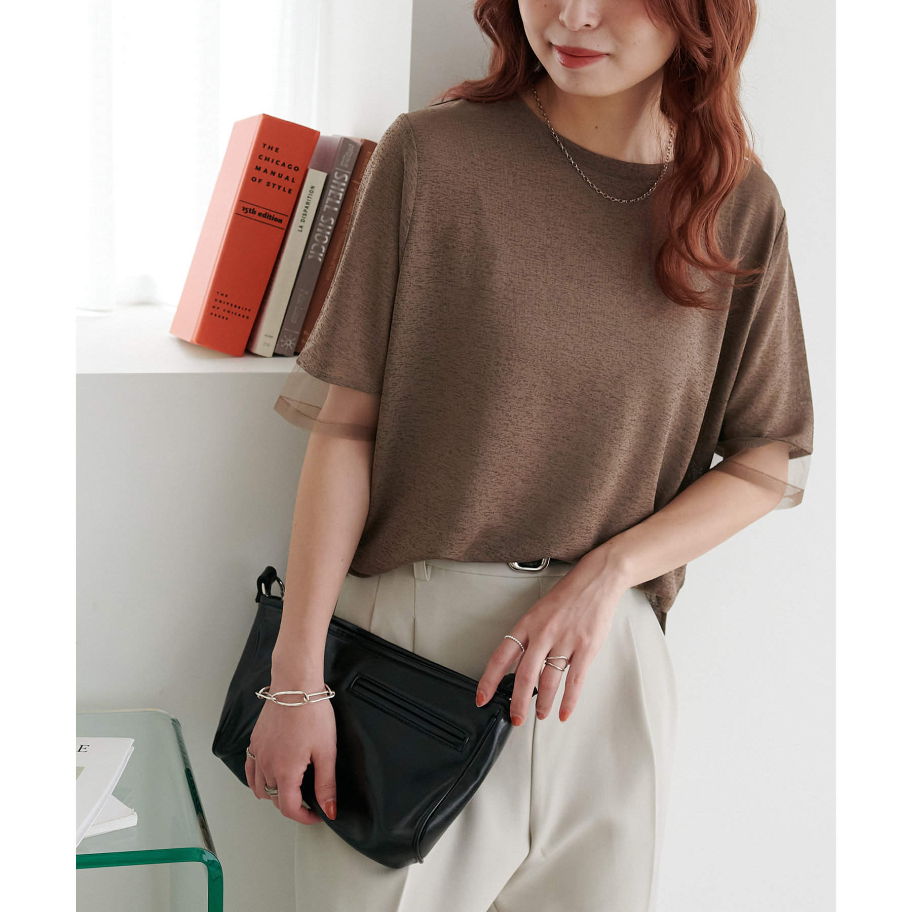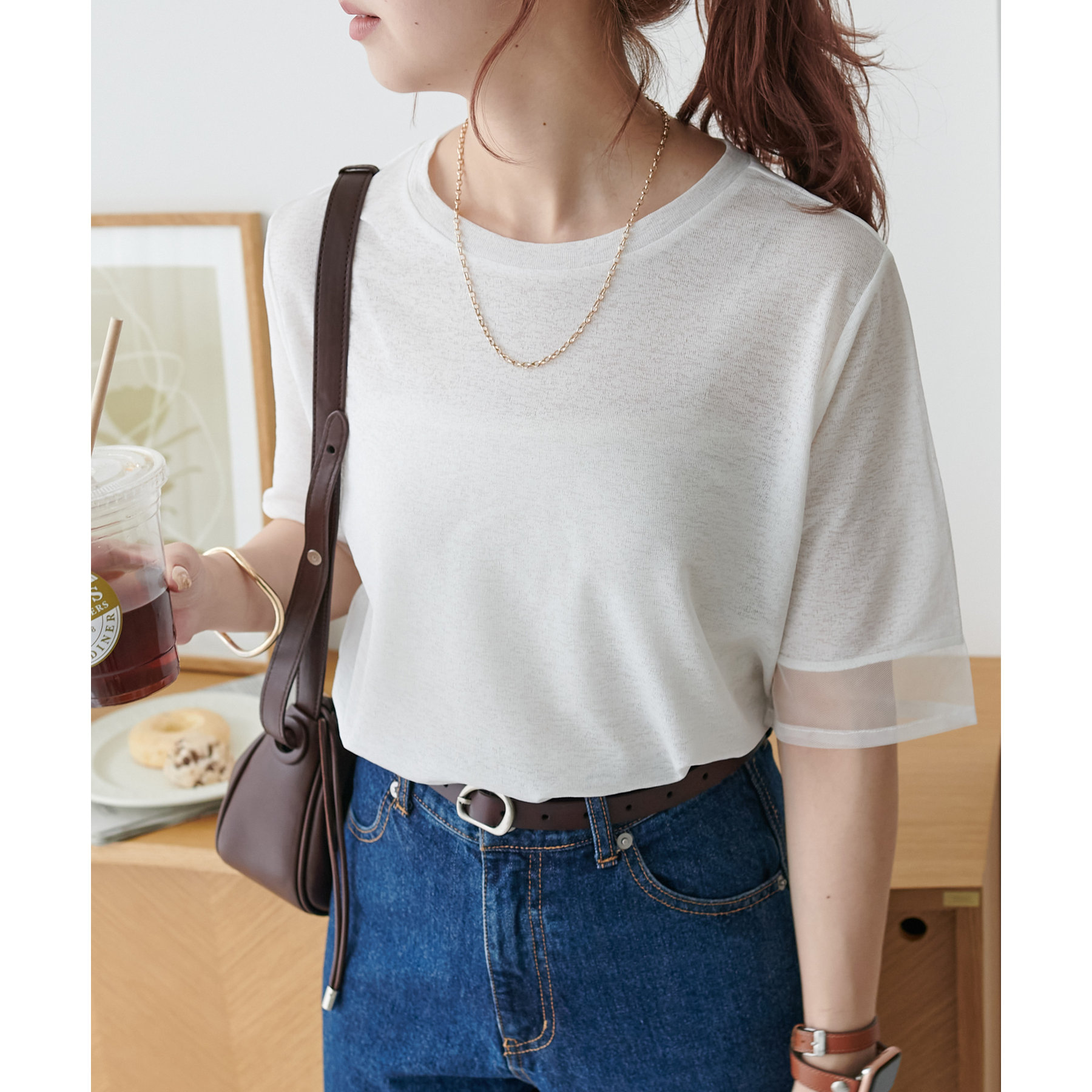 155cmスタッフ:シンプルだけど一枚でおしゃれに見える、袖の切替えデザインが魅力です。袖がシアーなので見た目も涼しく、春夏にぴったり!