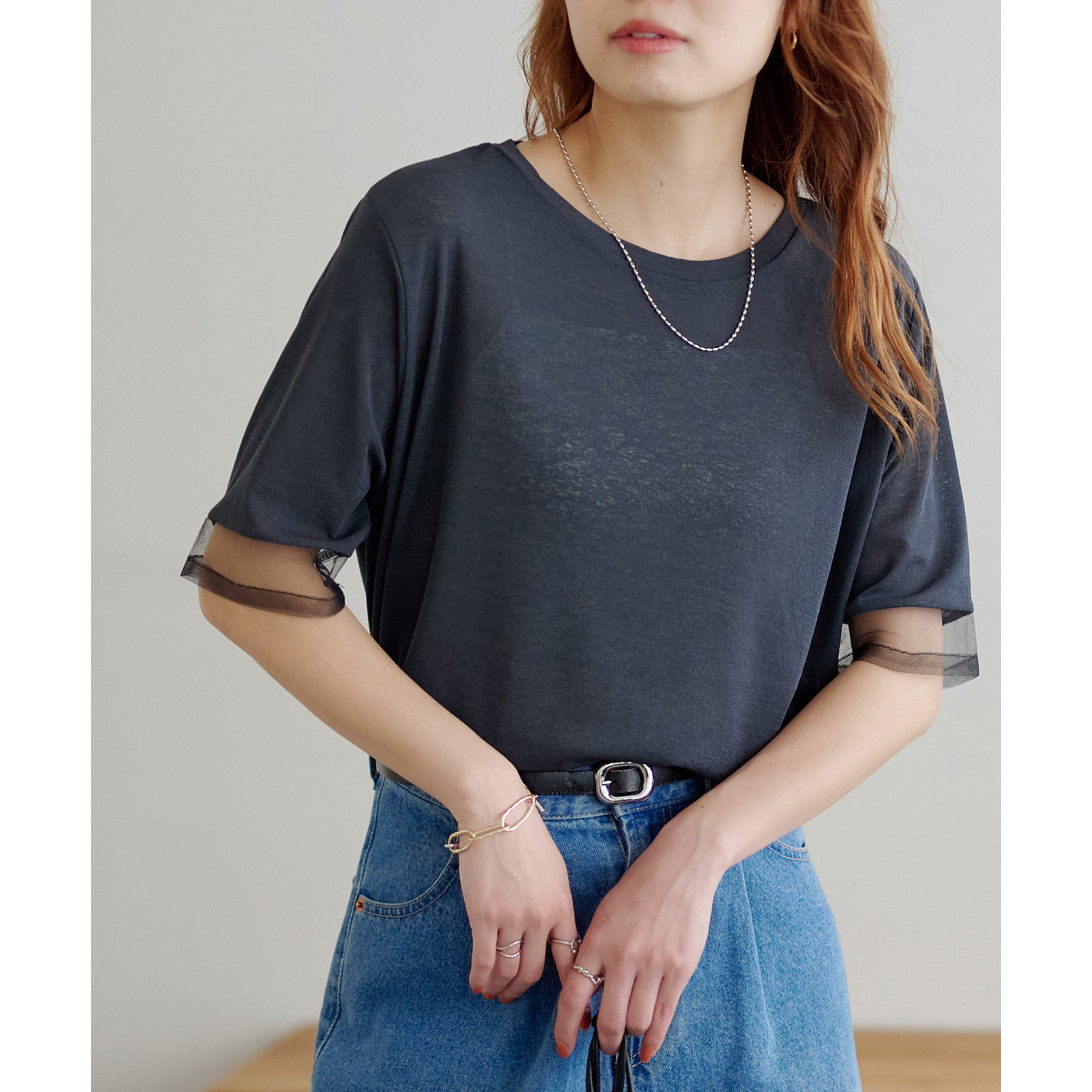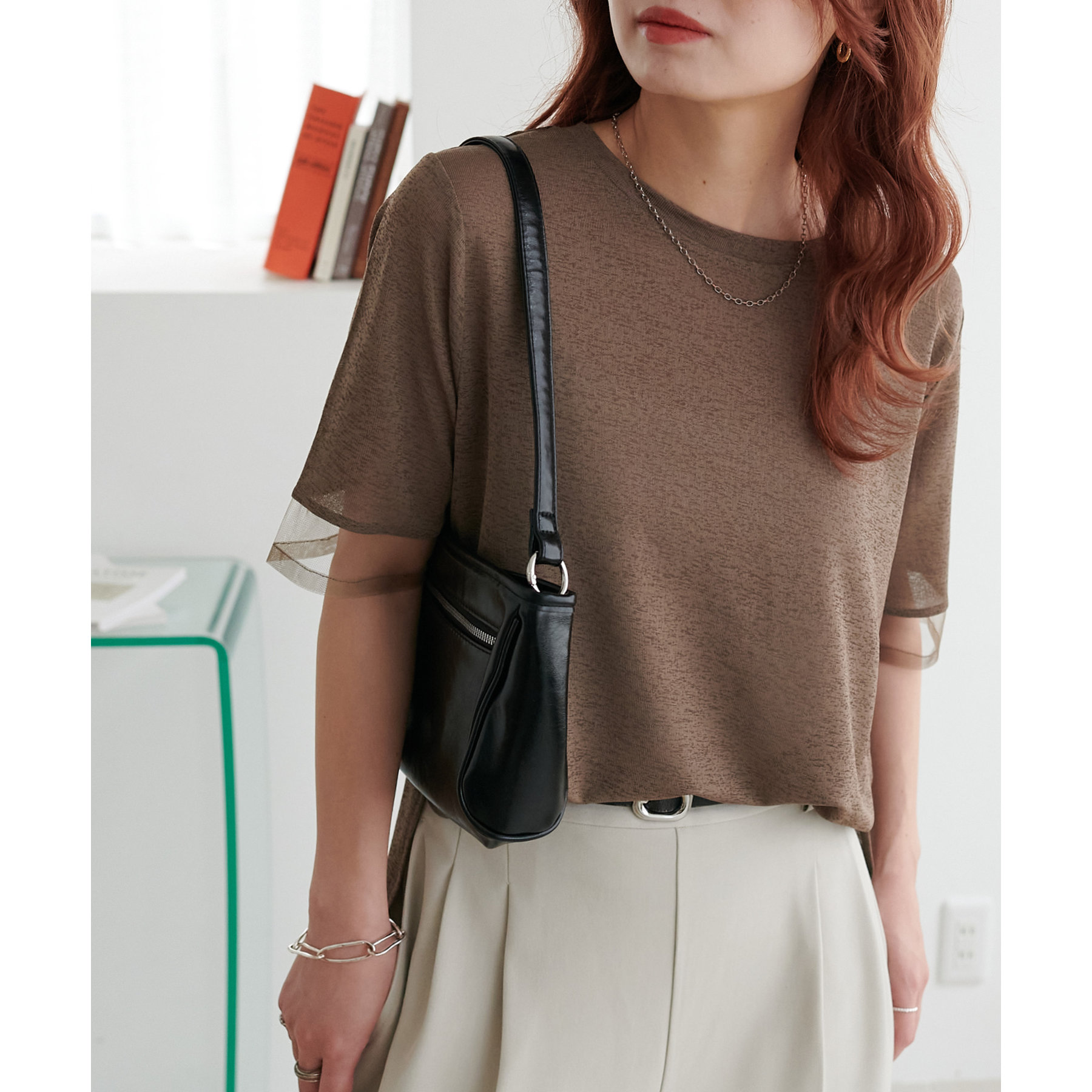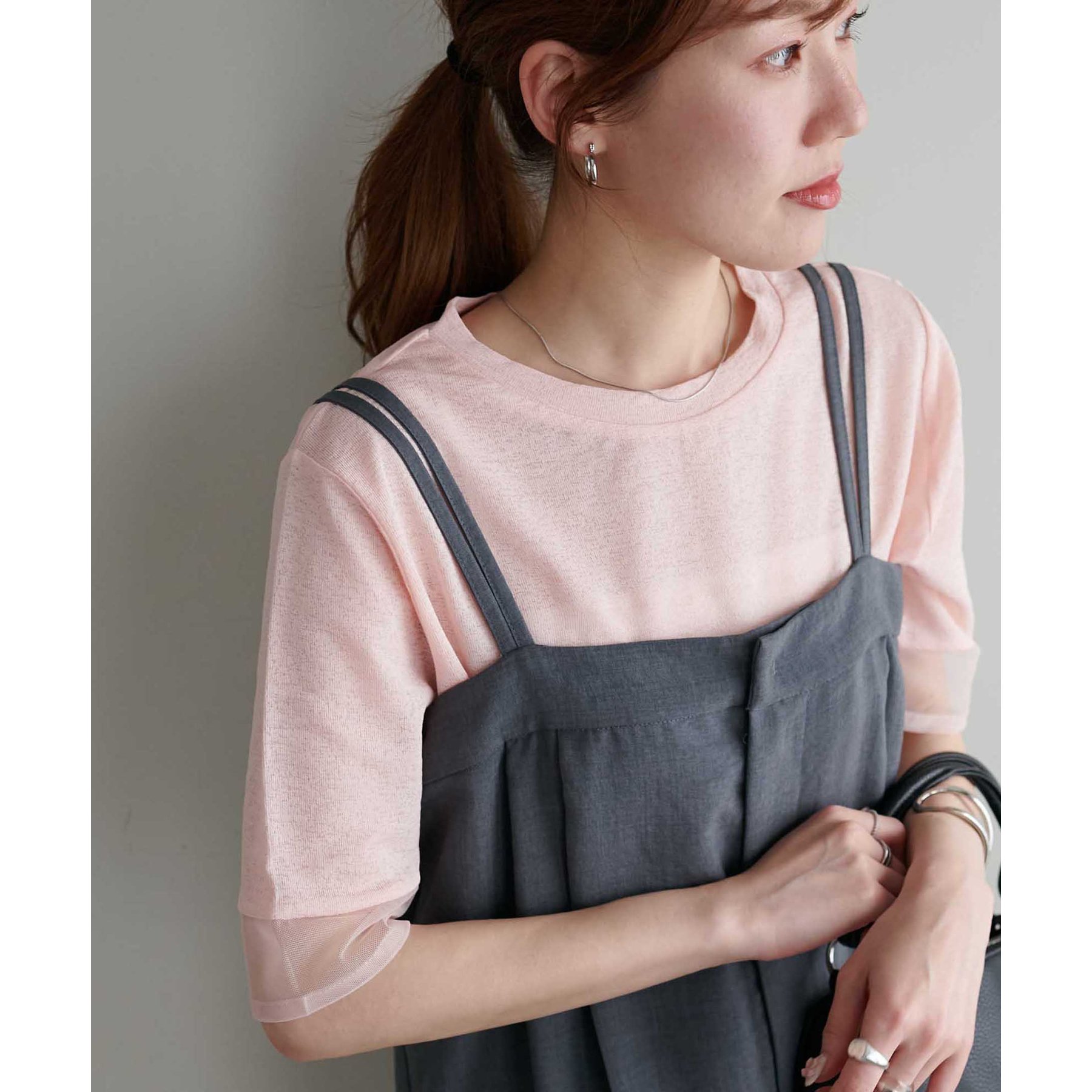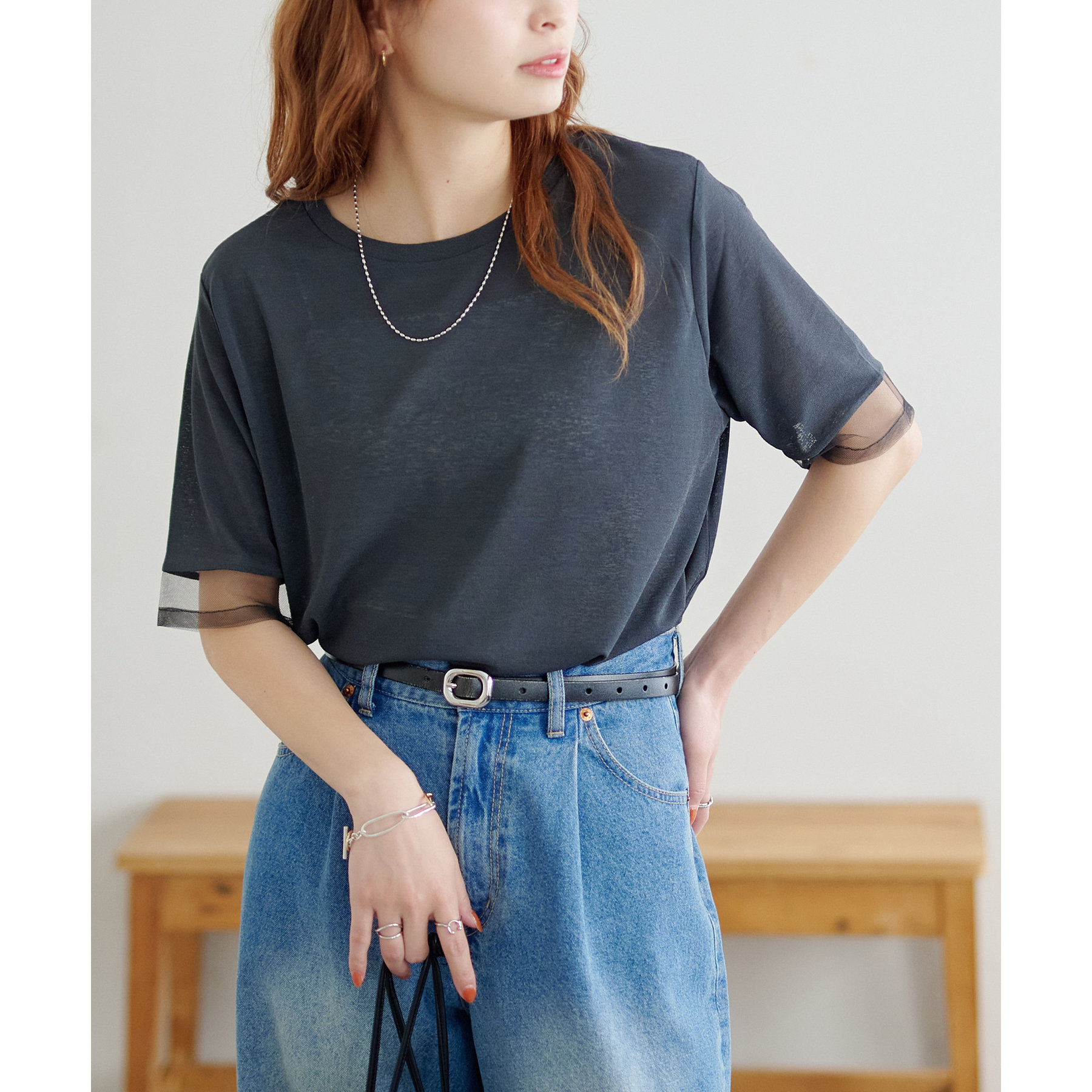 155cmスタッフ:シンプルだけど一枚でおしゃれに見える、袖の切替えデザインが魅力です。袖がシアーなので見た目も涼しく、春夏にぴったり!