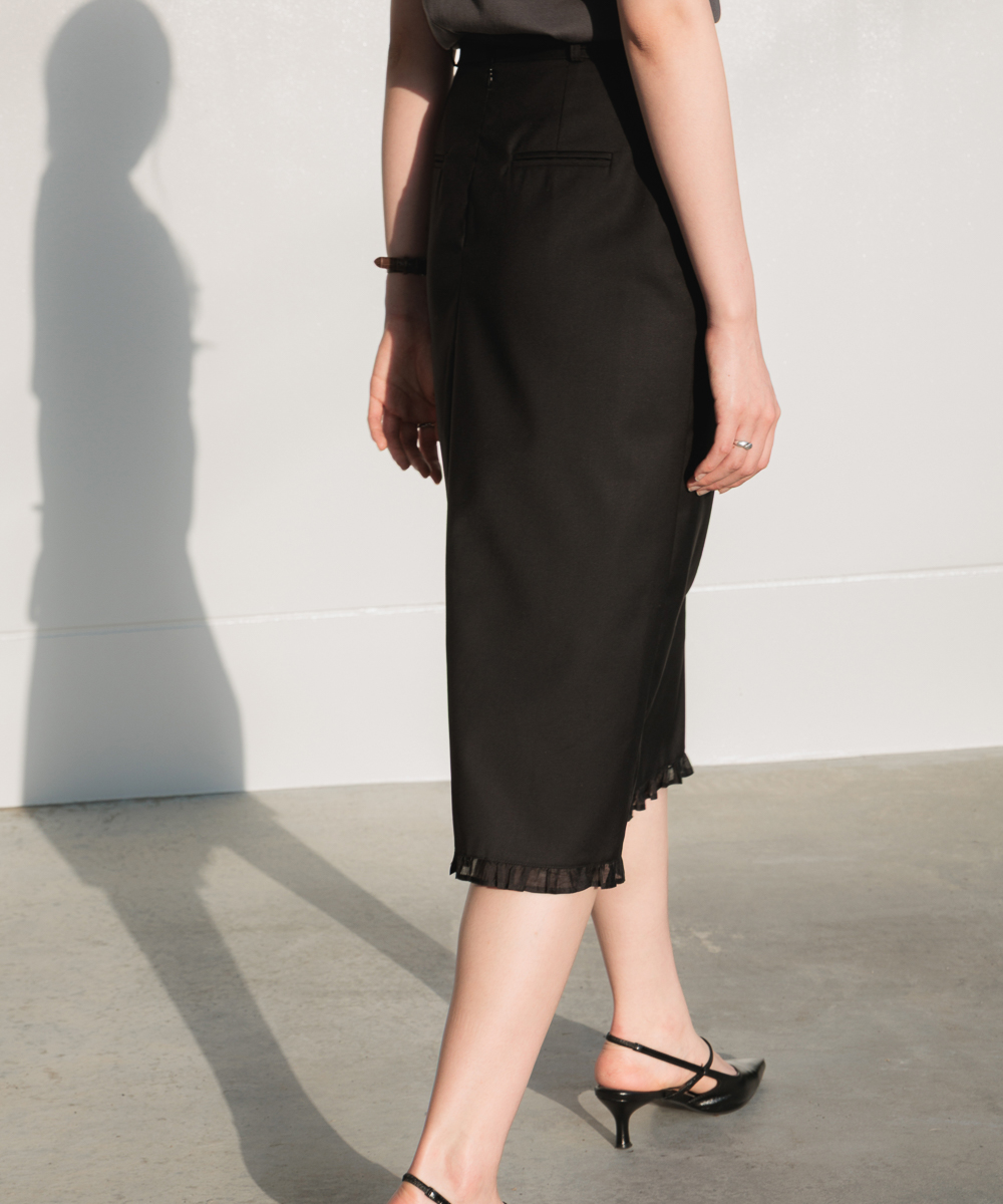 裾にはシフォン素材の繊細なラッフルディテールを加え、動くたびにほのかに揺れるフェミニンなムードを演出します。