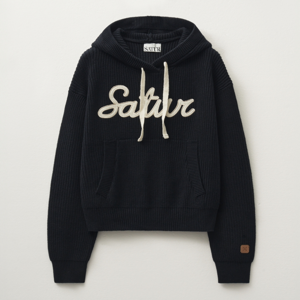 (W) Applique Logo Cashmere Blend Hood Knit - Classic Black