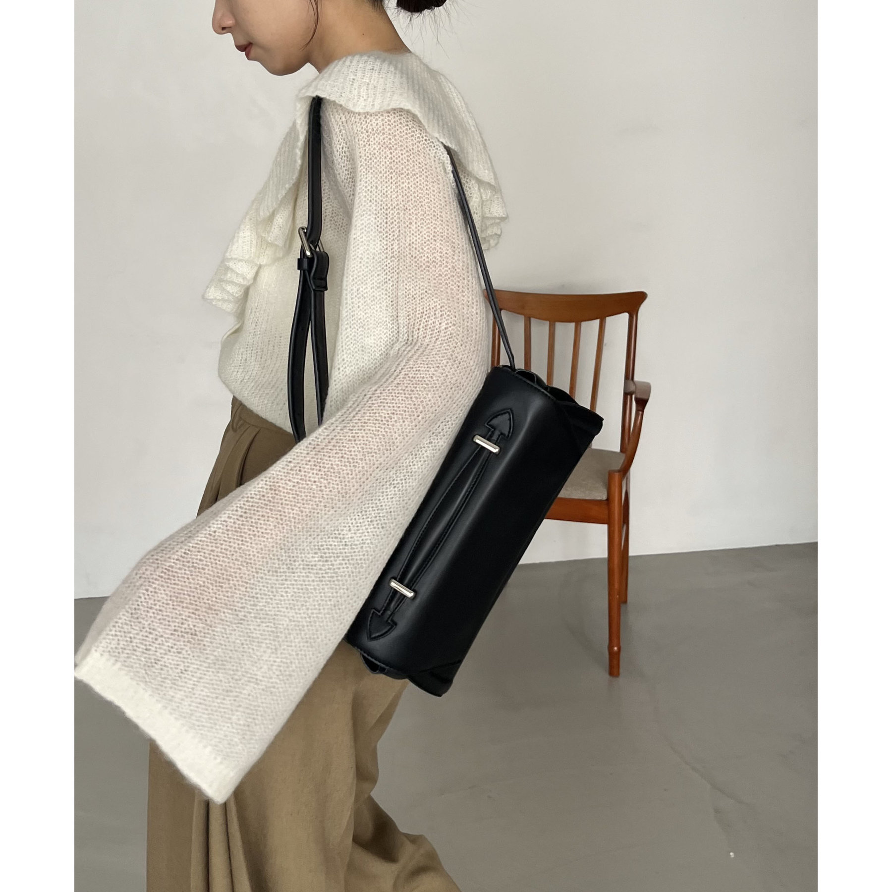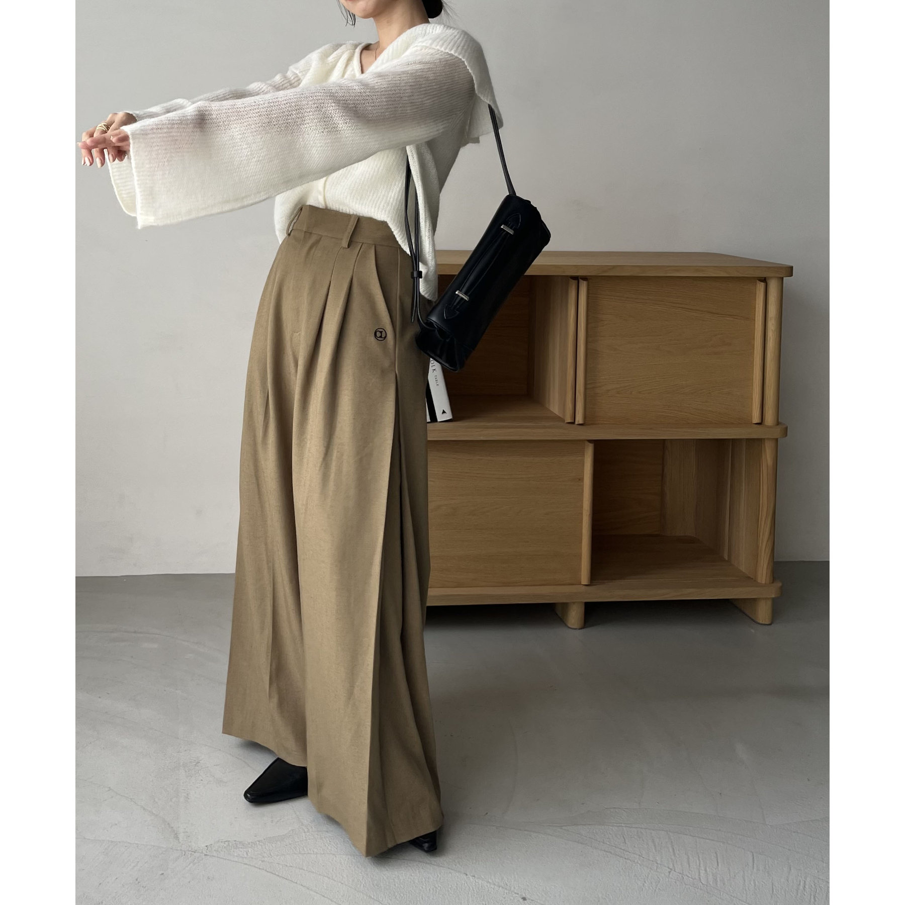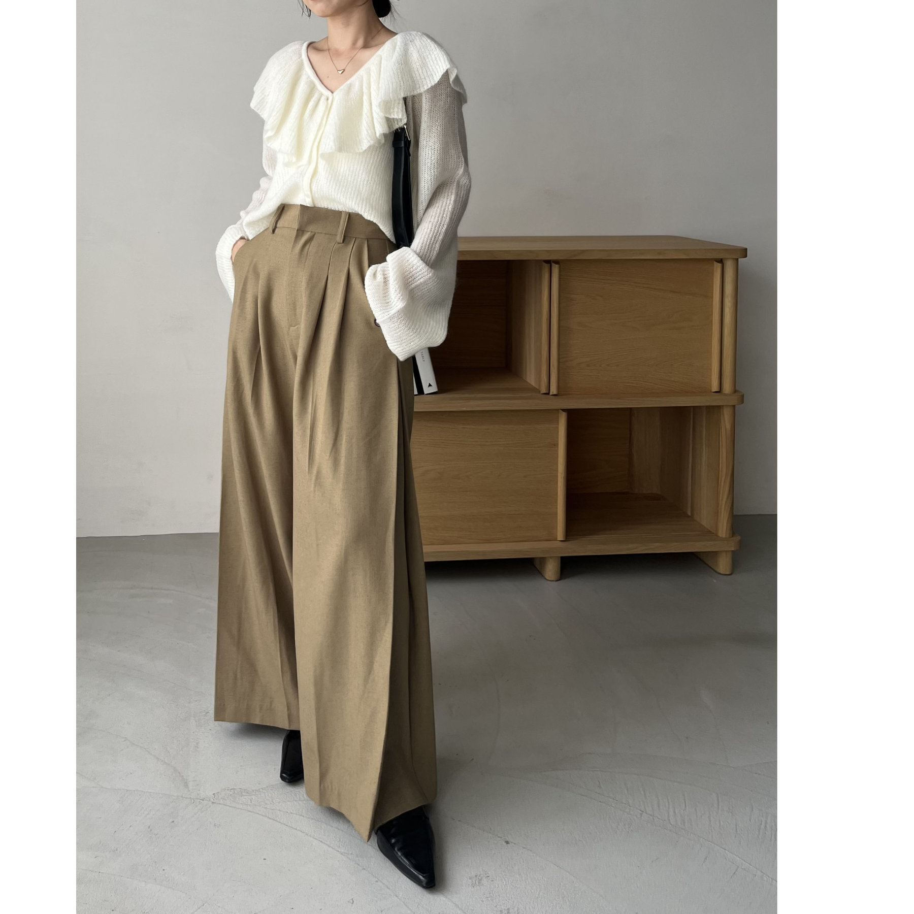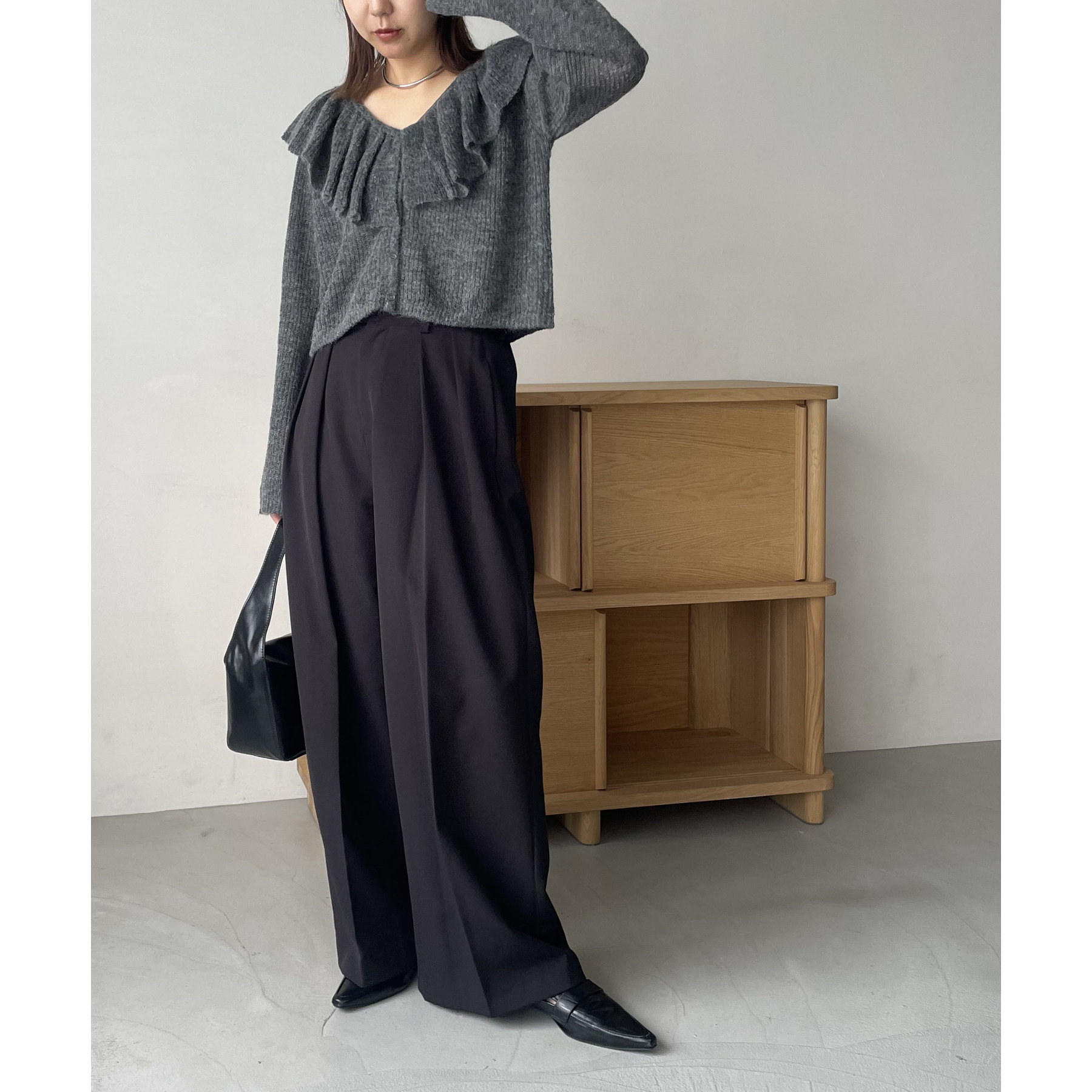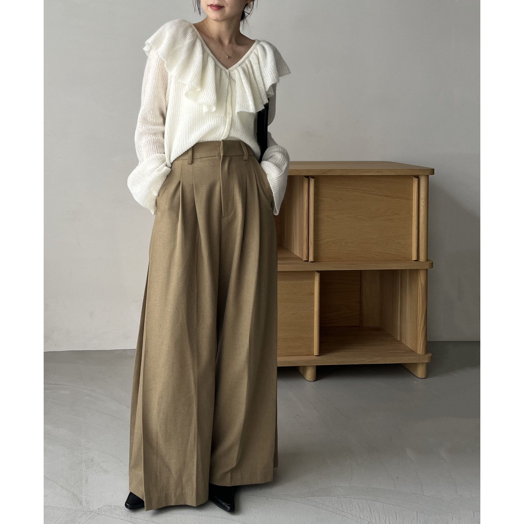 ・スラックスで甘さを抑えた大人なスタイリングに