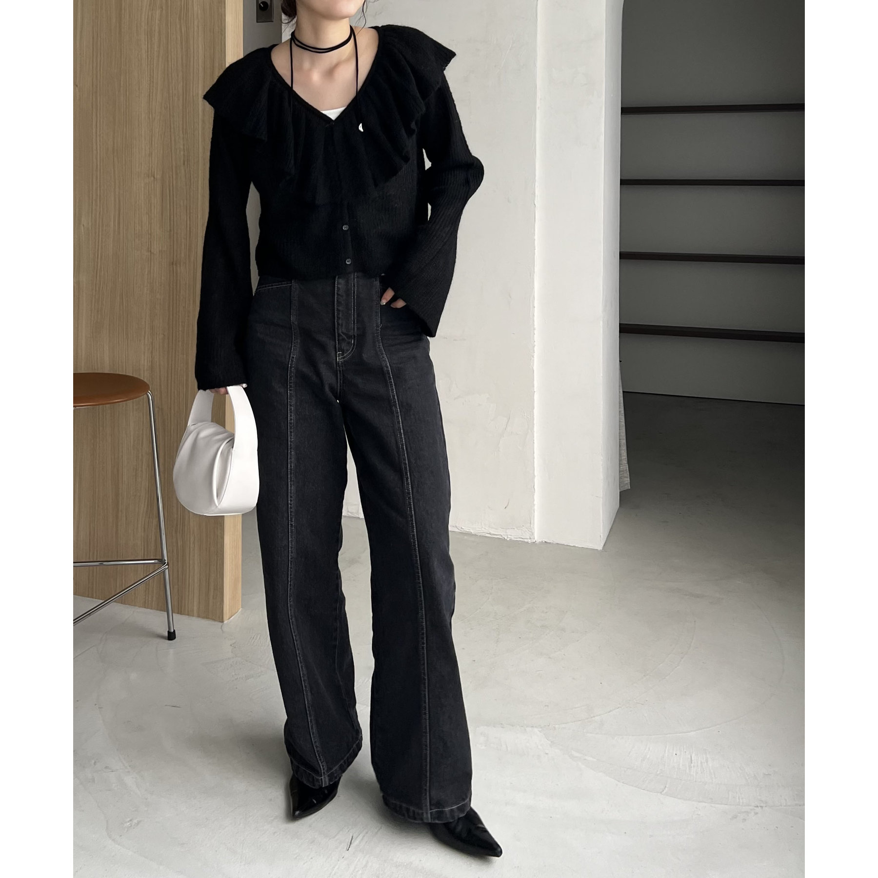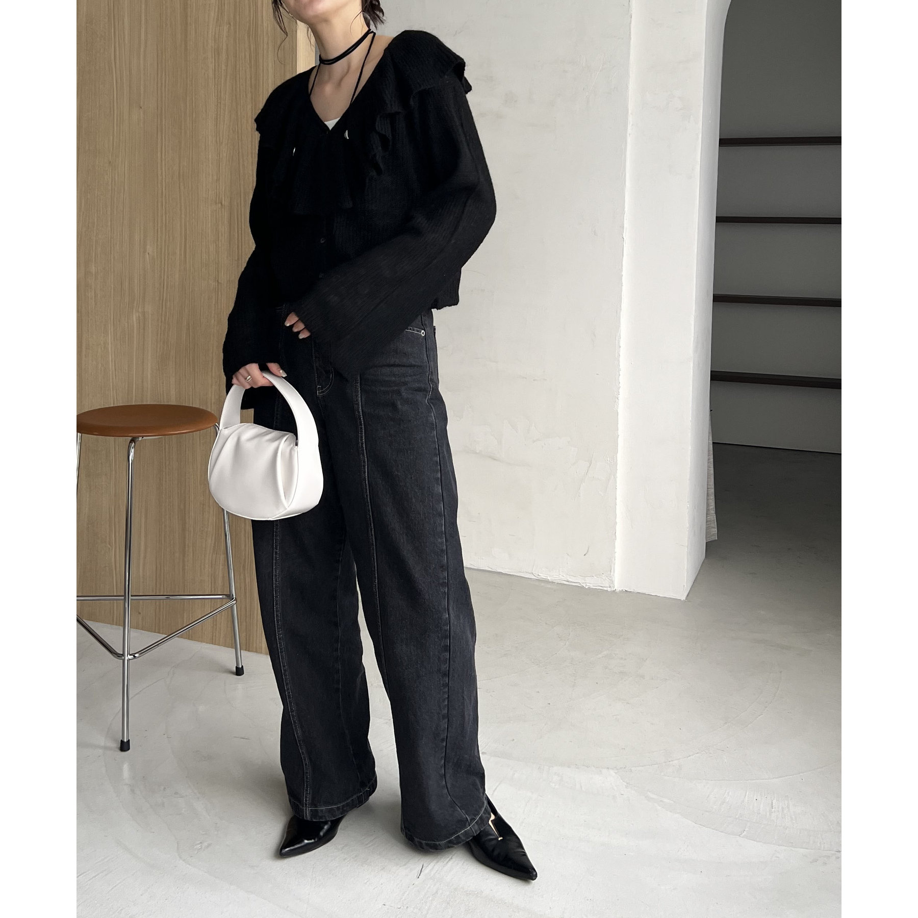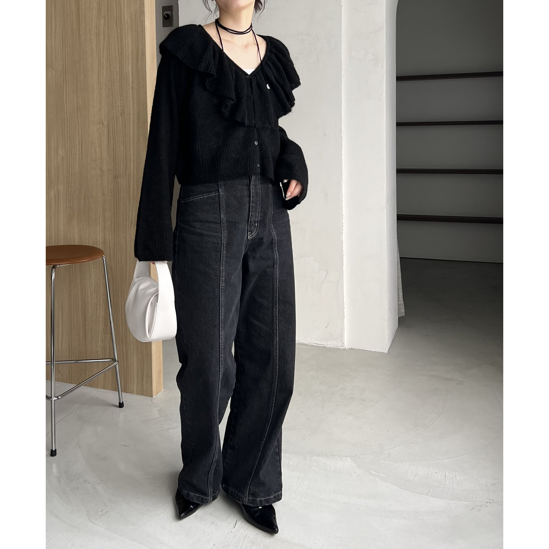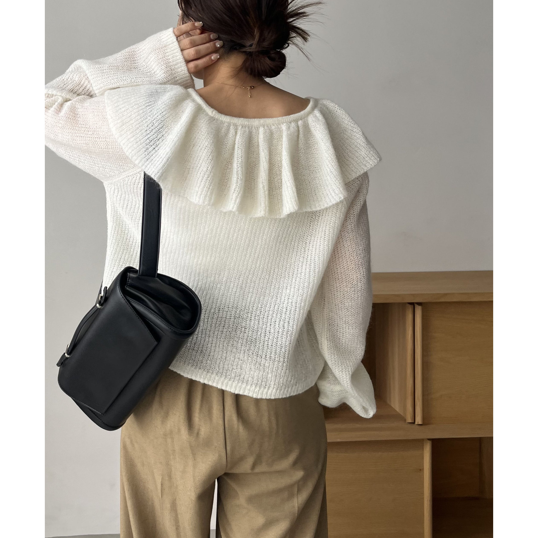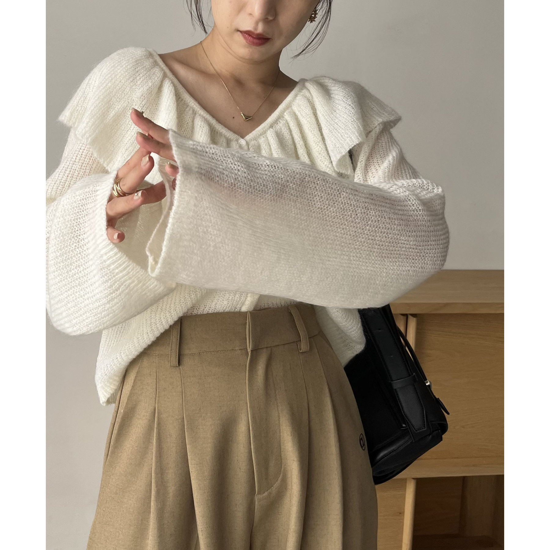 胸元のフリルが抜け感漂うフェミニンスタイルに