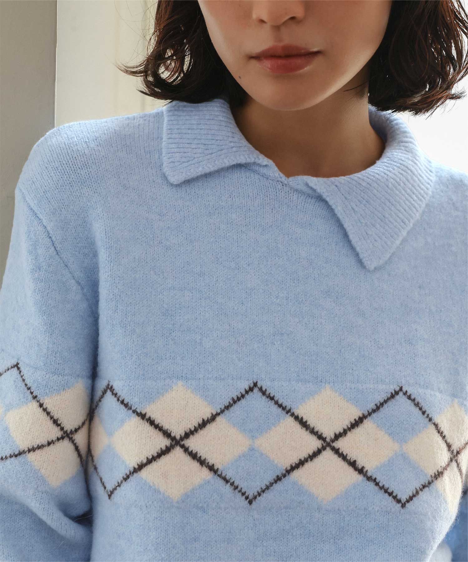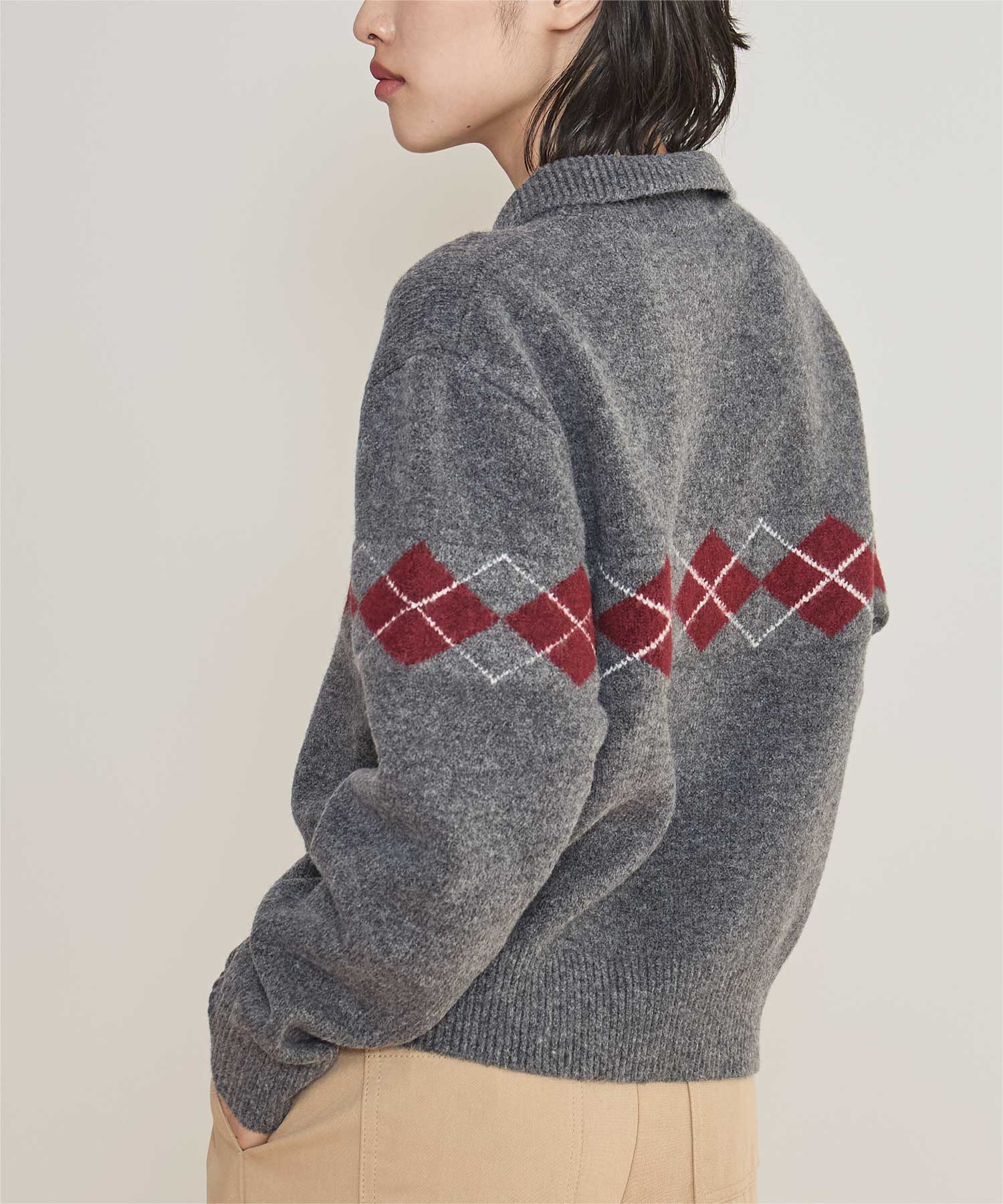 ・斜めになったアシンメトリーカラーがポイントのアーガイル柄のニット