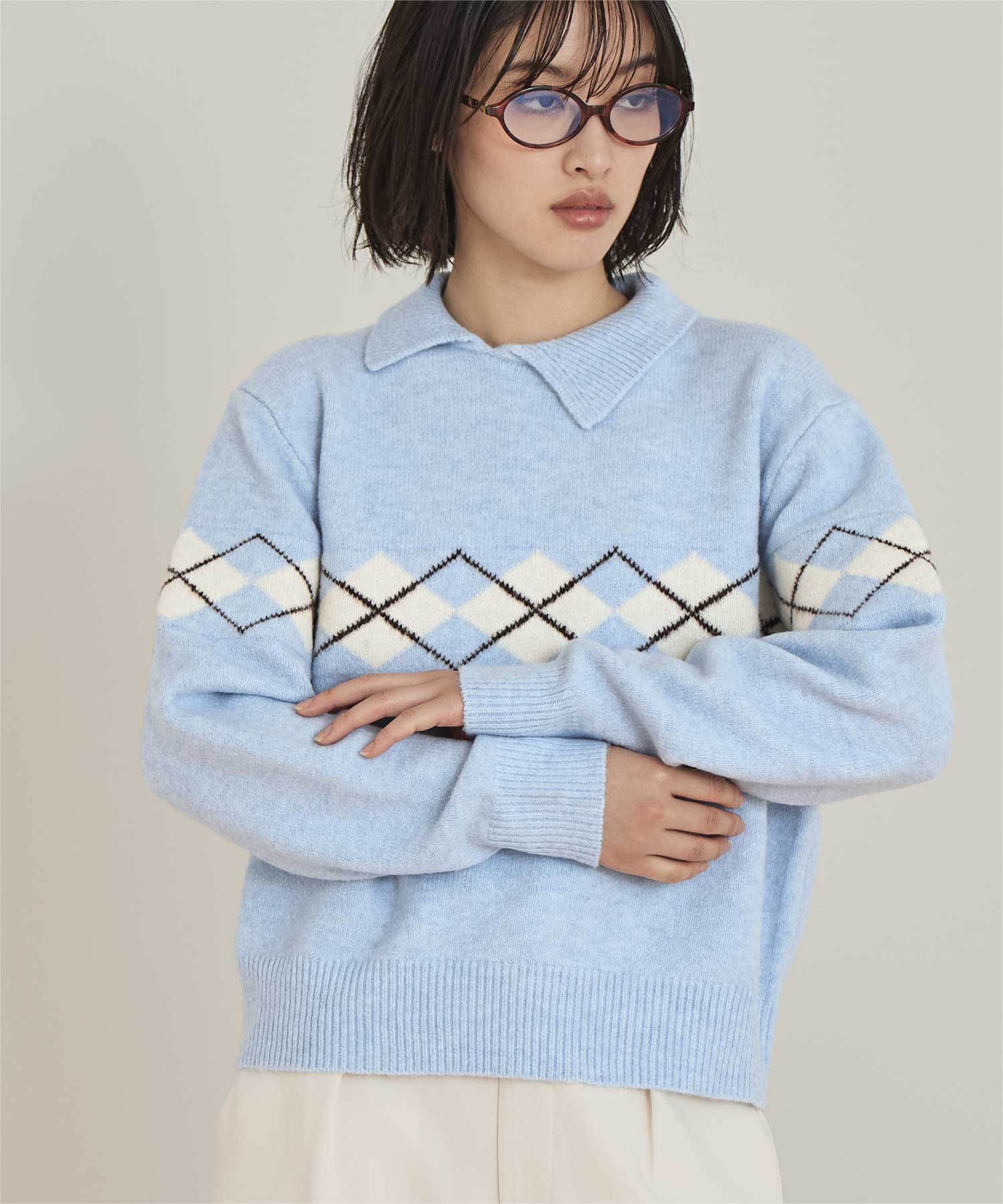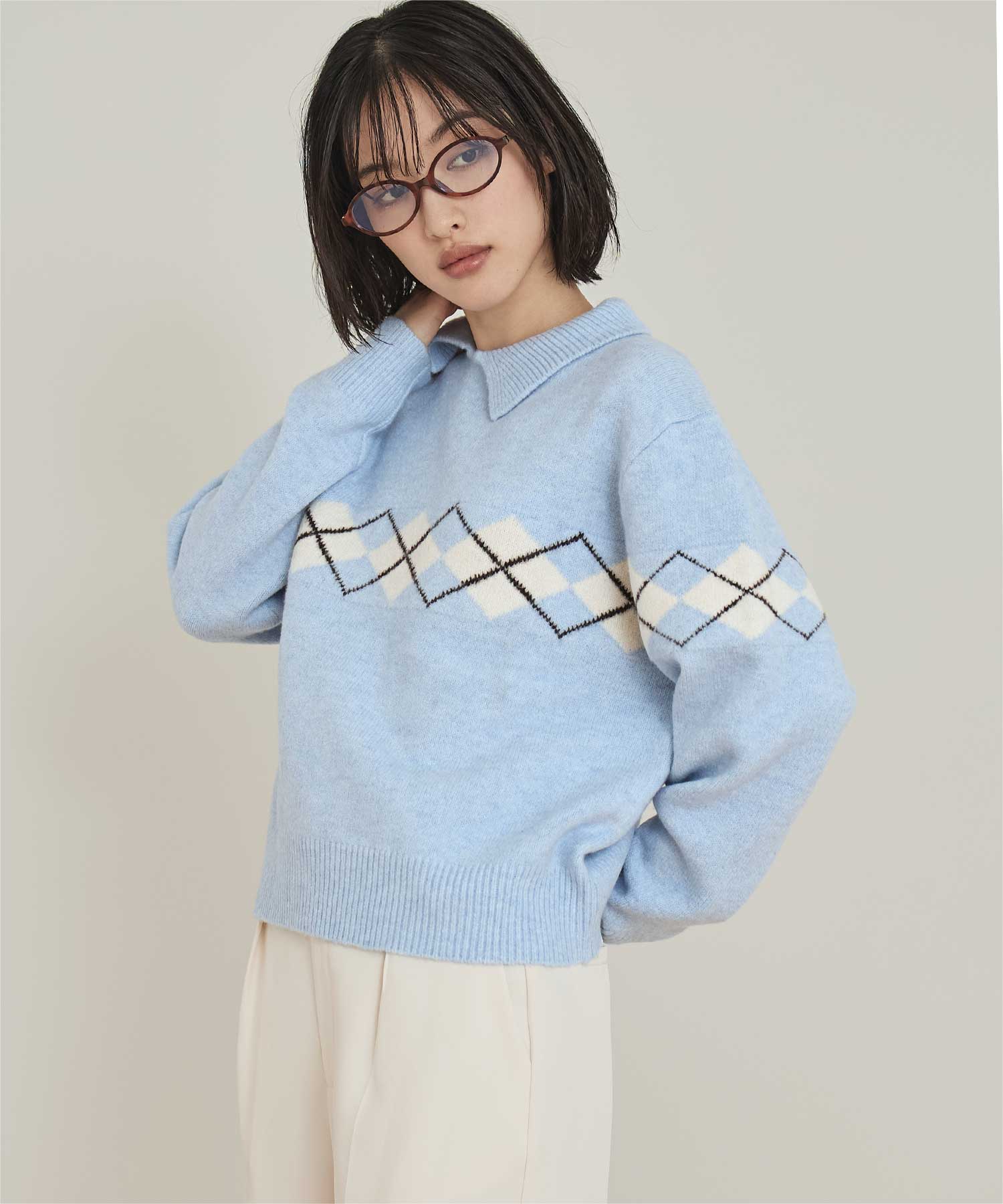 アーガイルアシンメトリーカラーニット