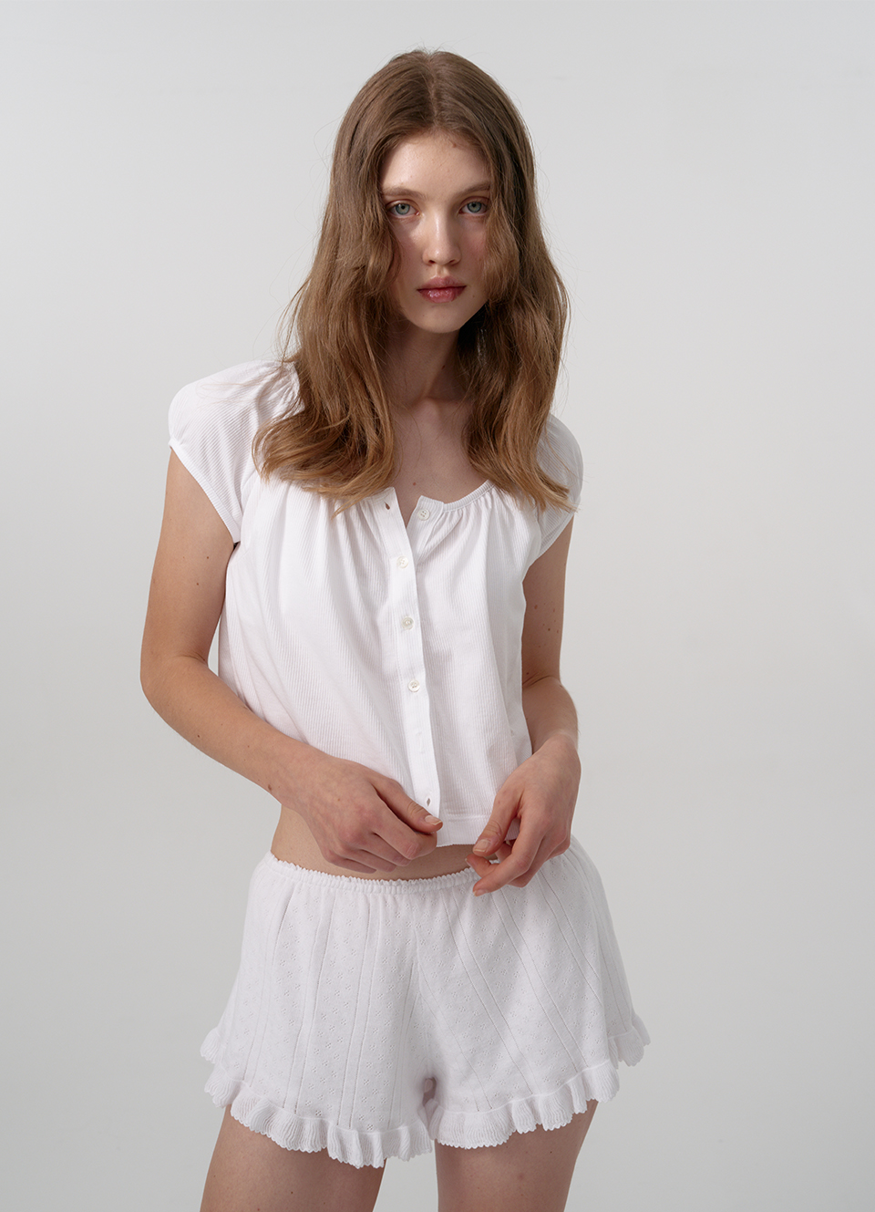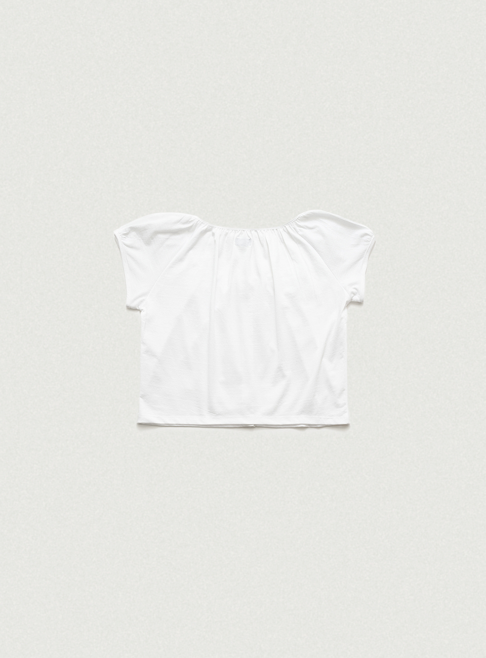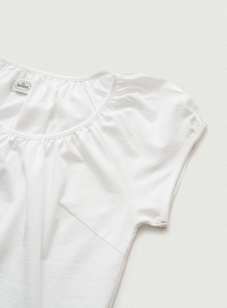 ネックラインに沿って捉えられた女性らしいシャーリングデザイン そして爽やかなショートスリーブ キビ感などのディテール