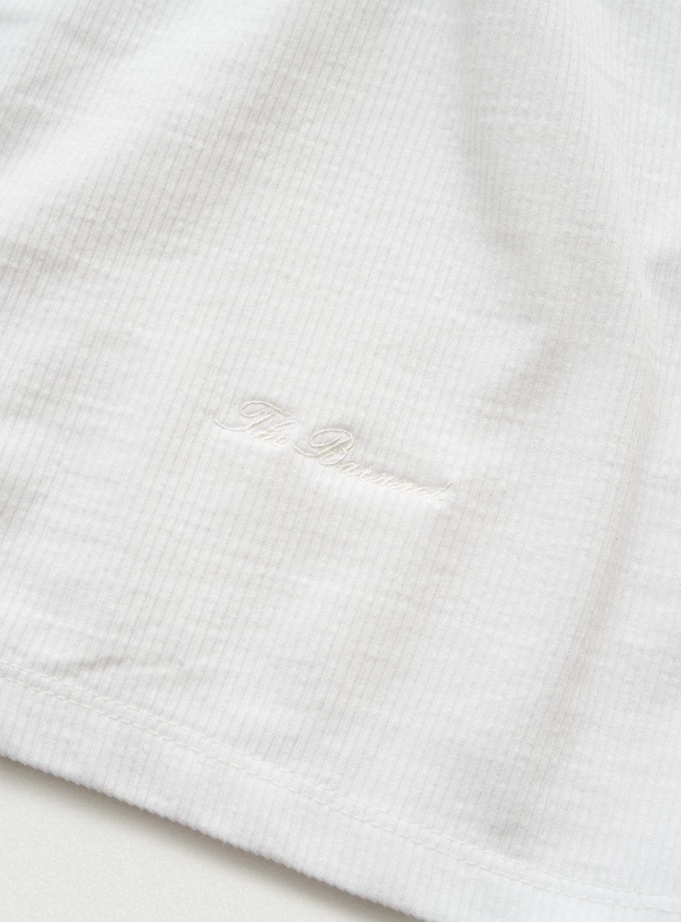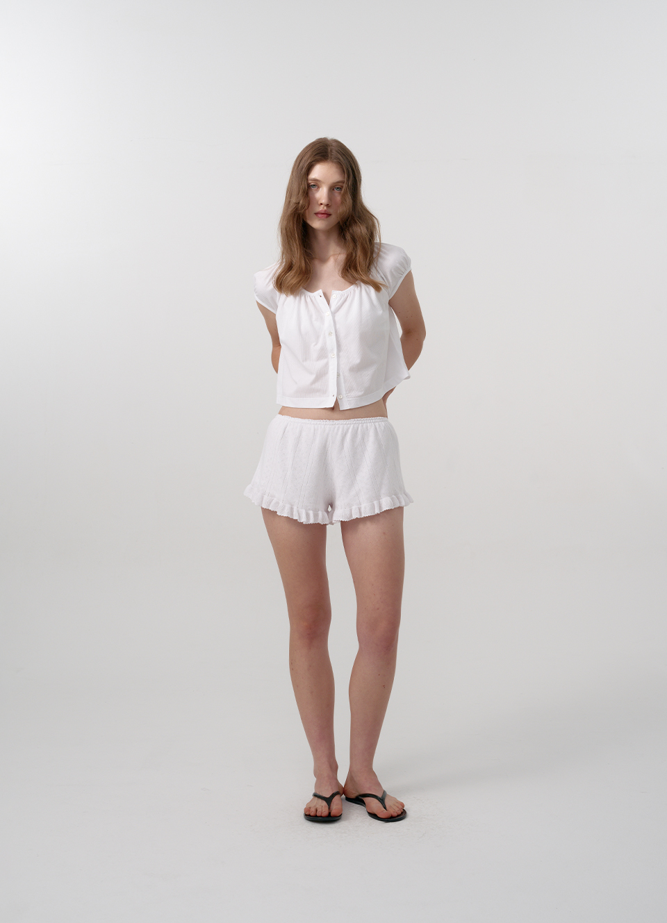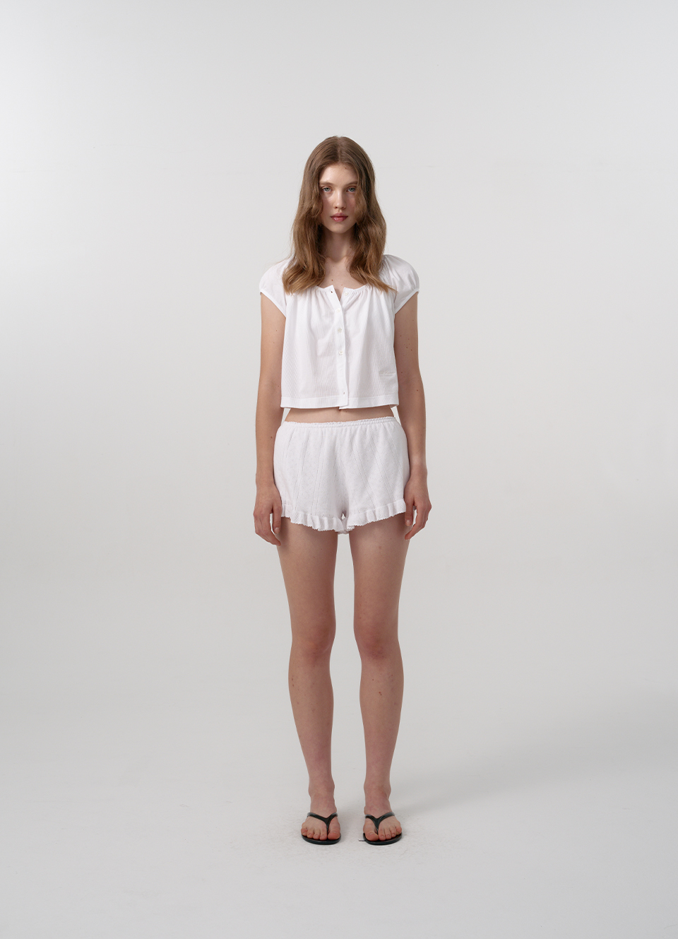 ネックラインに沿って捉えられた女性らしいシャーリングデザイン そして爽やかなショートスリーブ キビ感などのディテール
