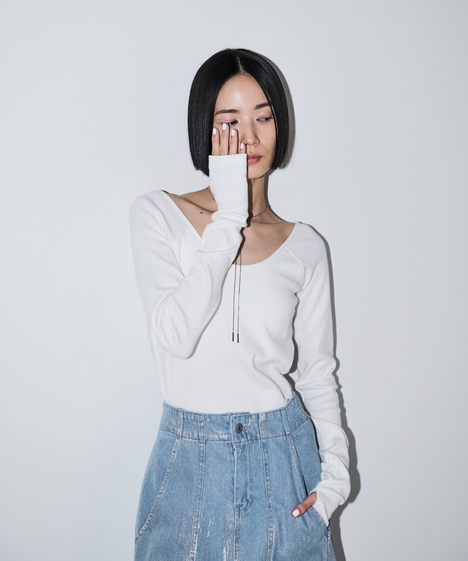 長めの袖丈に指ぬきデザイン+ラウンドヘムなど