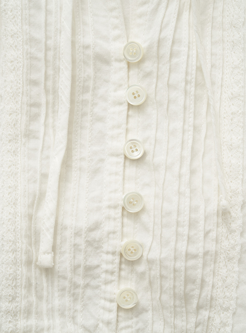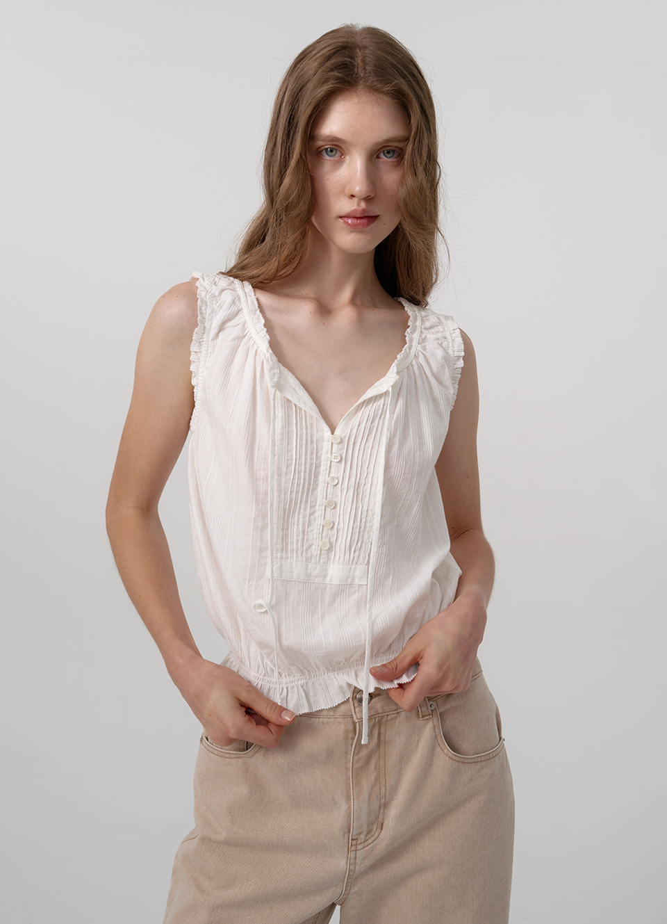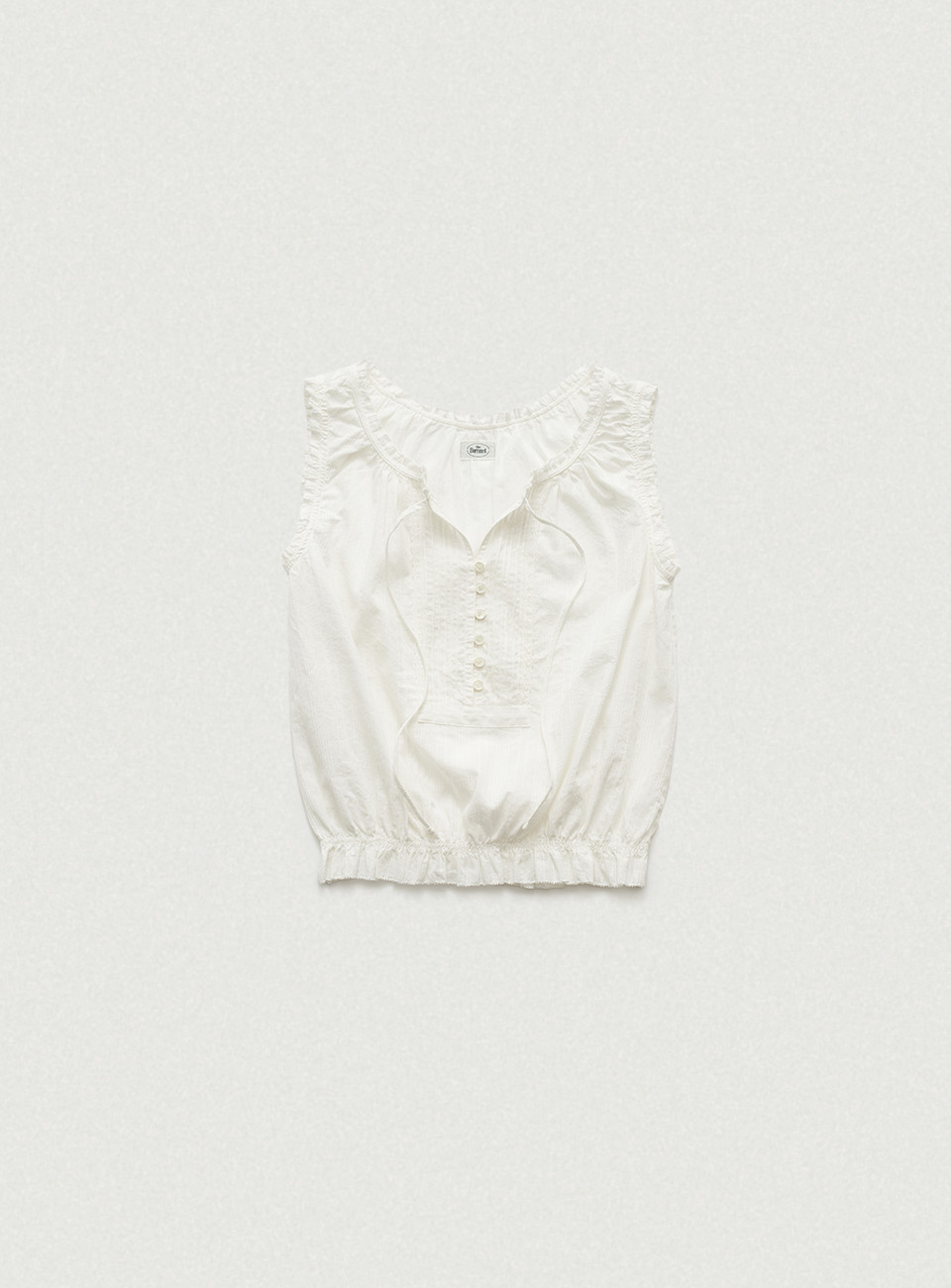 伸縮性のある裾、タイとボタンで留めるスリーブレスタイプ。
