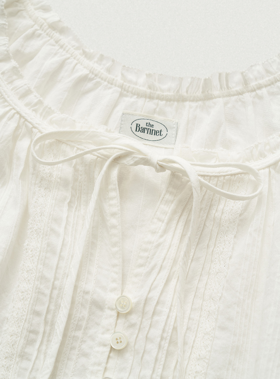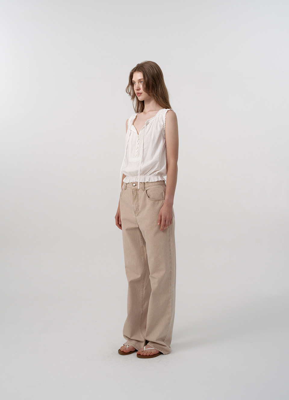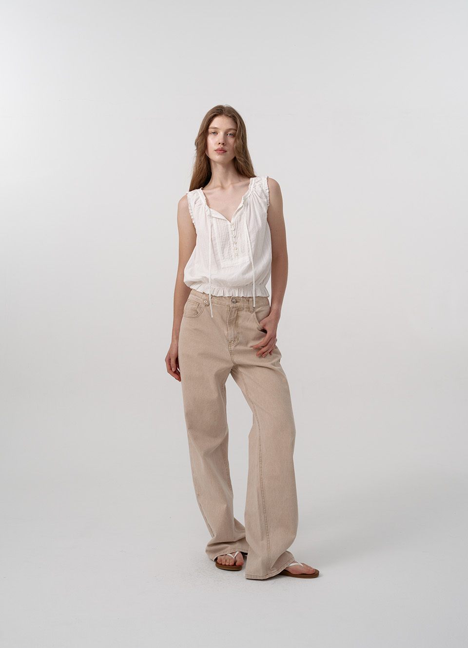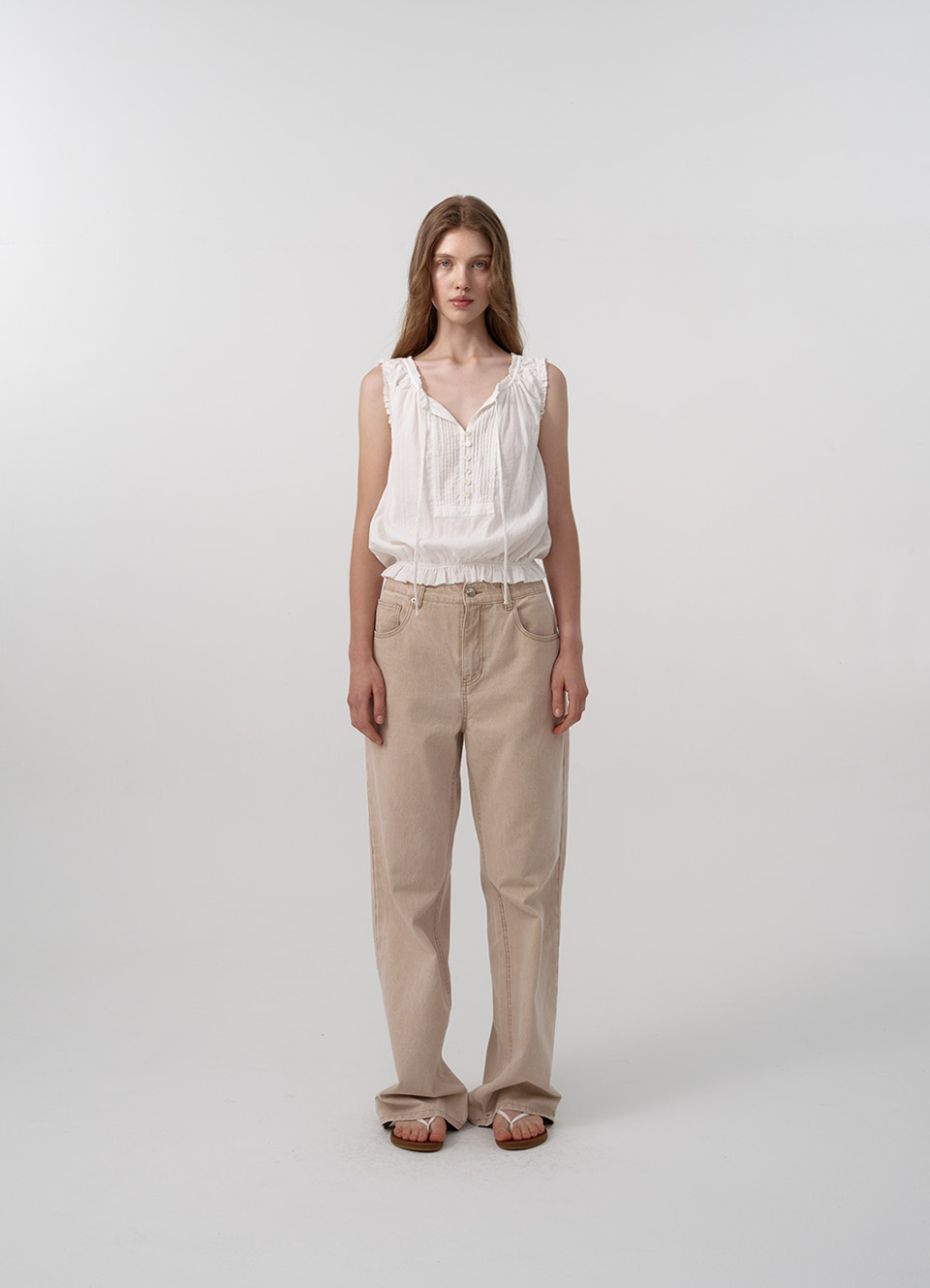 伸縮性のある裾、タイとボタンで留めるスリーブレスタイプ。