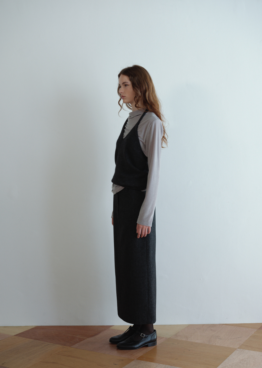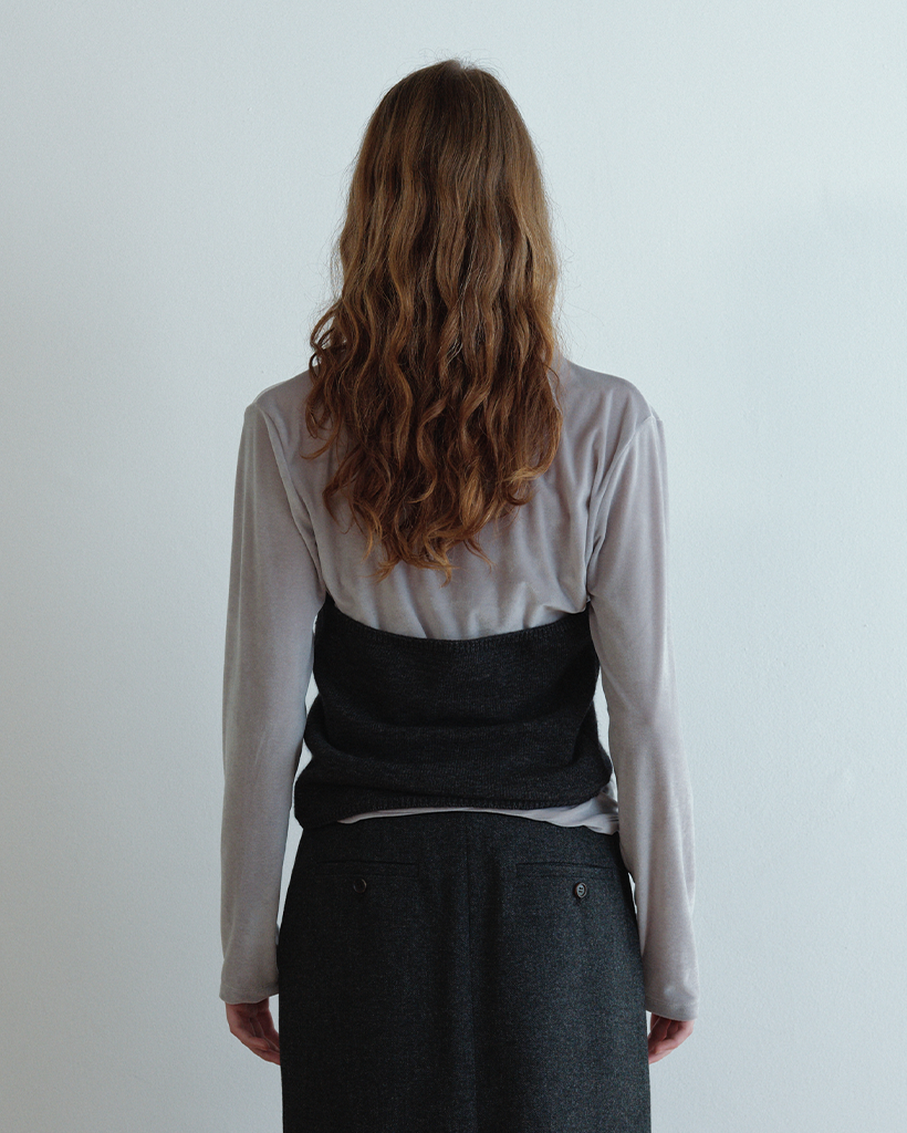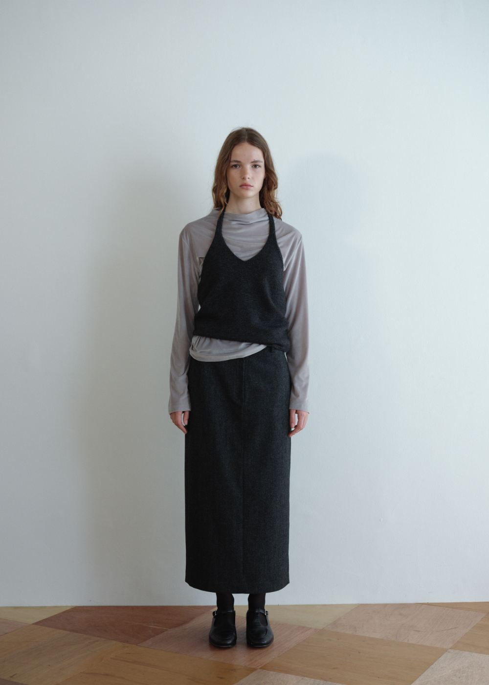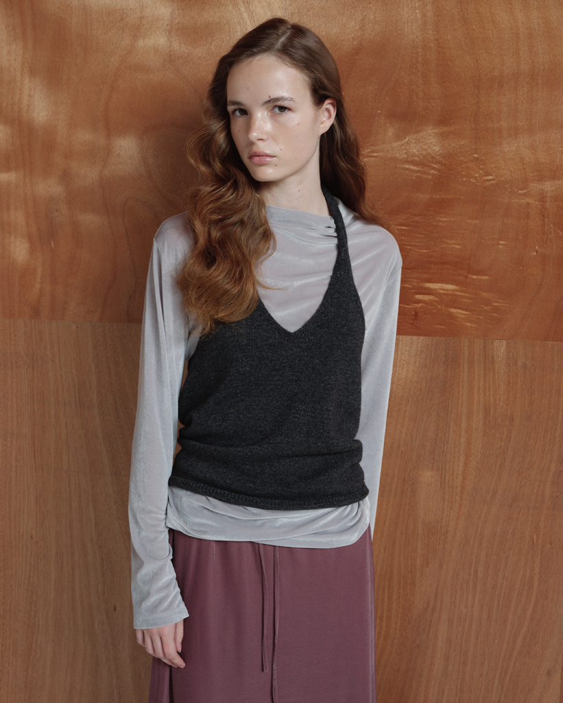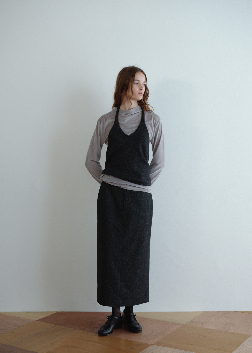 ネックラインは奥行きのあるVカットから続き、肩から首元へ自然に沿うホルター仕様で仕上げました。ウエストには取り外し可能なストラップを備え、シルエットの調整やスタイリングのアクセントとして活用できます。