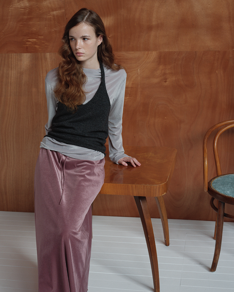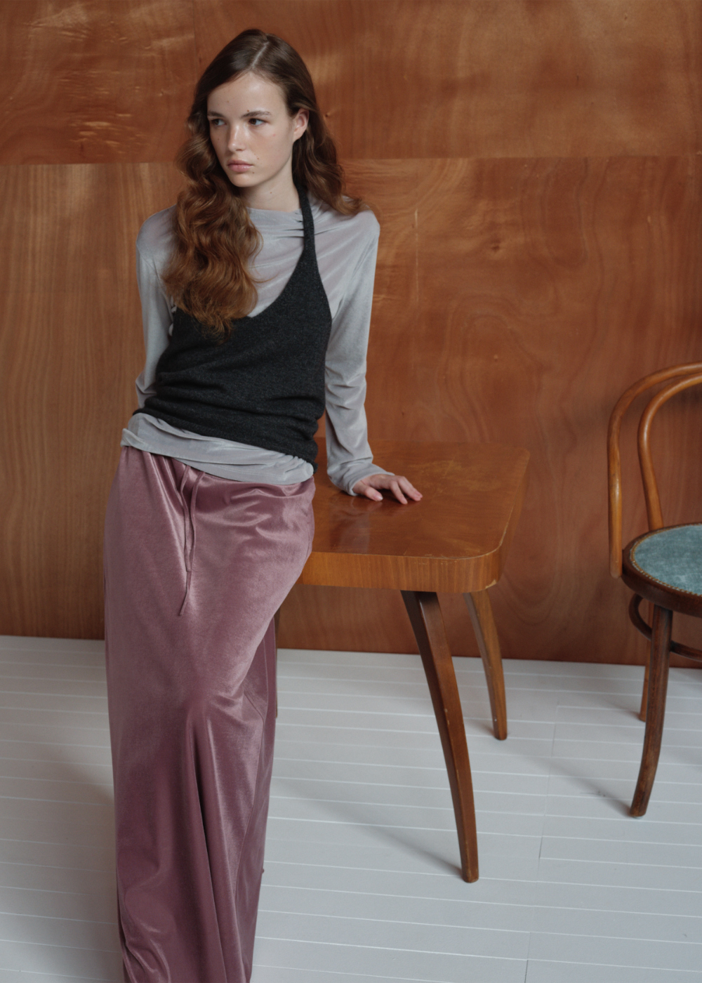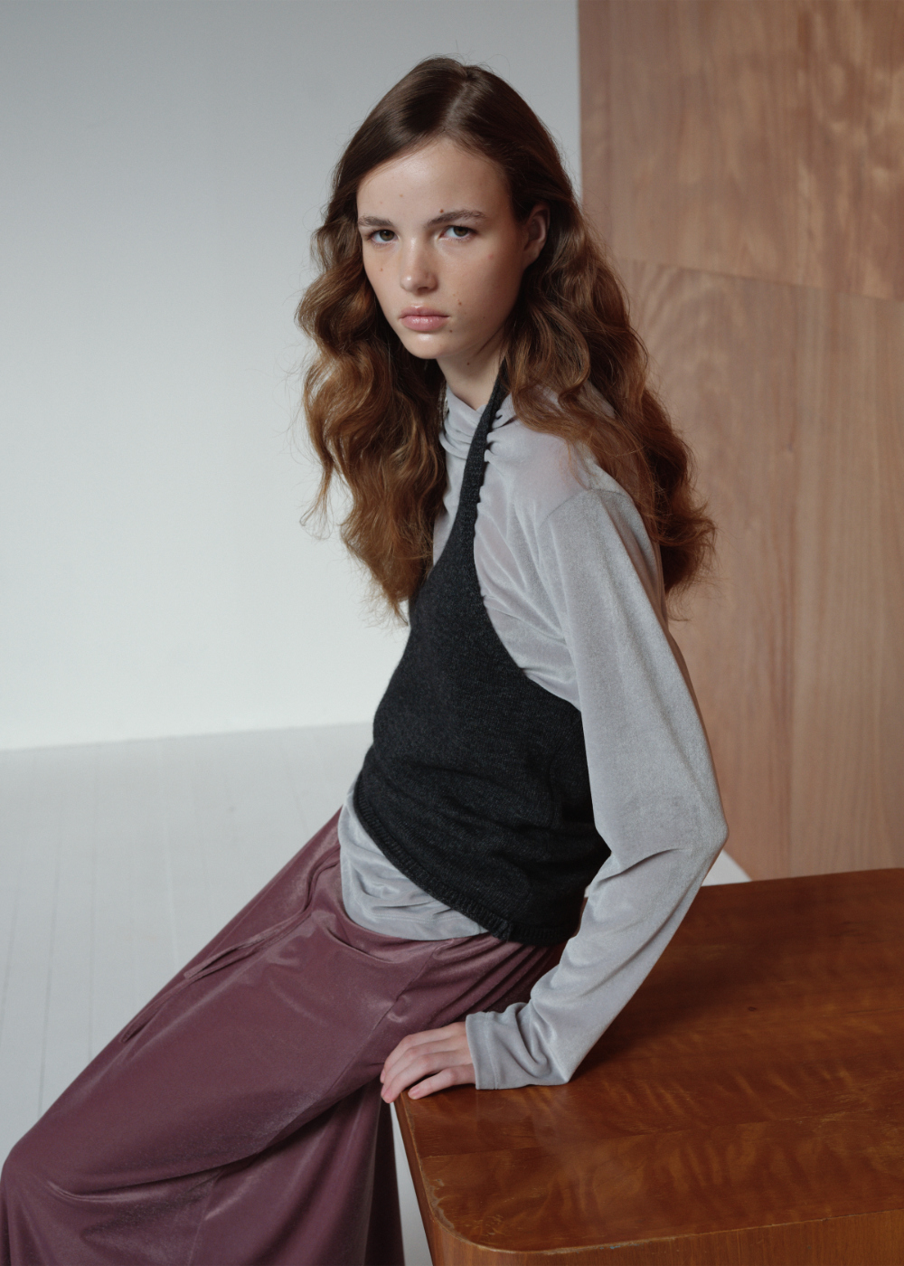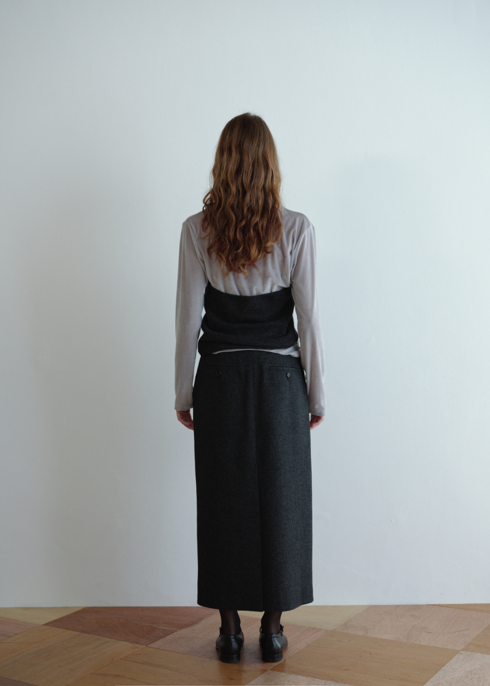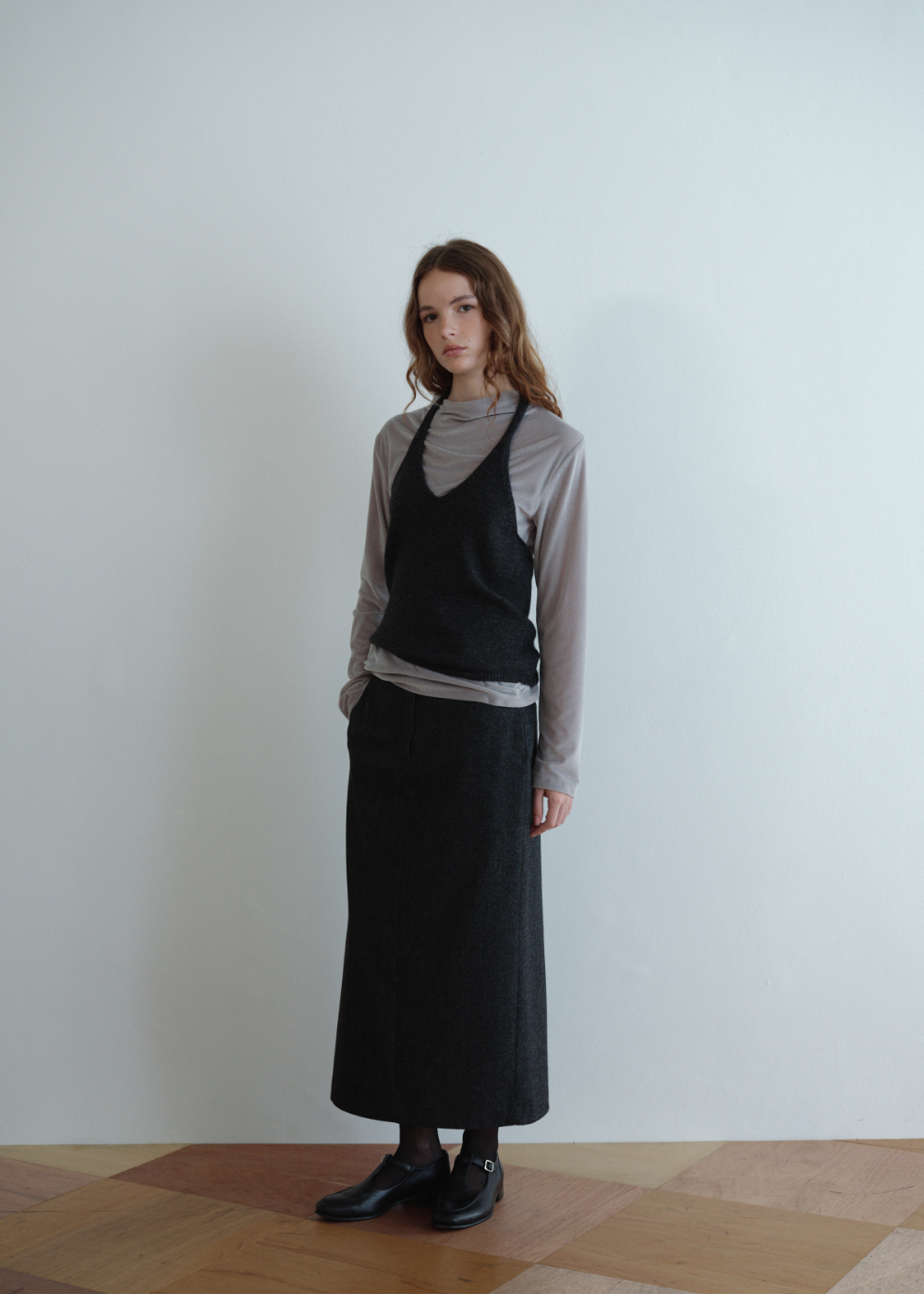 ネックラインは奥行きのあるVカットから続き、肩から首元へ自然に沿うホルター仕様で仕上げました。ウエストには取り外し可能なストラップを備え、シルエットの調整やスタイリングのアクセントとして活用できます。