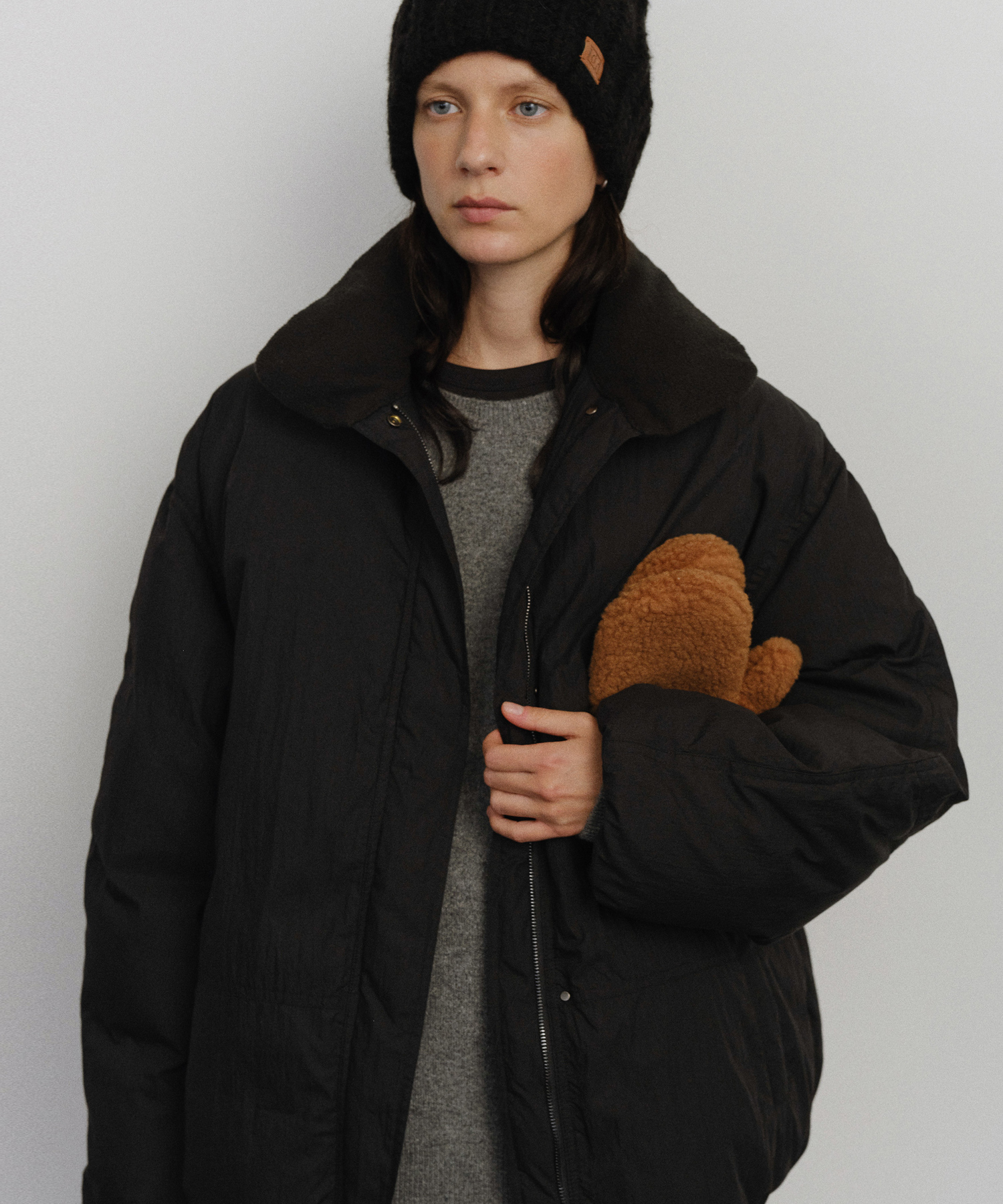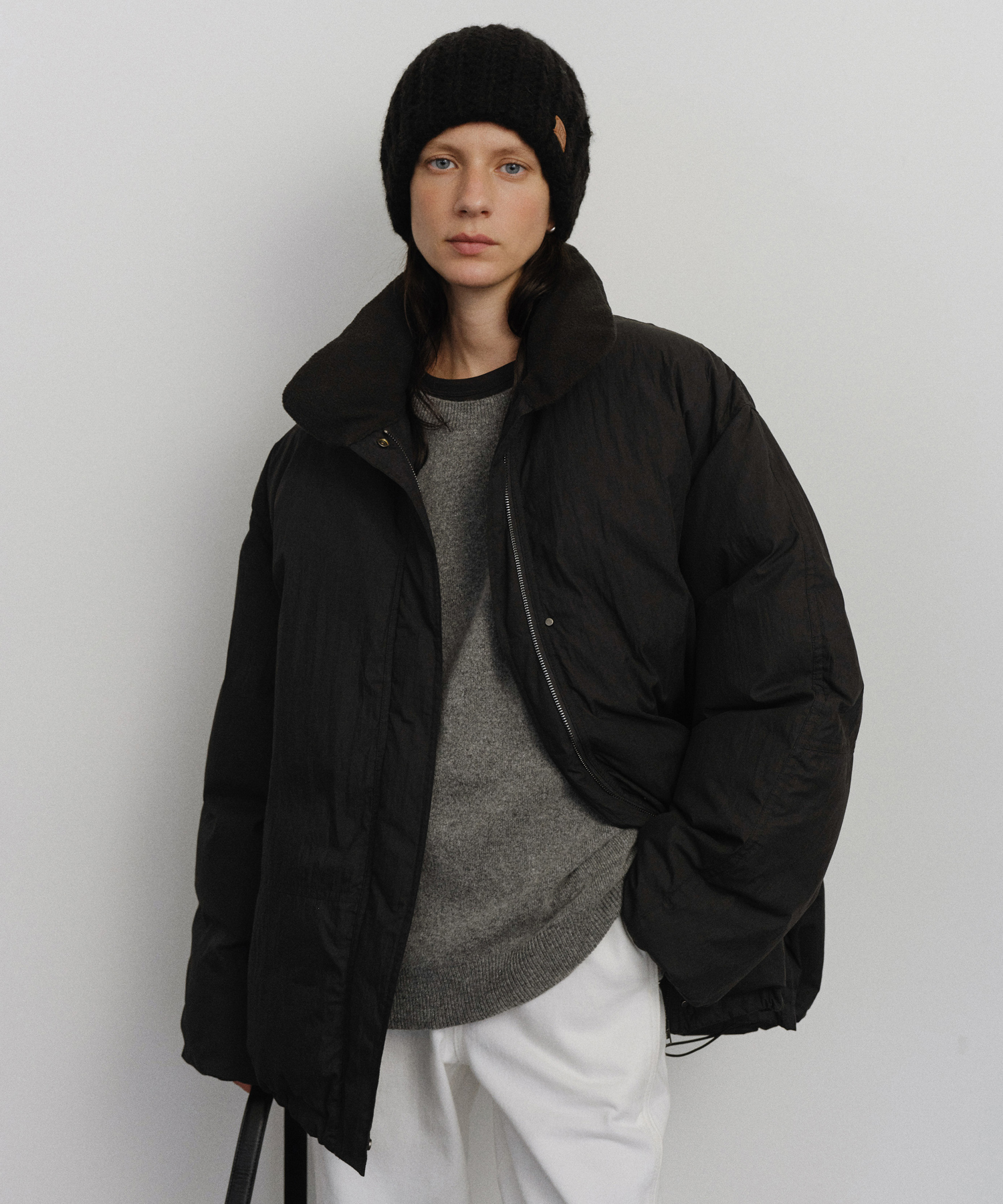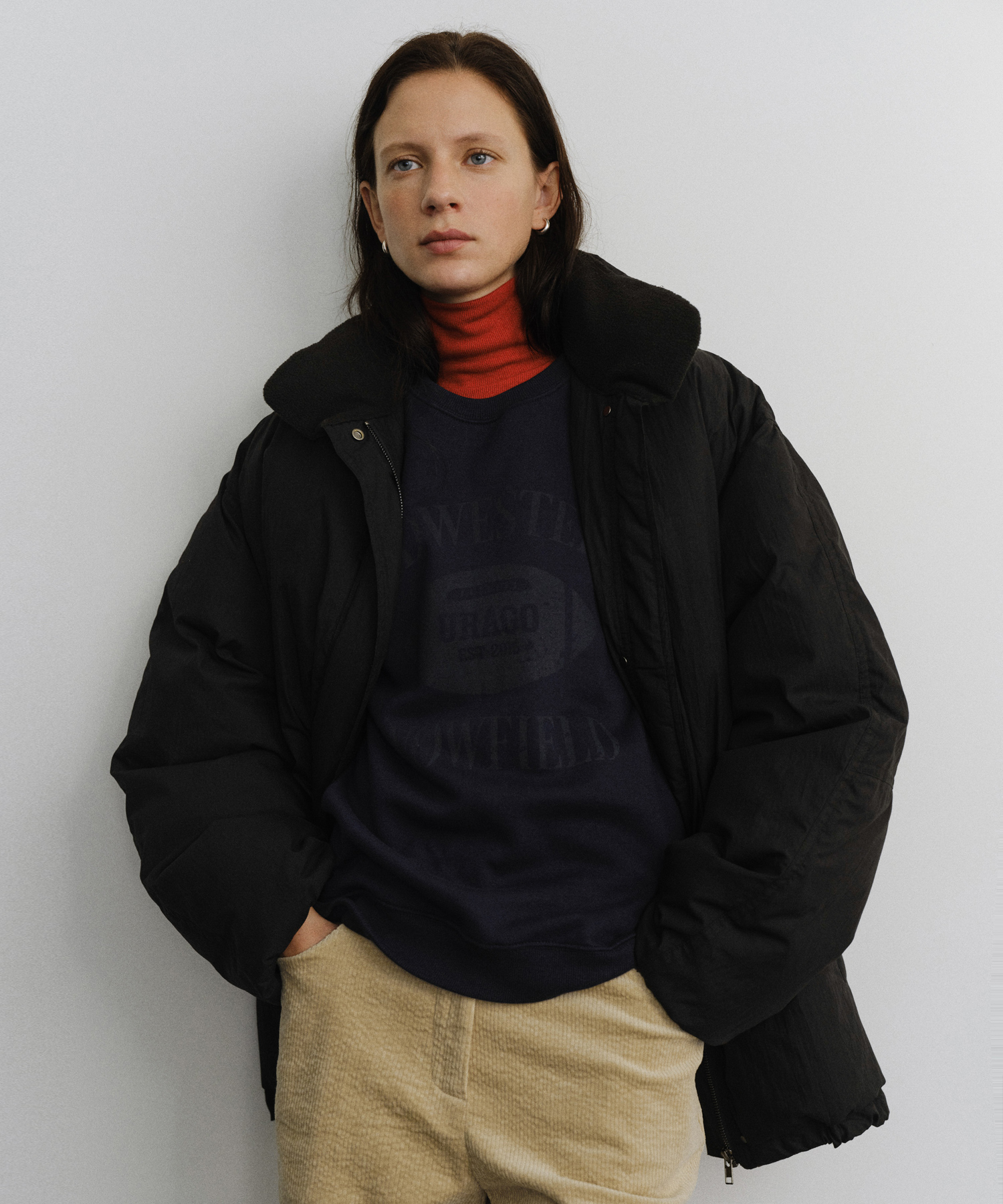 - 肌に触れるネックラインの内側にはポーラーフリースの配色裏地を用い、首元をやさしく包み込むハイネックデザインで保温性を高めています。また、身頃の切り替え線を最小限に抑え、一般的なパディングのスポーティーさよりも、よりミニマルな雰囲気を完成させました。