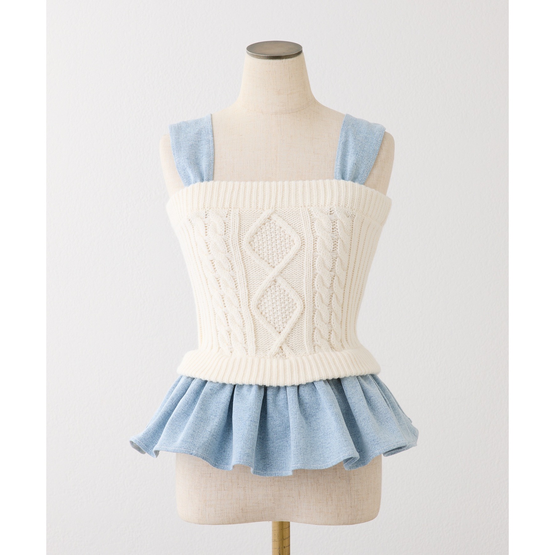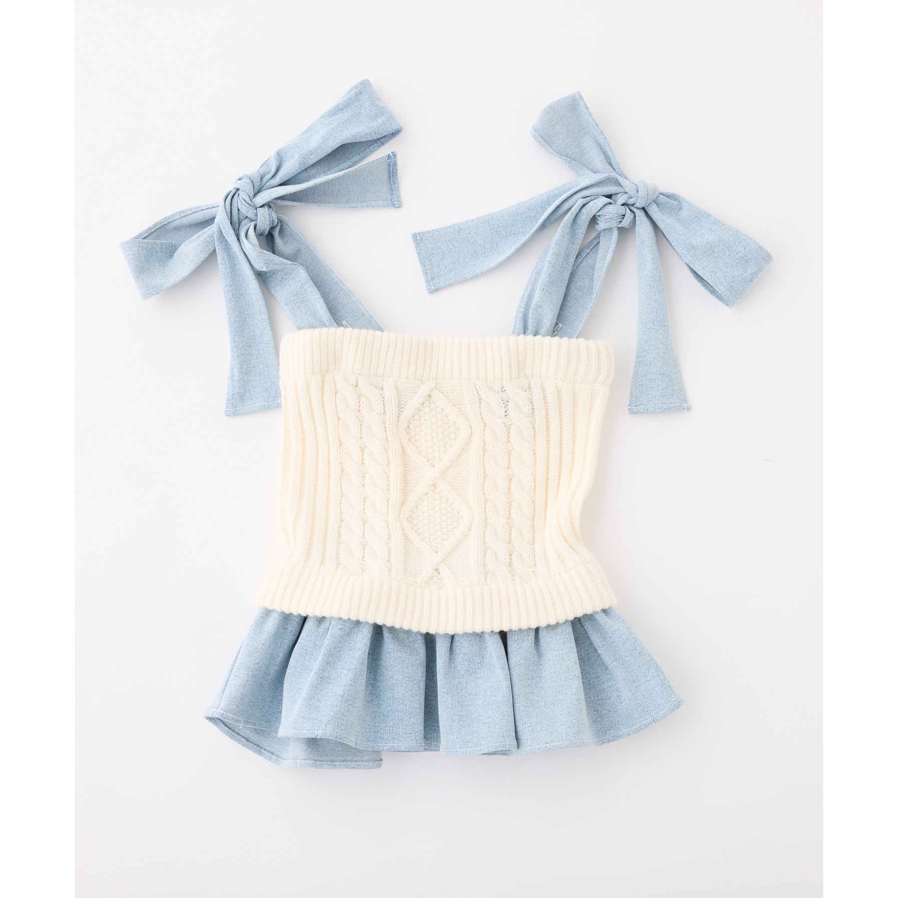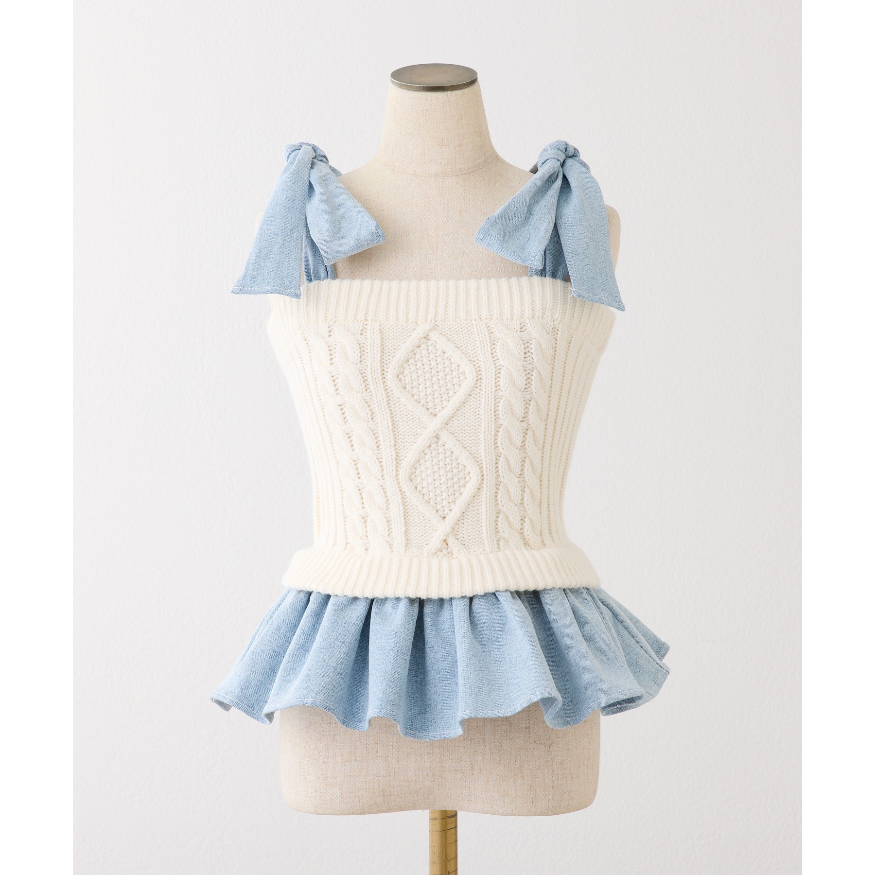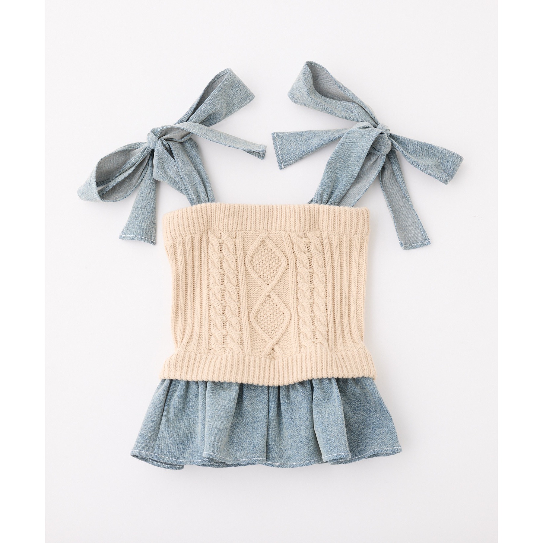 身ごろはケーブル編みニット、肩リボンと裾フリルにはデニム素材を使用した、異素材ミックスが可愛いビスチェ。