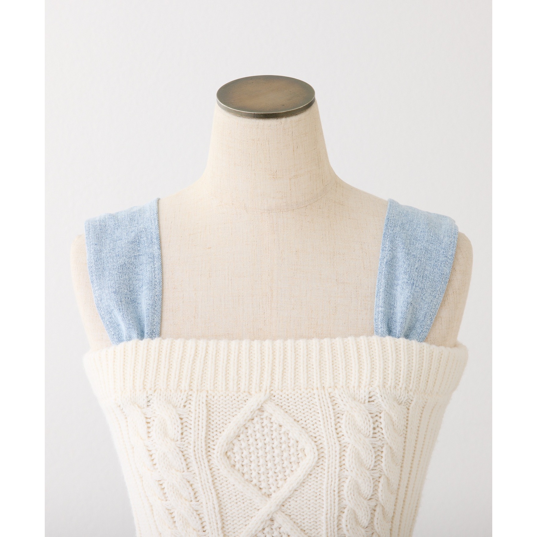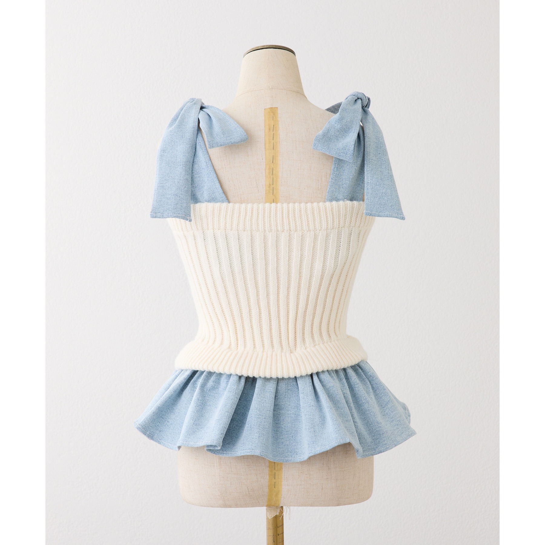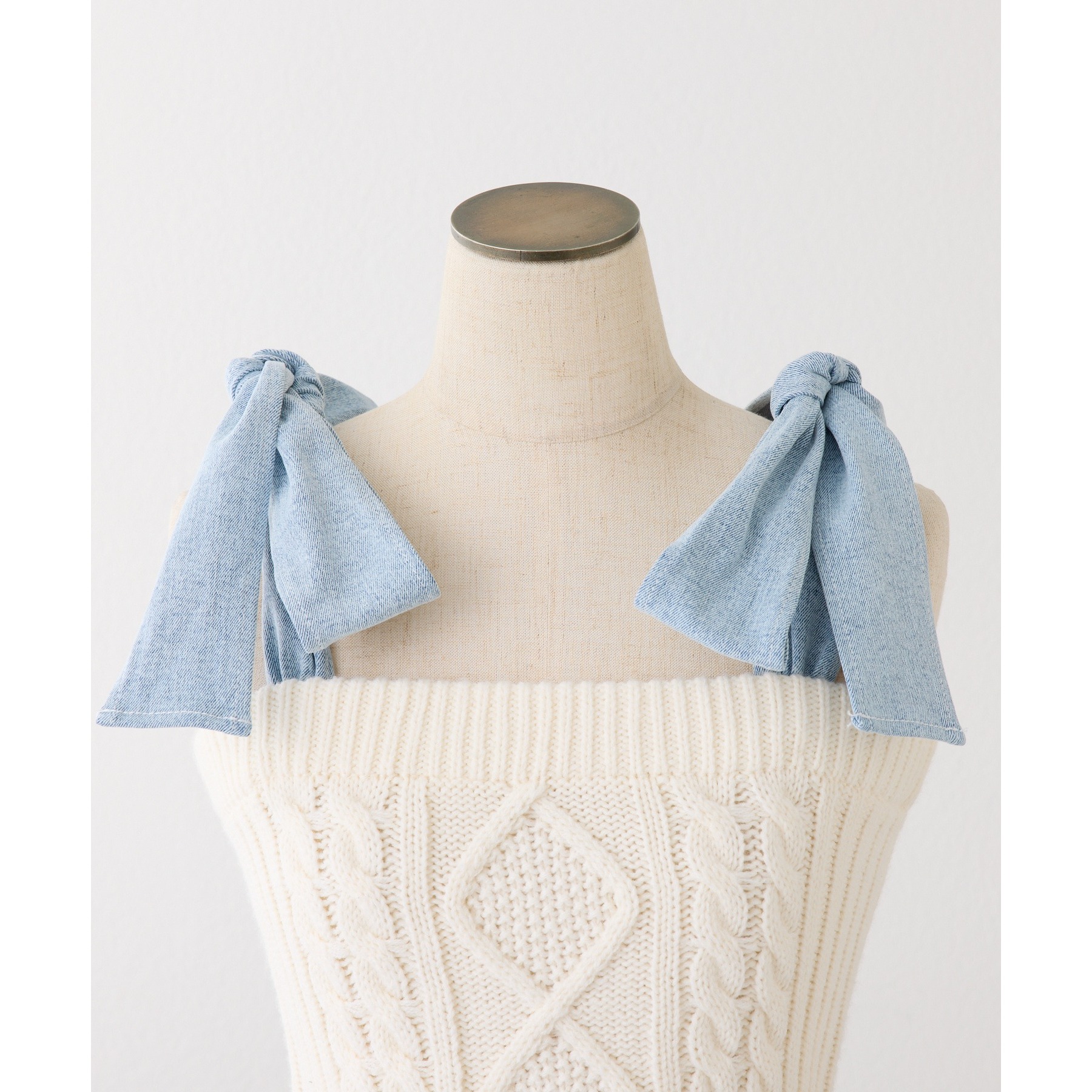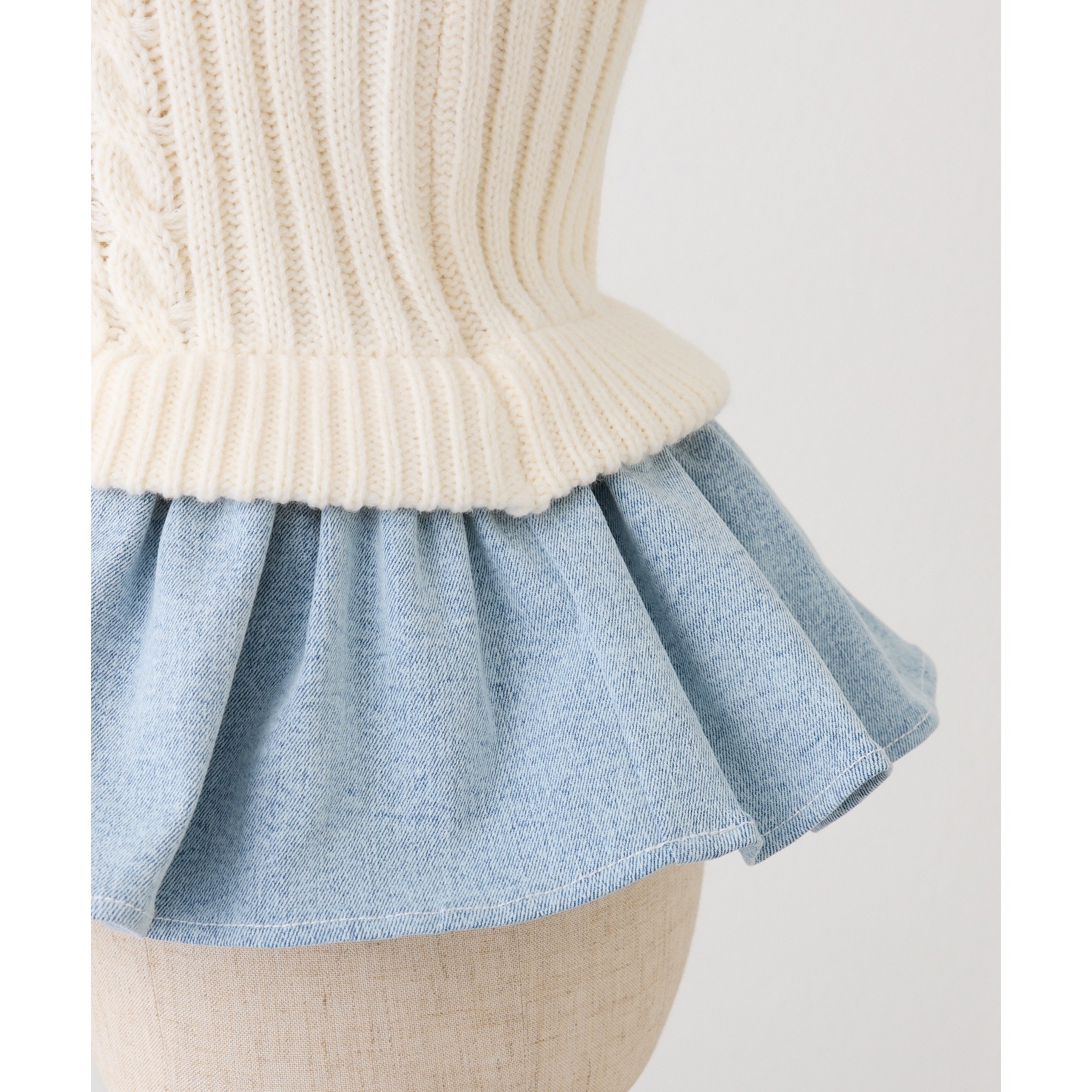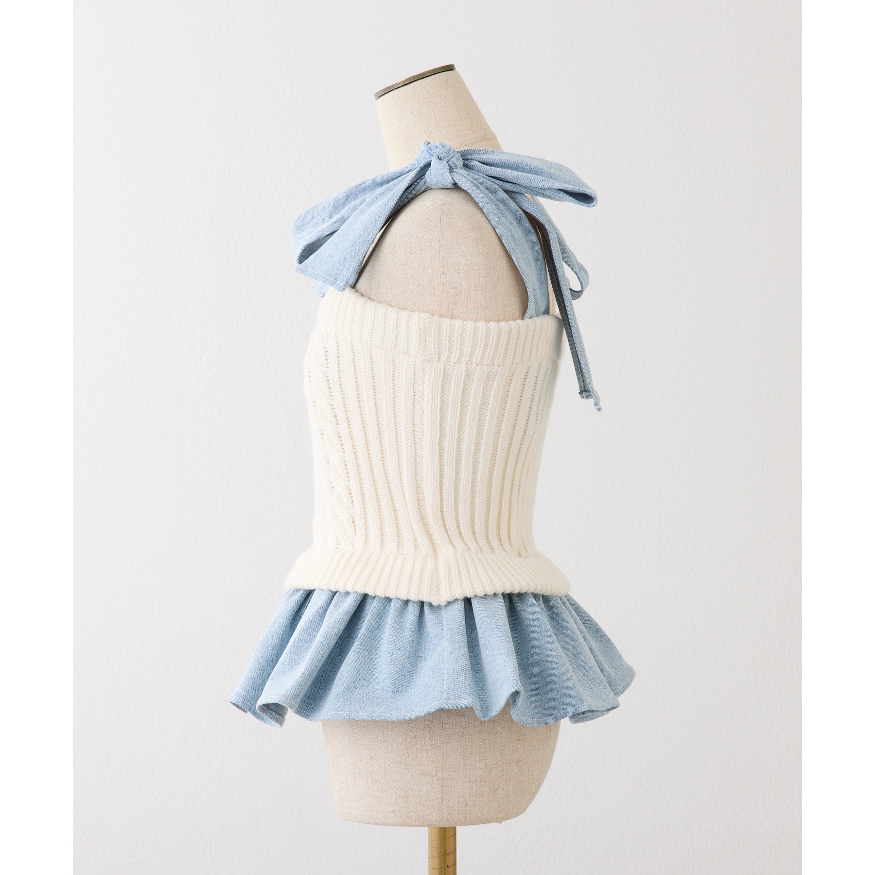身ごろはケーブル編みニット、肩リボンと裾フリルにはデニム素材を使用した、異素材ミックスが可愛いビスチェ。
