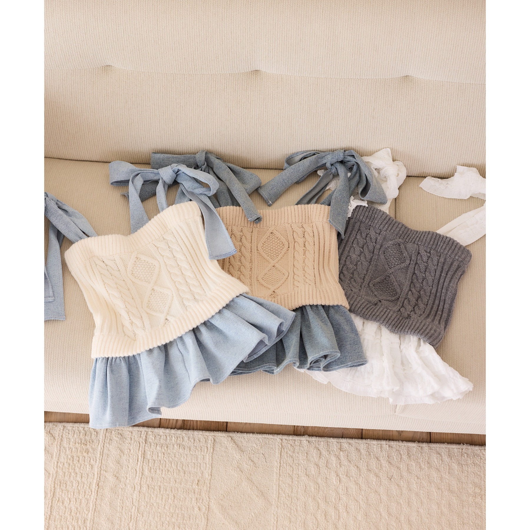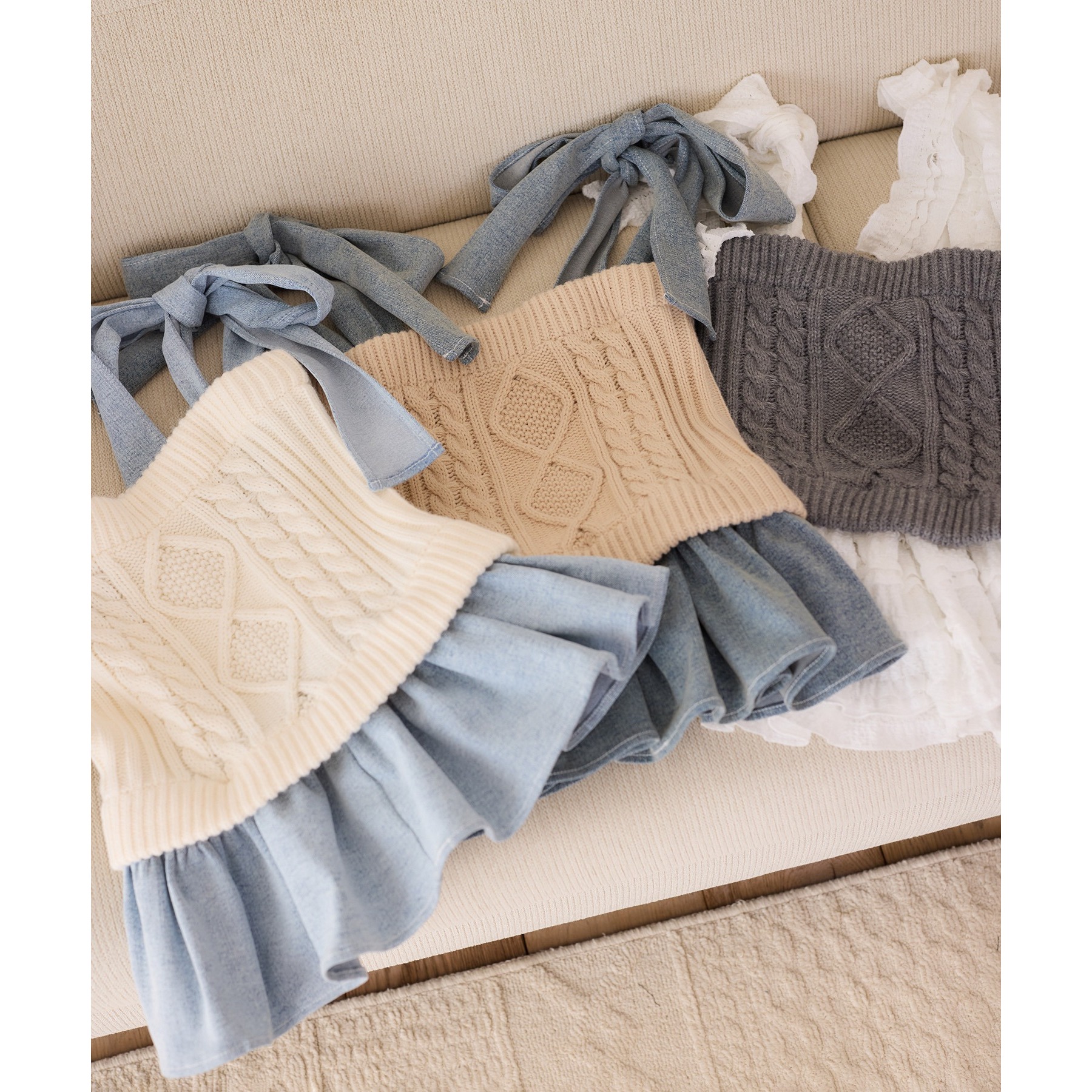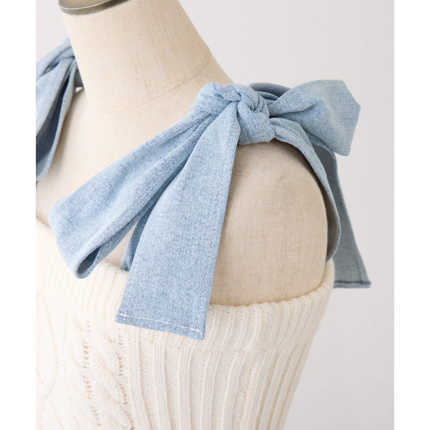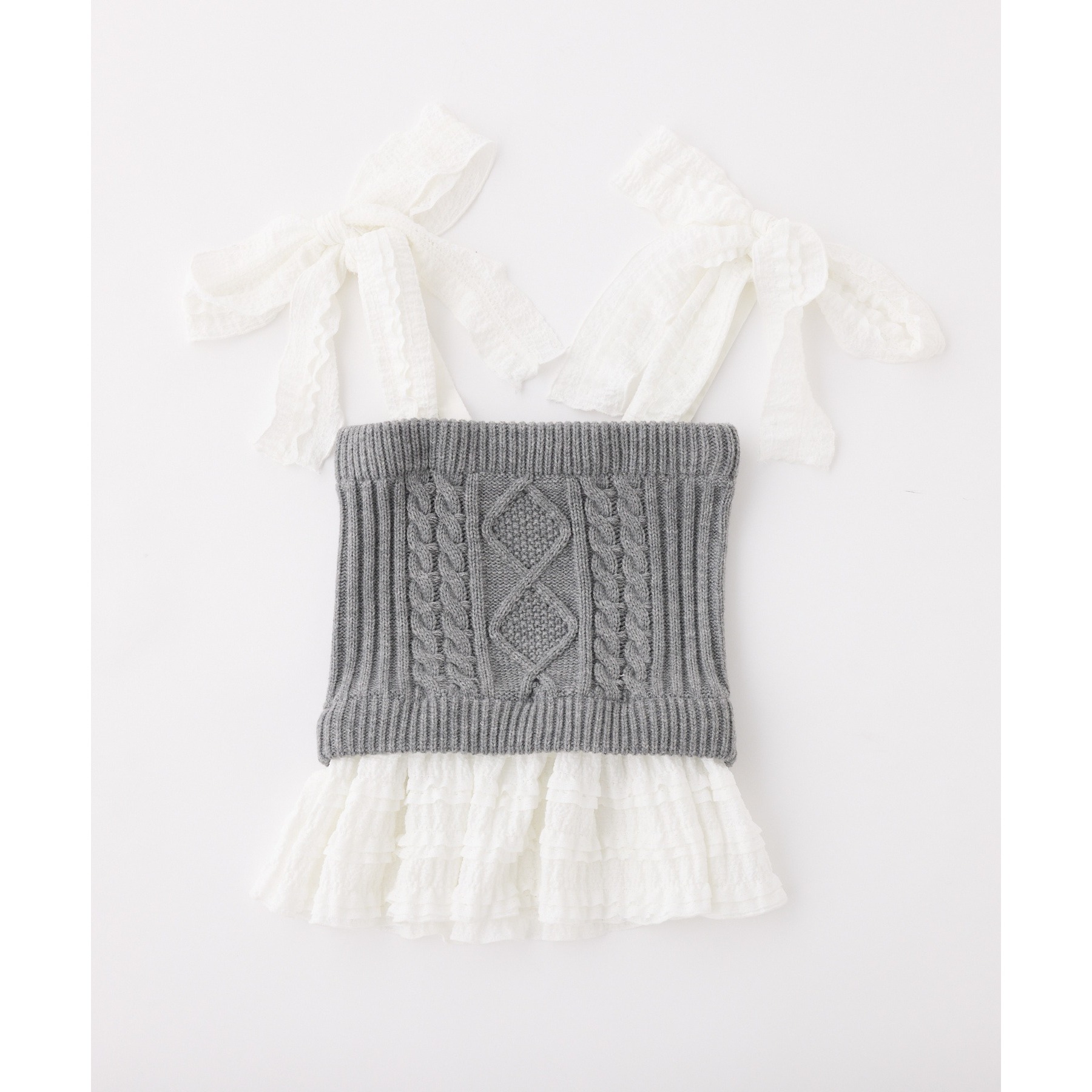 身ごろはケーブル編みニット、肩リボンと裾フリルにはデニム素材を使用した、異素材ミックスが可愛いビスチェ。