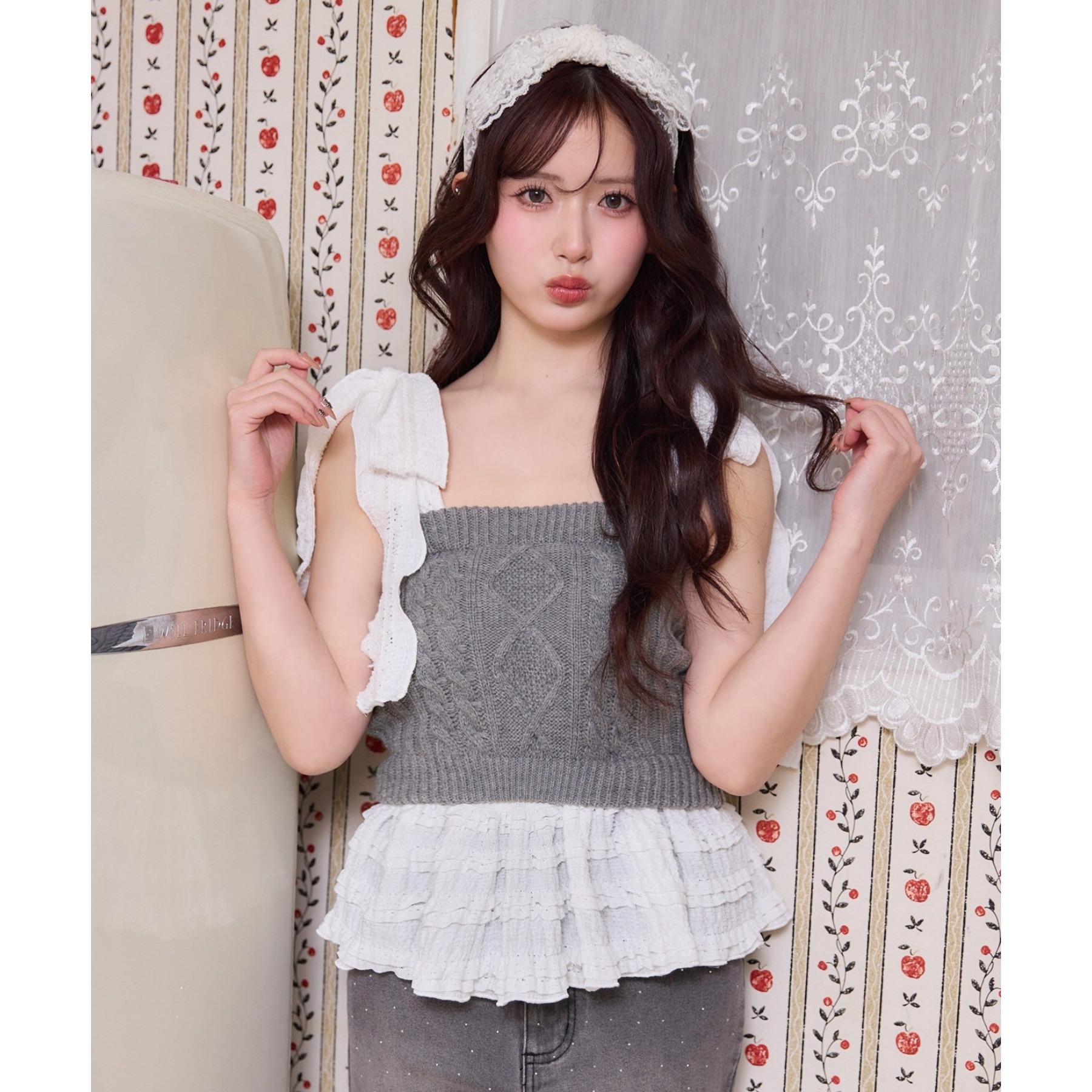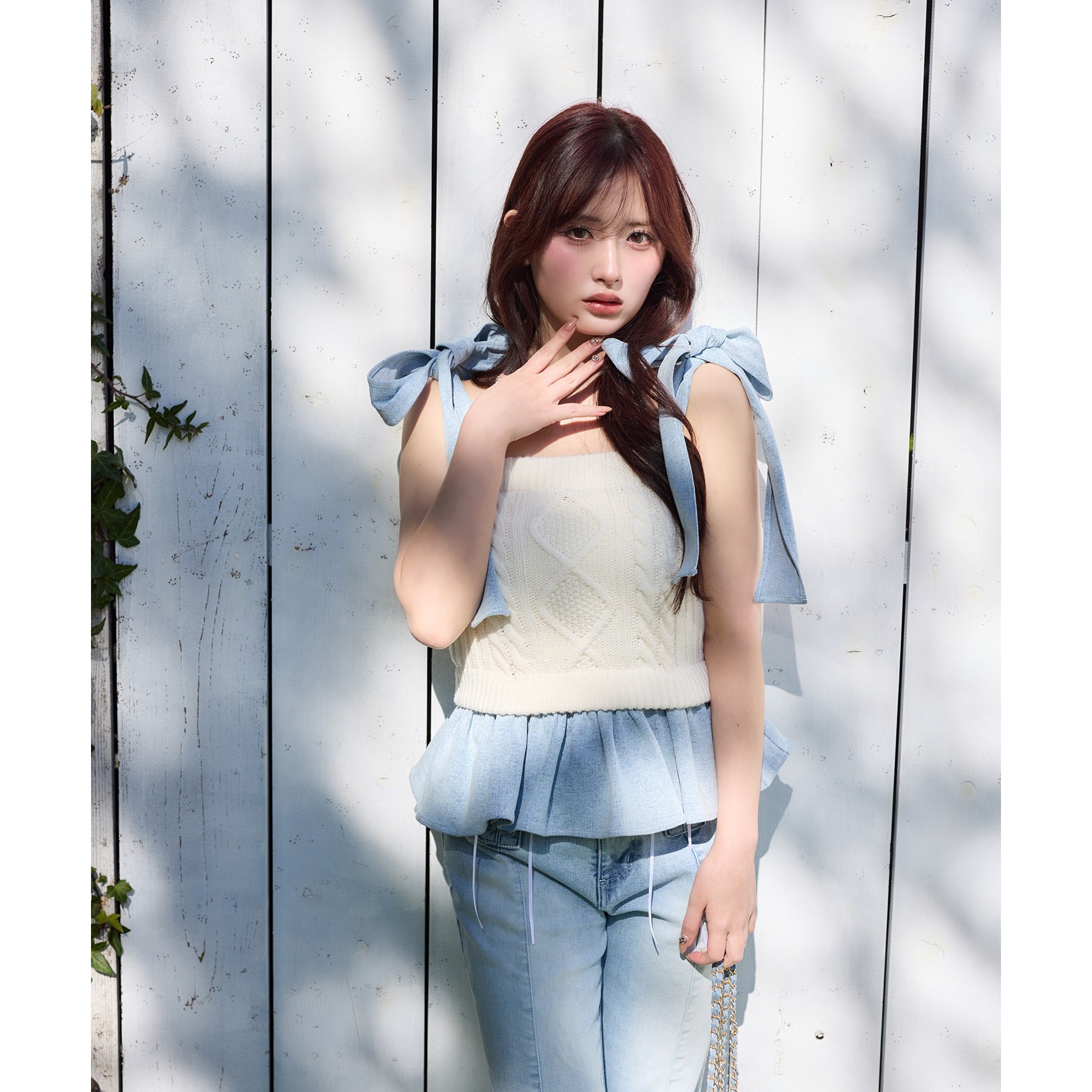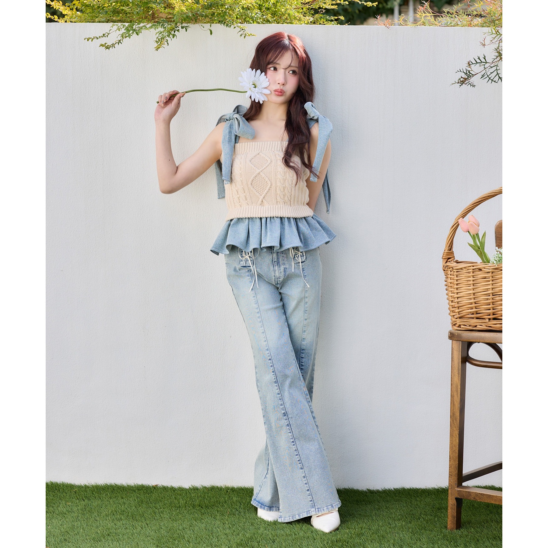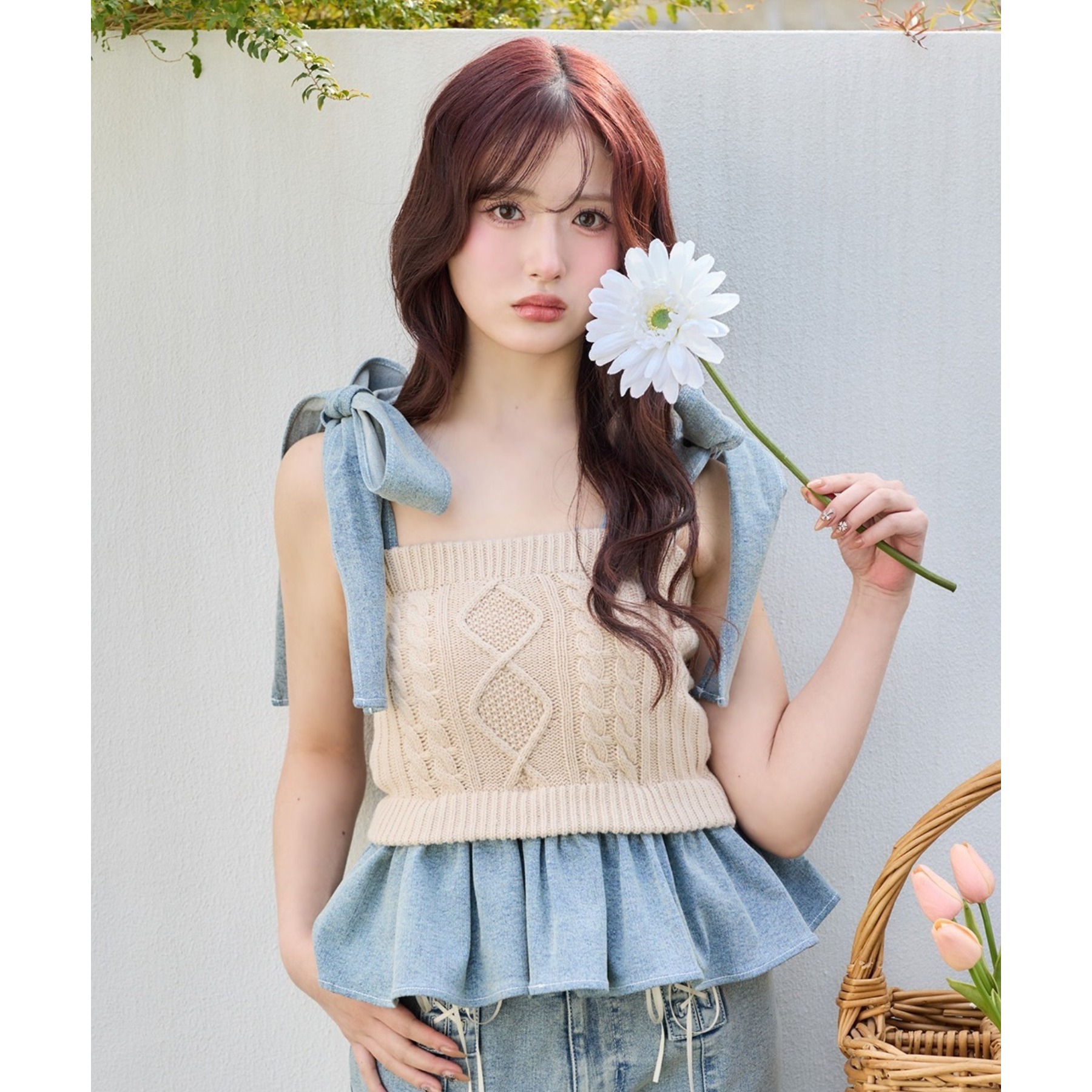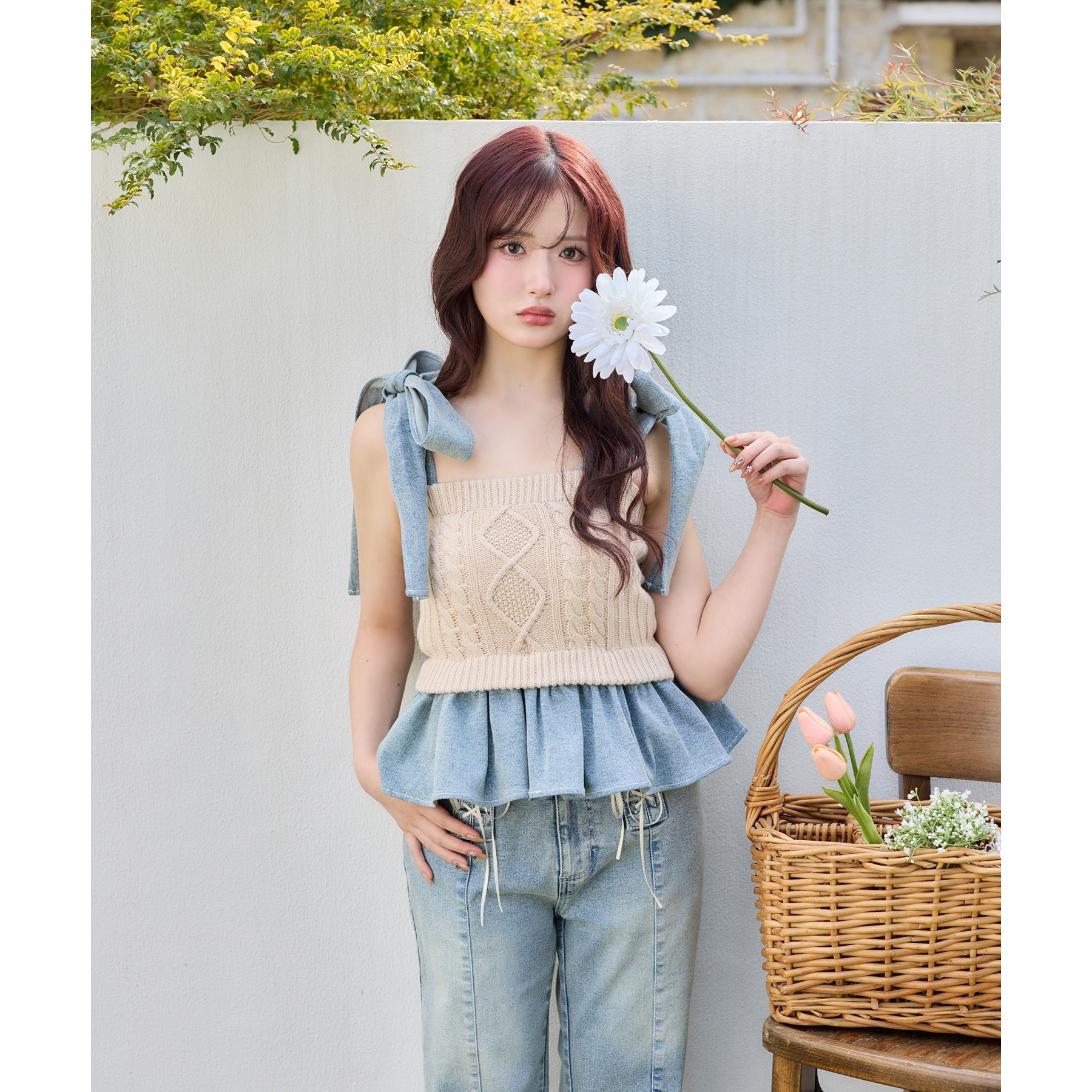 身ごろはケーブル編みニット、肩リボンと裾フリルにはデニム素材を使用した、異素材ミックスが可愛いビスチェ。
