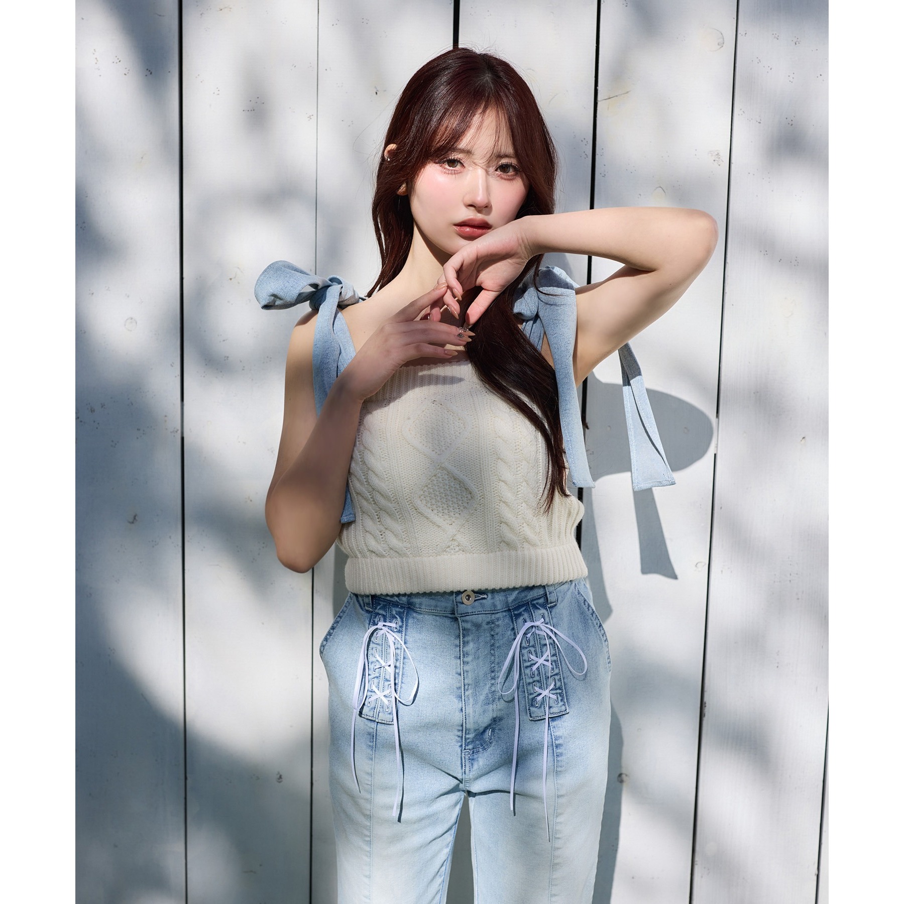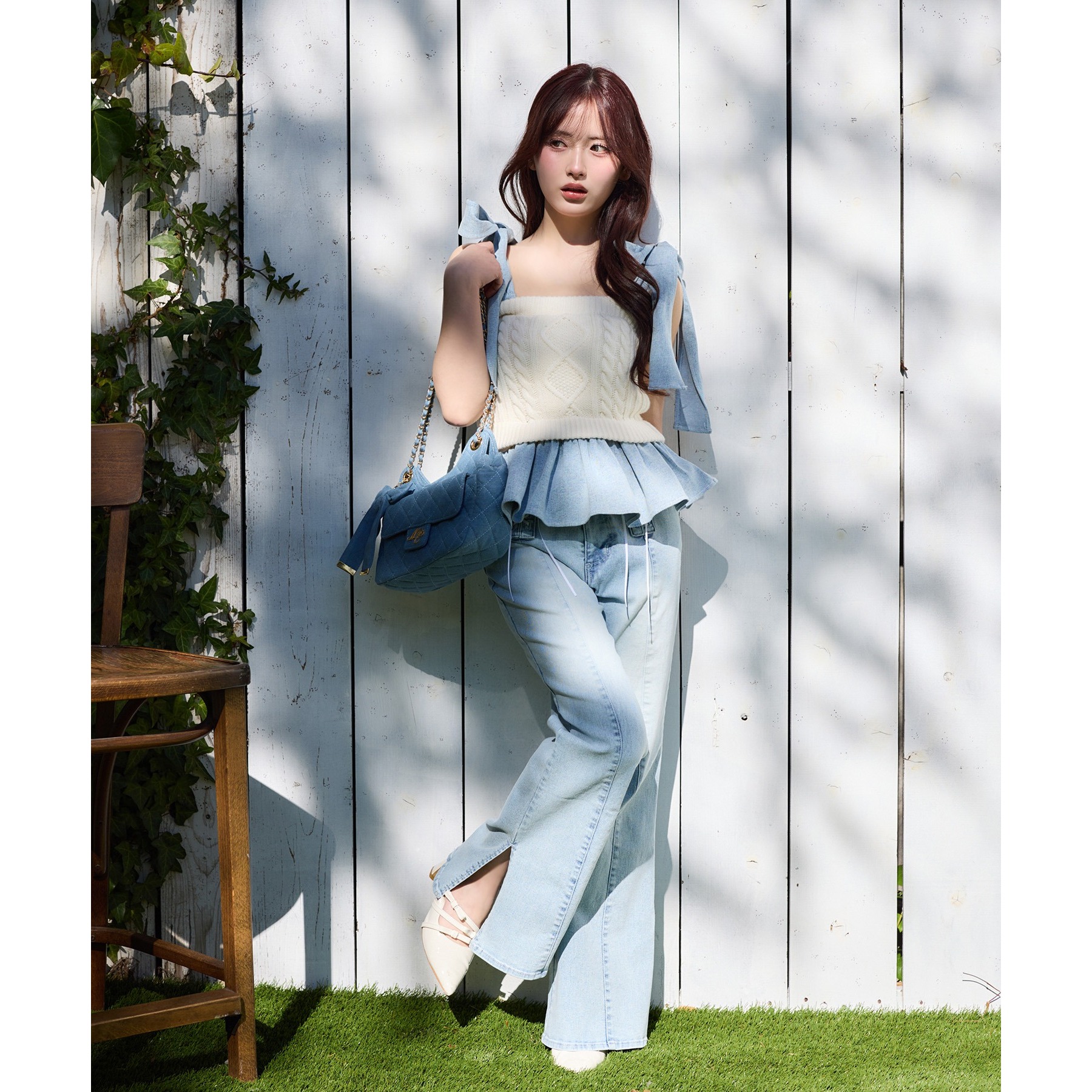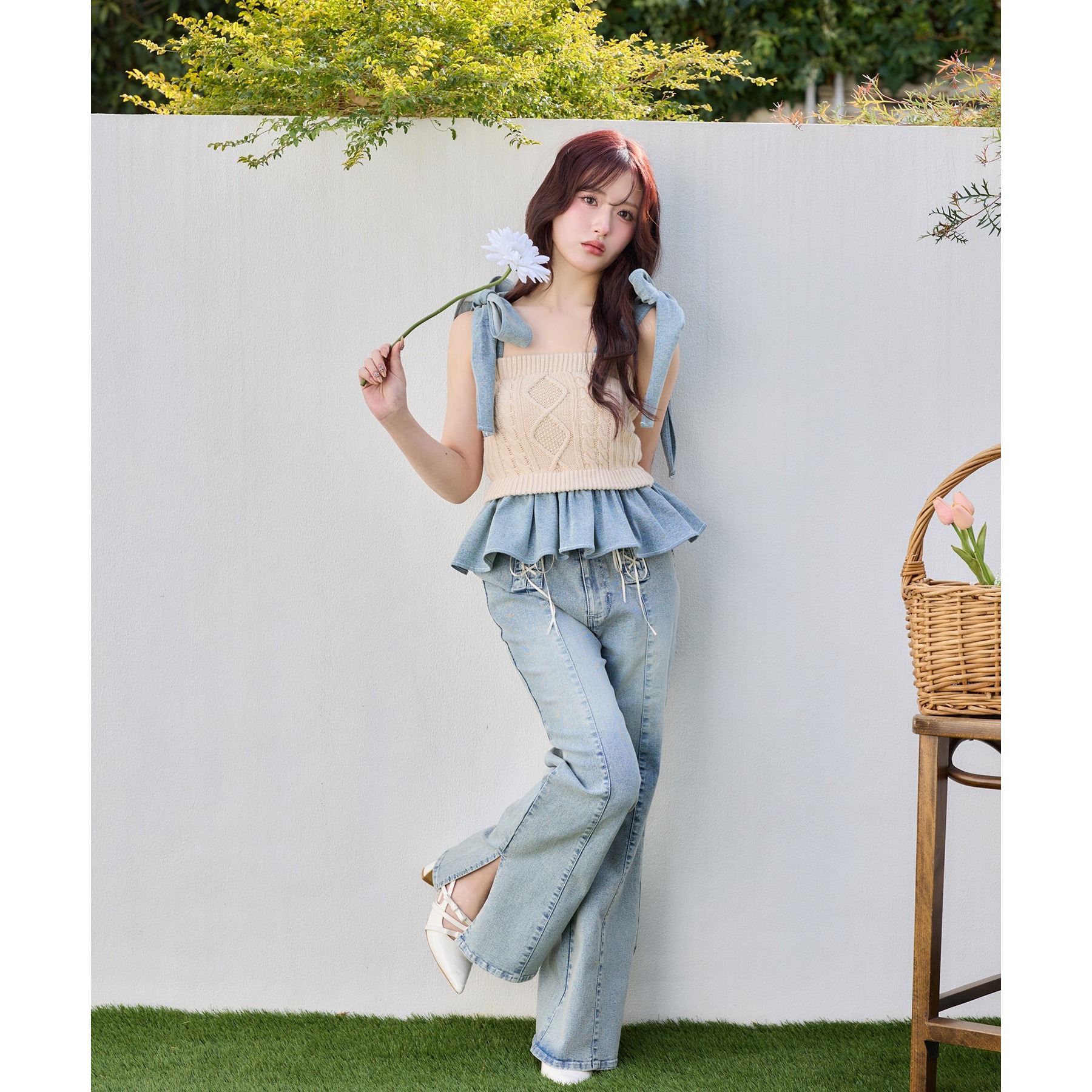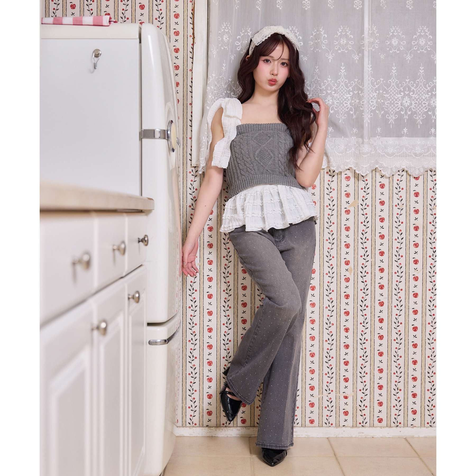 身ごろはケーブル編みニット、肩リボンと裾フリルにはデニム素材を使用した、異素材ミックスが可愛いビスチェ。