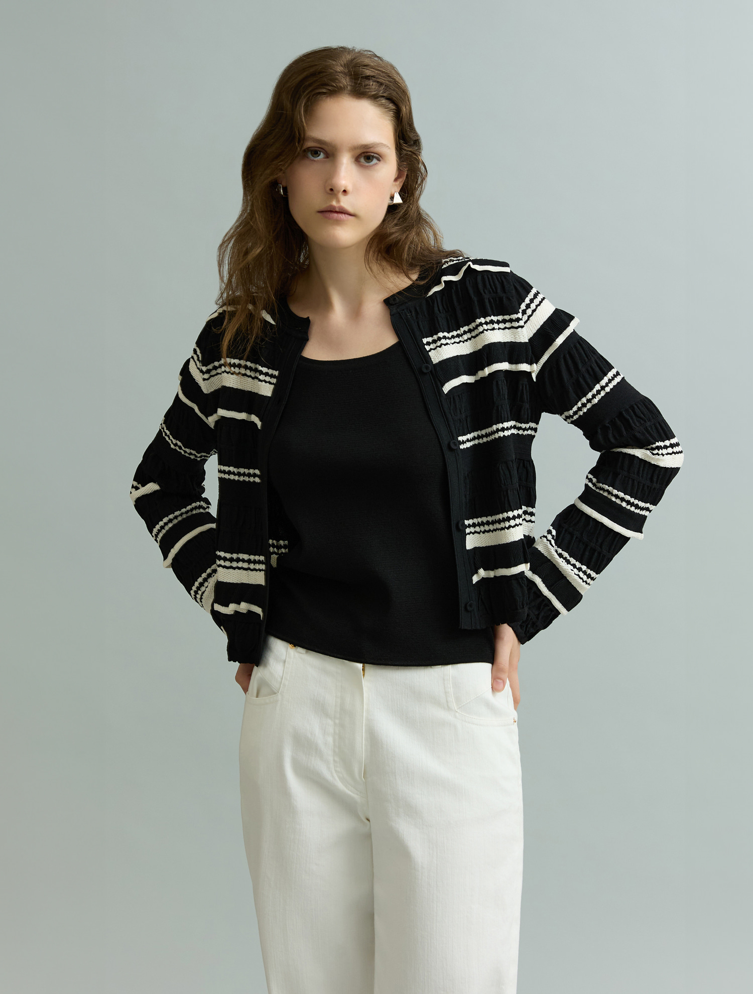 Frill Round Neck Cardigan - Black