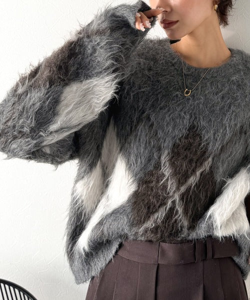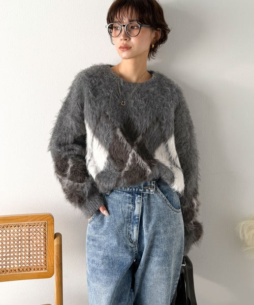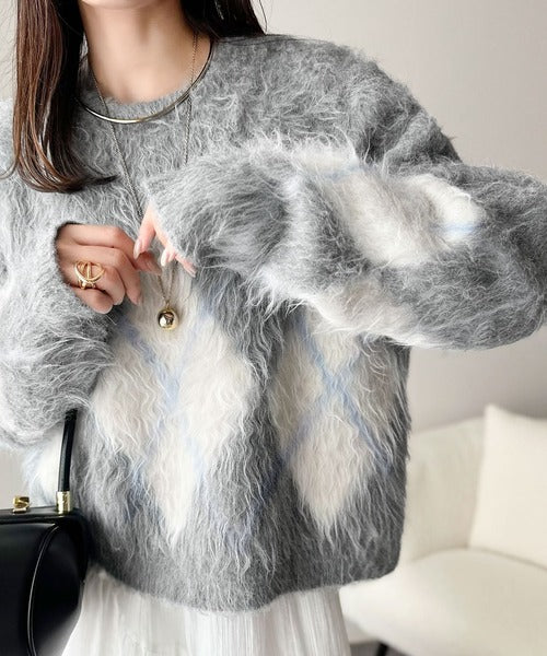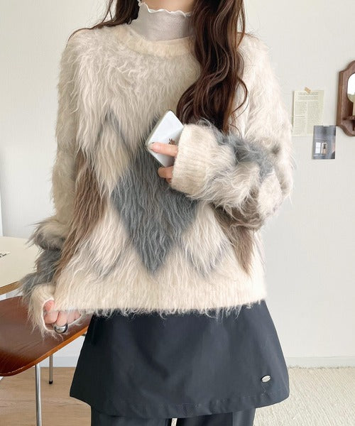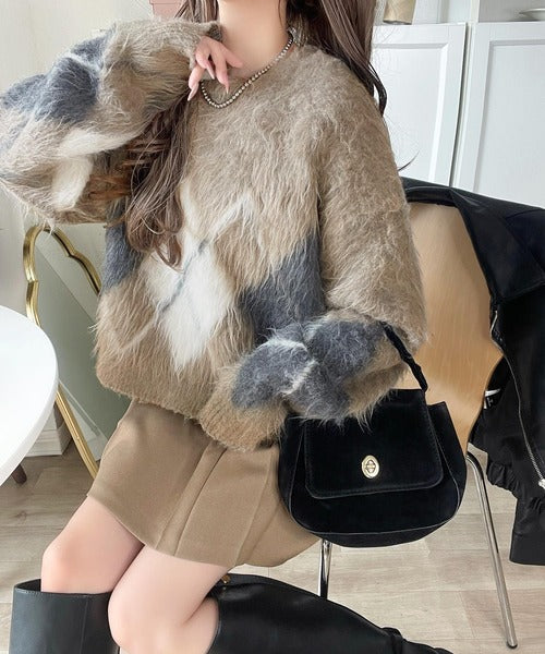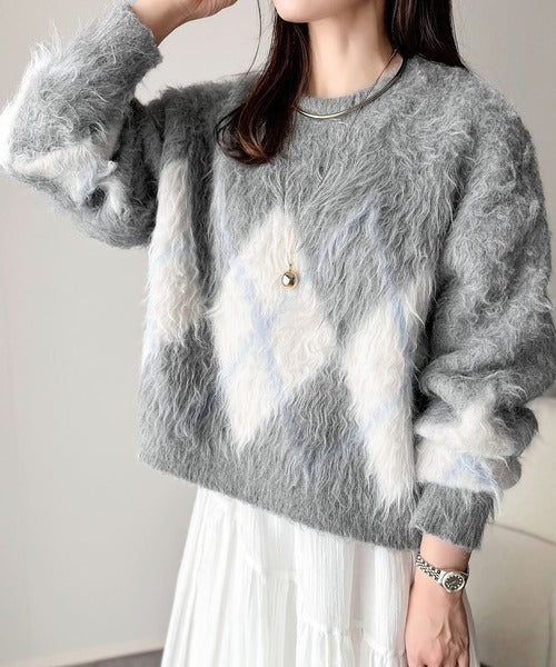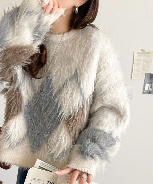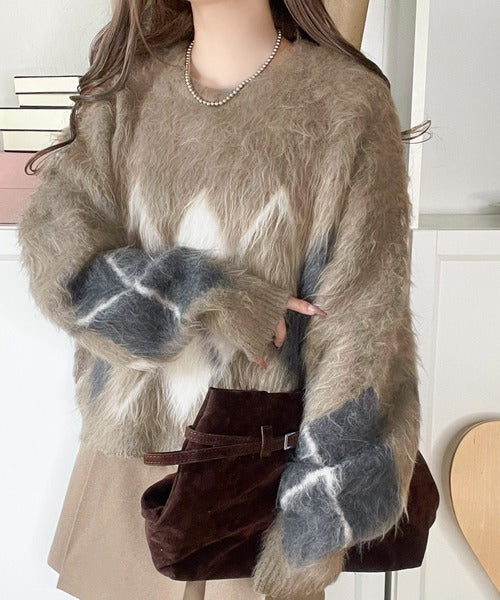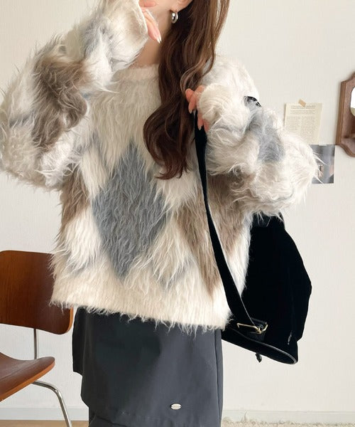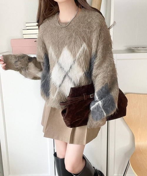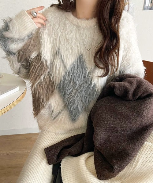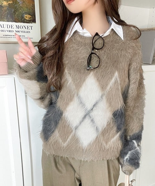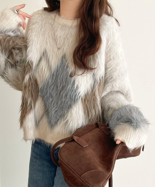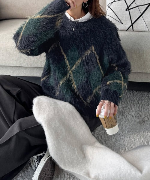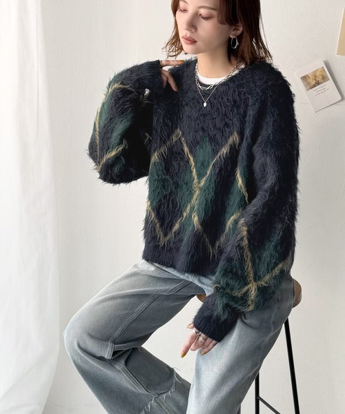 シンプルコーデに差をつける一着。長起毛アーガイル柄ニットプルオーバー ce1020328