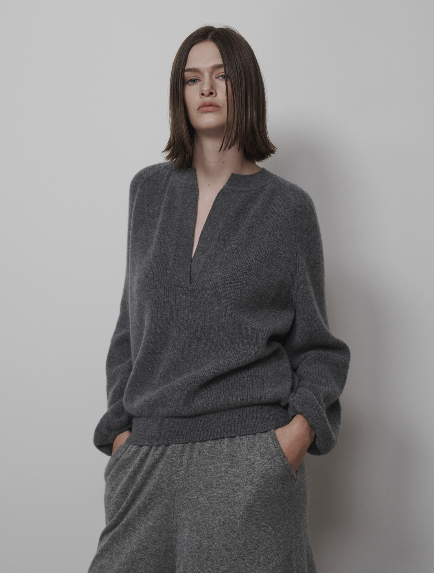 V-neck Puff Knit Top - Grey