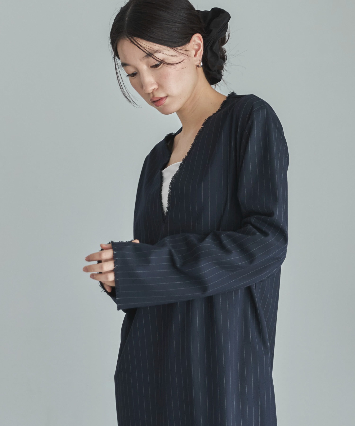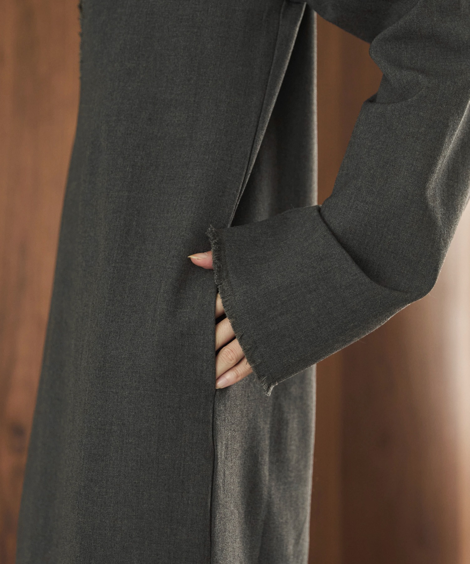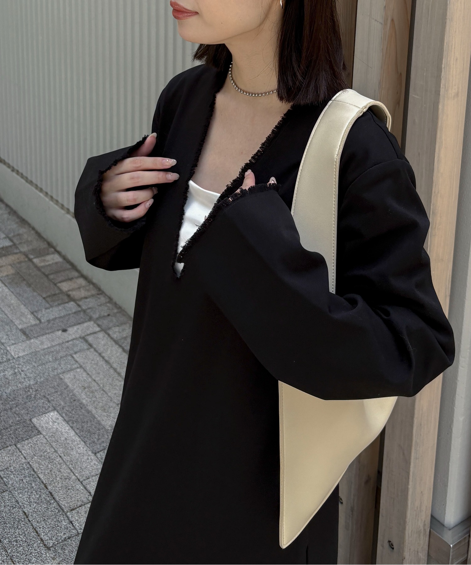 マニッシュでモードな雰囲気が漂う一着ですが、ネック部分や袖口にさりげなくフリンジ加工を施しているため抜け感が出てややカジュアルな印象にもスタイリングを楽しめます◎
