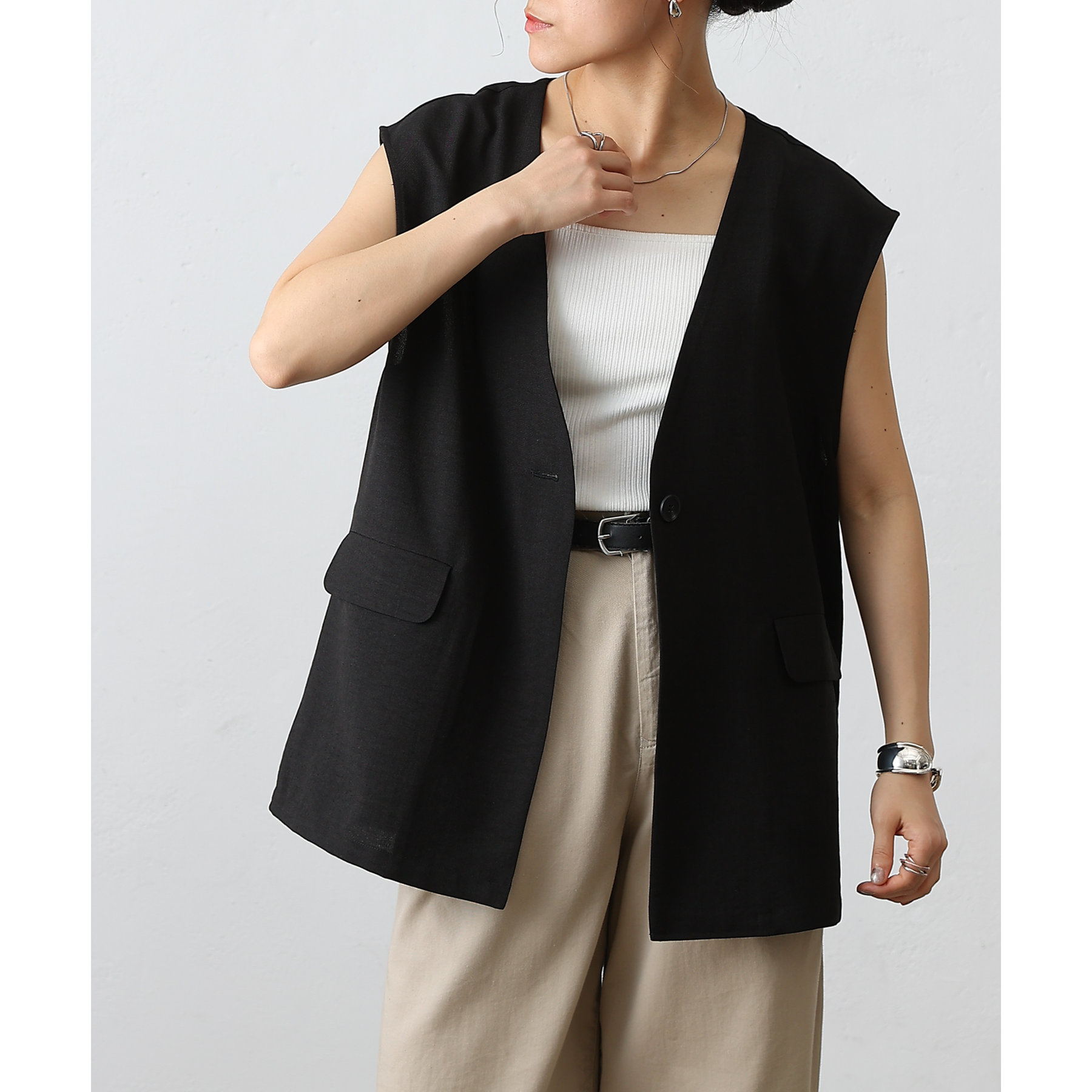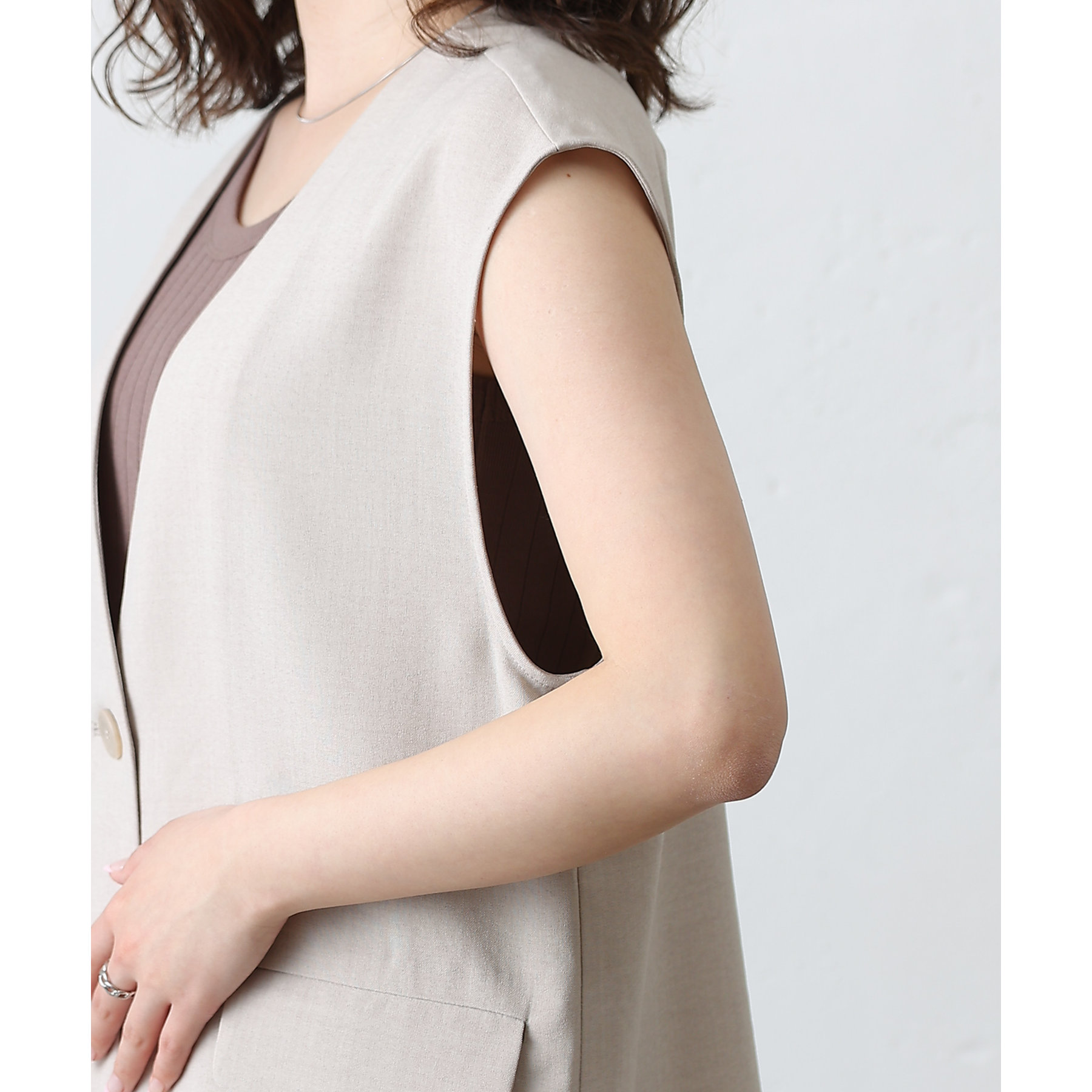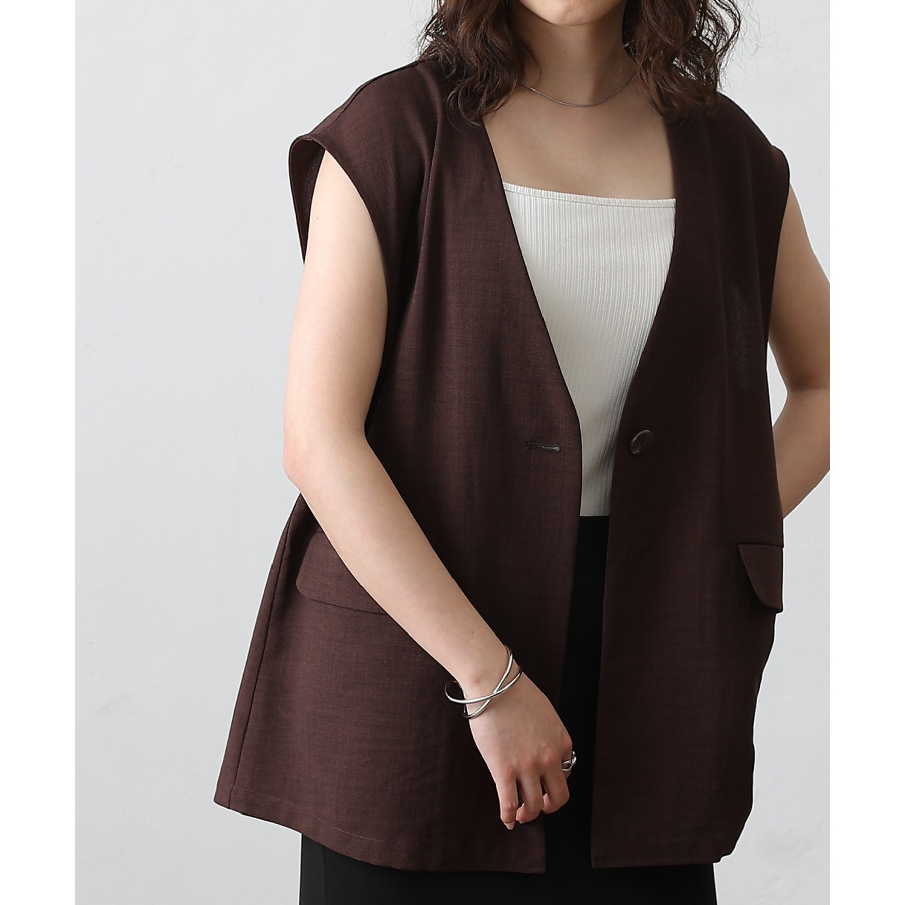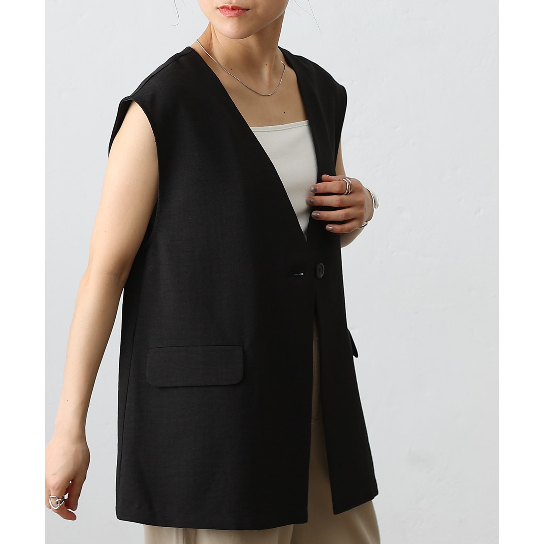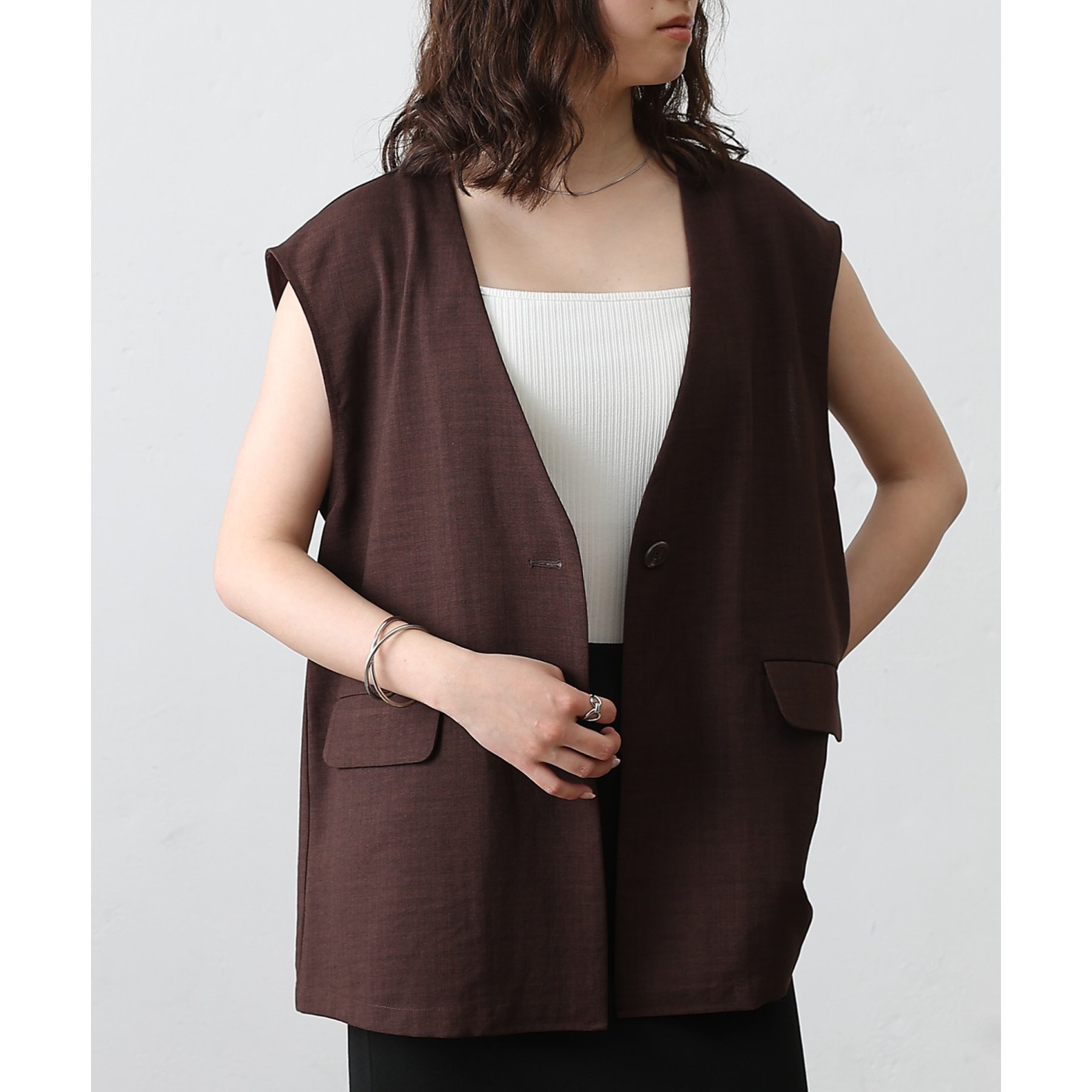 普段のコーデに1枚合わせるだけで、すっきり上品見えが叶うノーカラージレ。