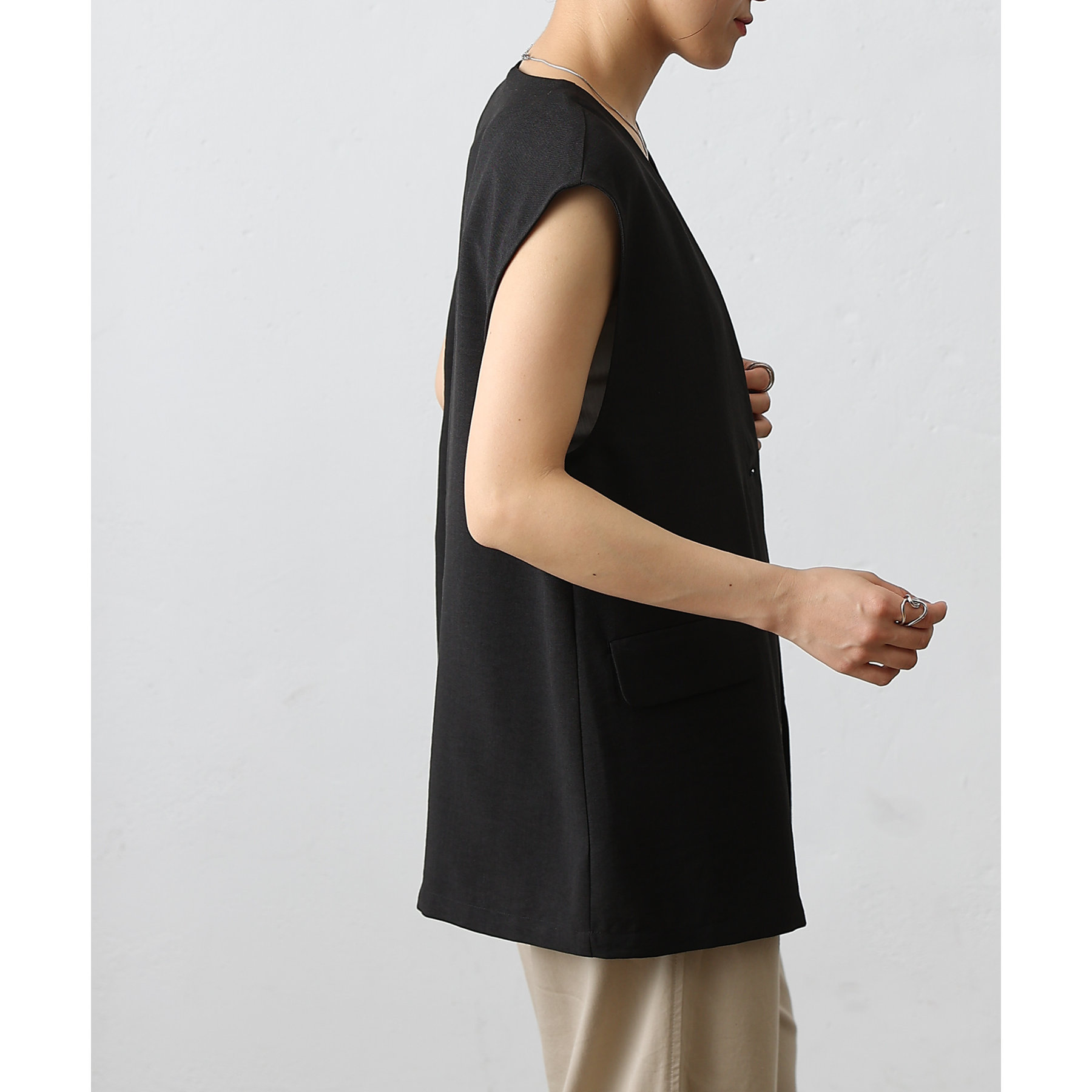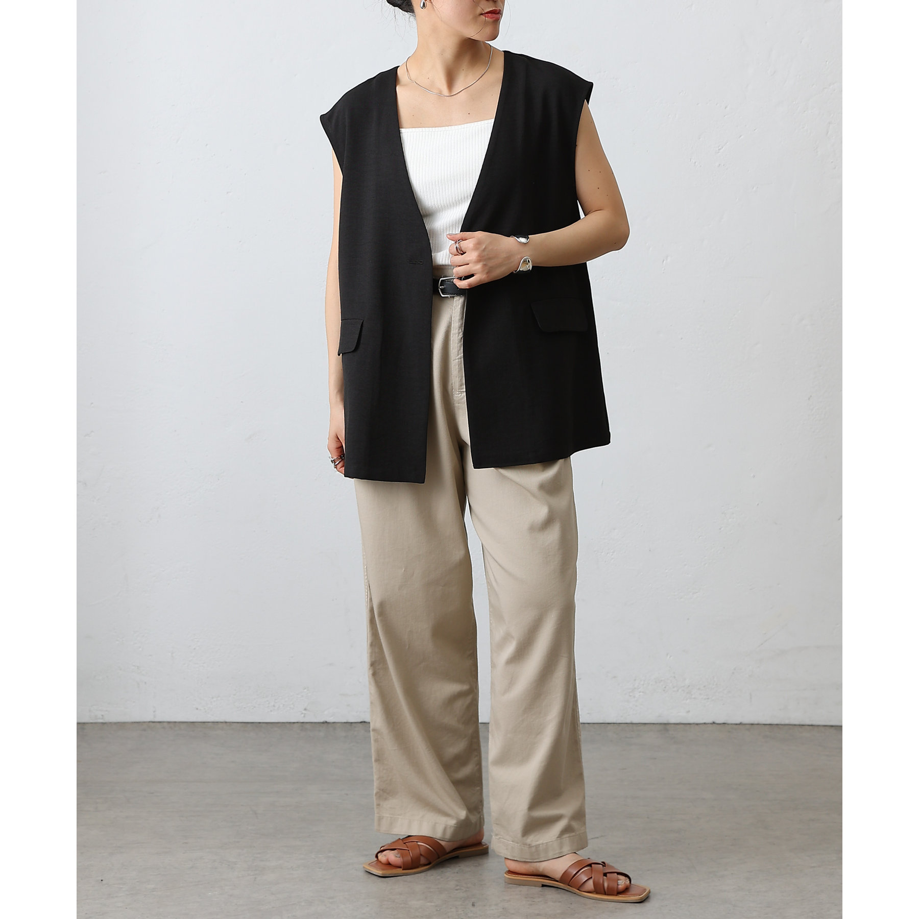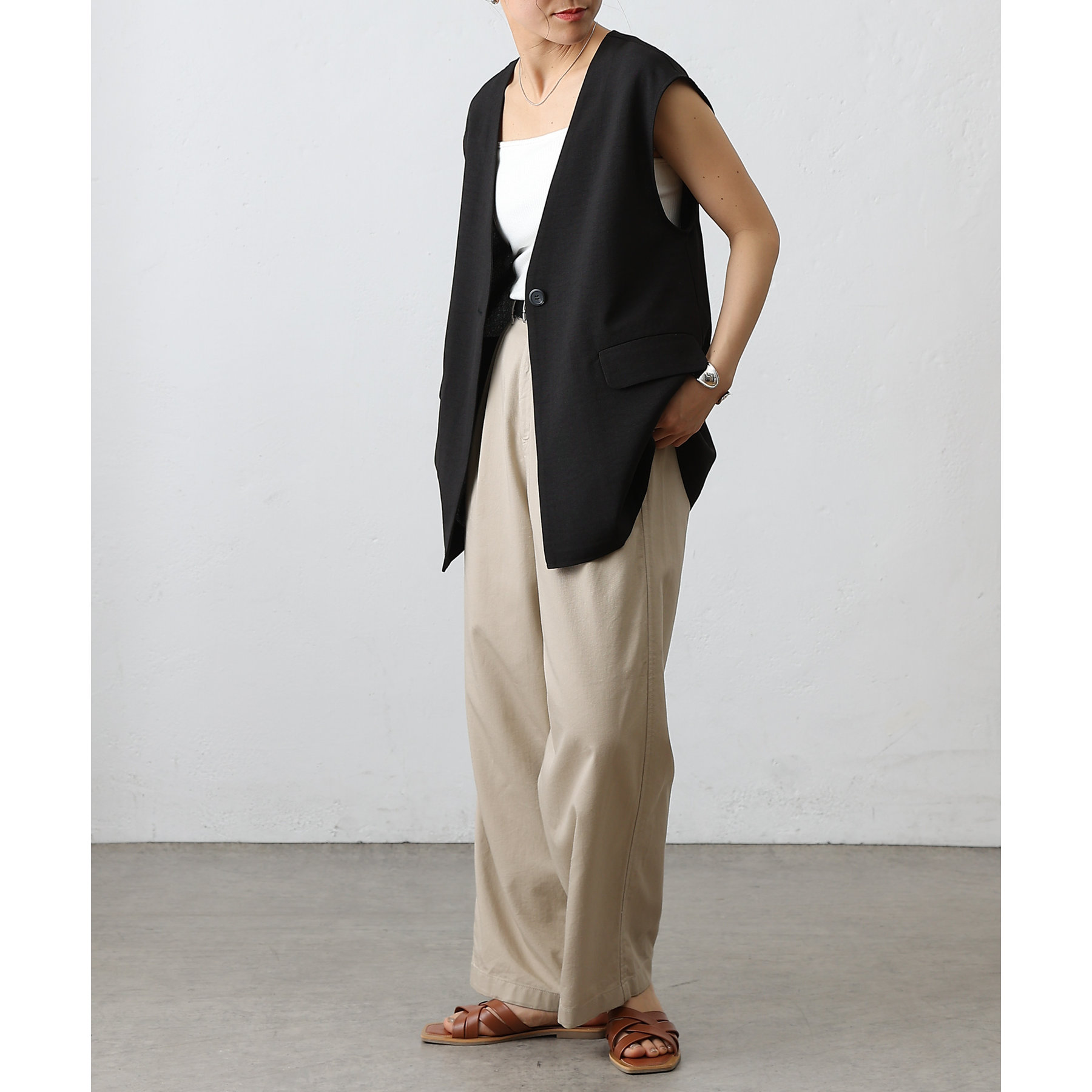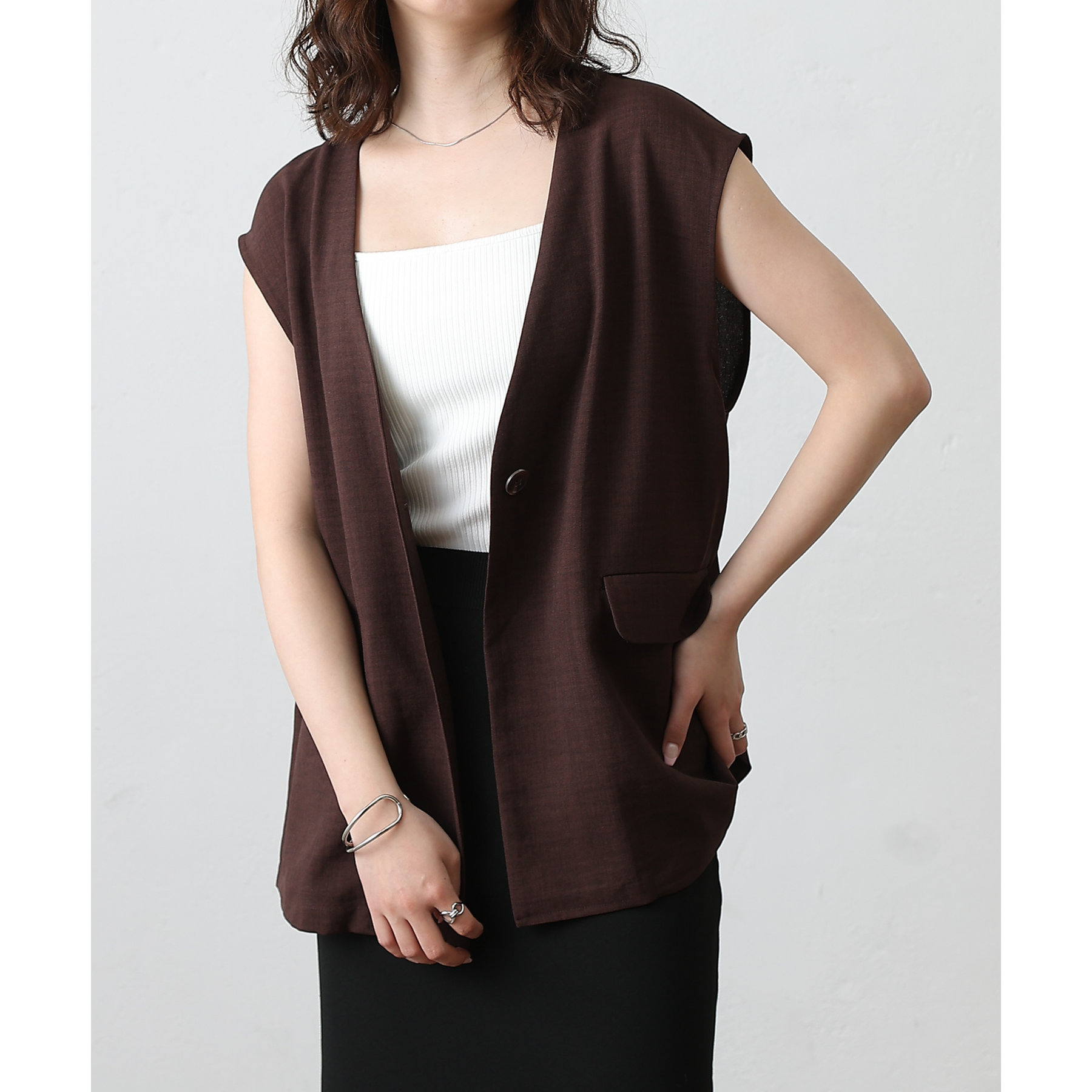 普段のコーデに1枚合わせるだけで、すっきり上品見えが叶うノーカラージレ。