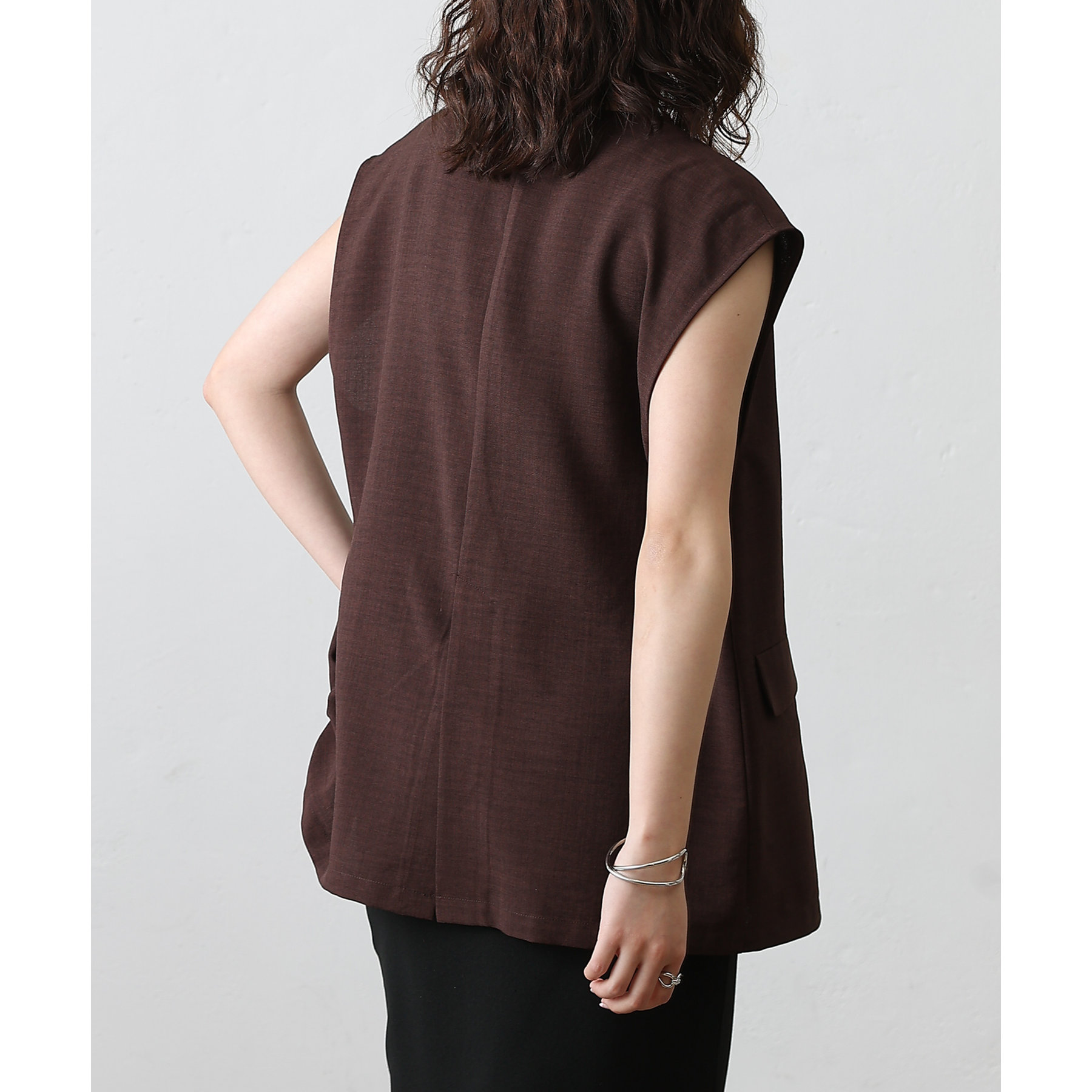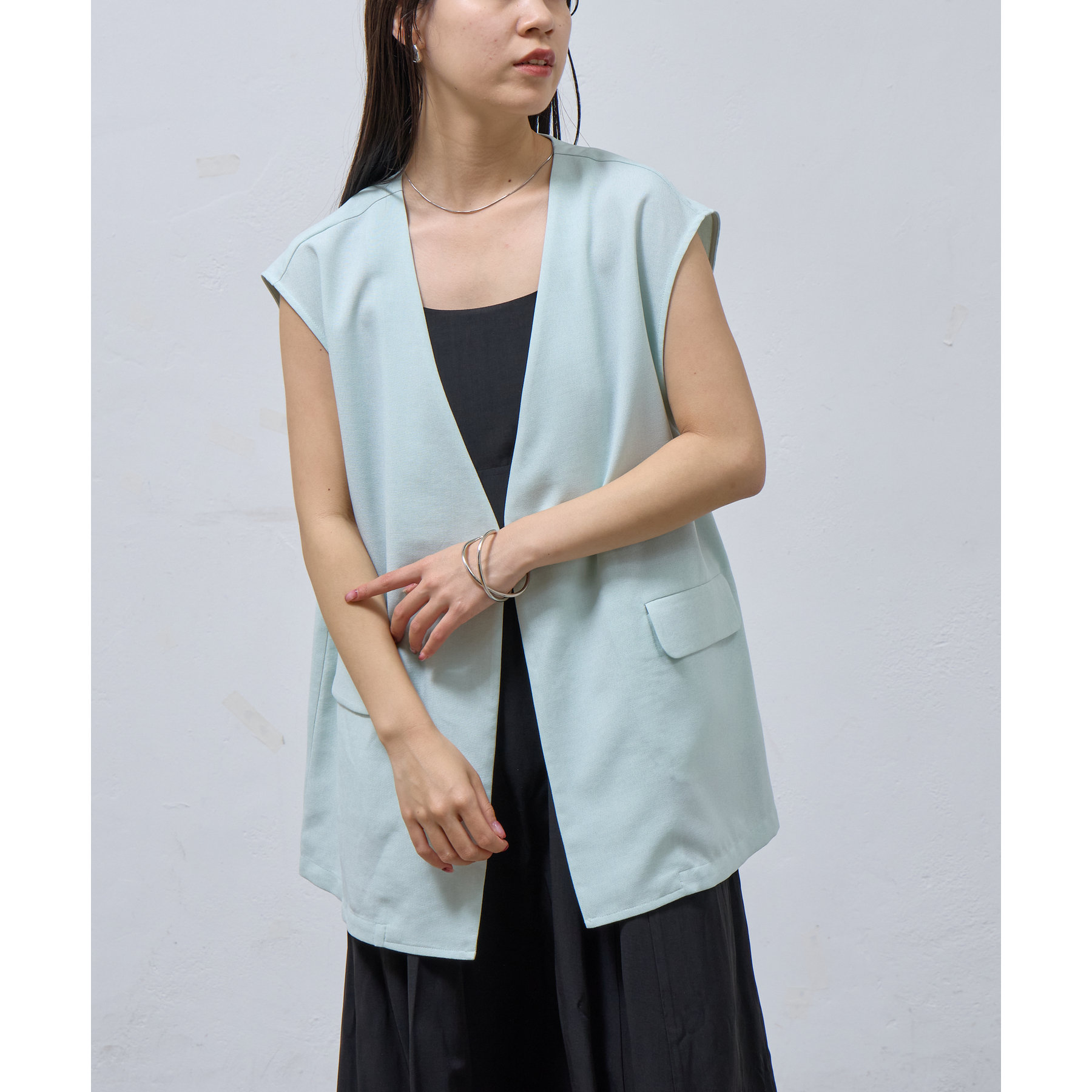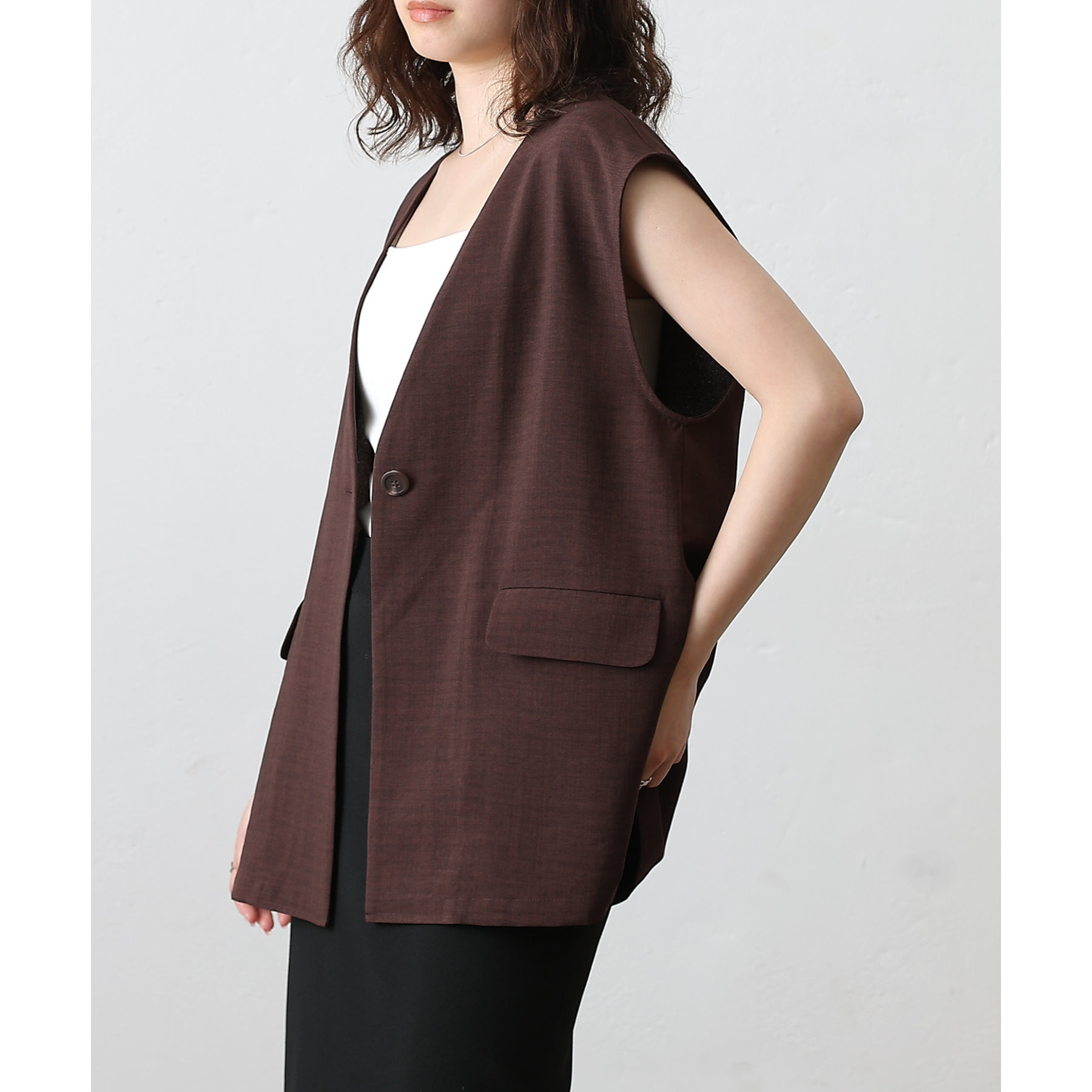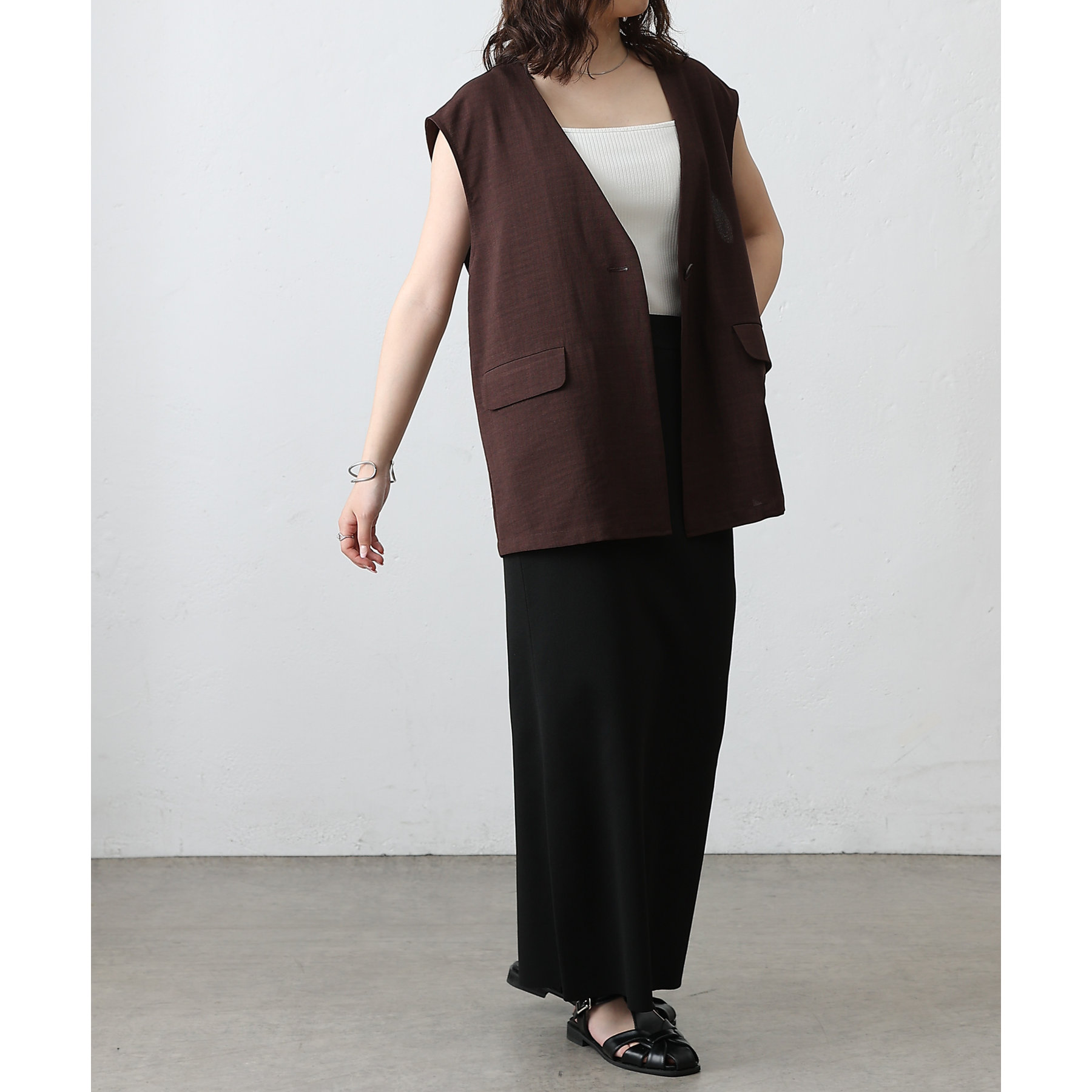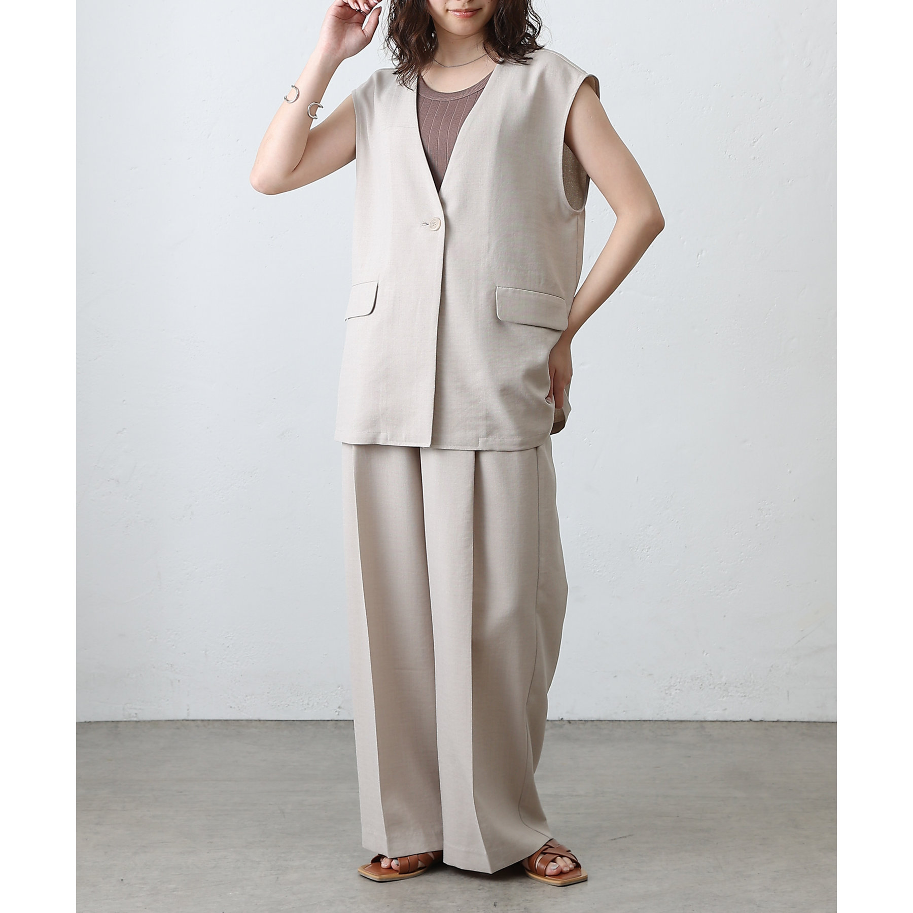 普段のコーデに1枚合わせるだけで、すっきり上品見えが叶うノーカラージレ。