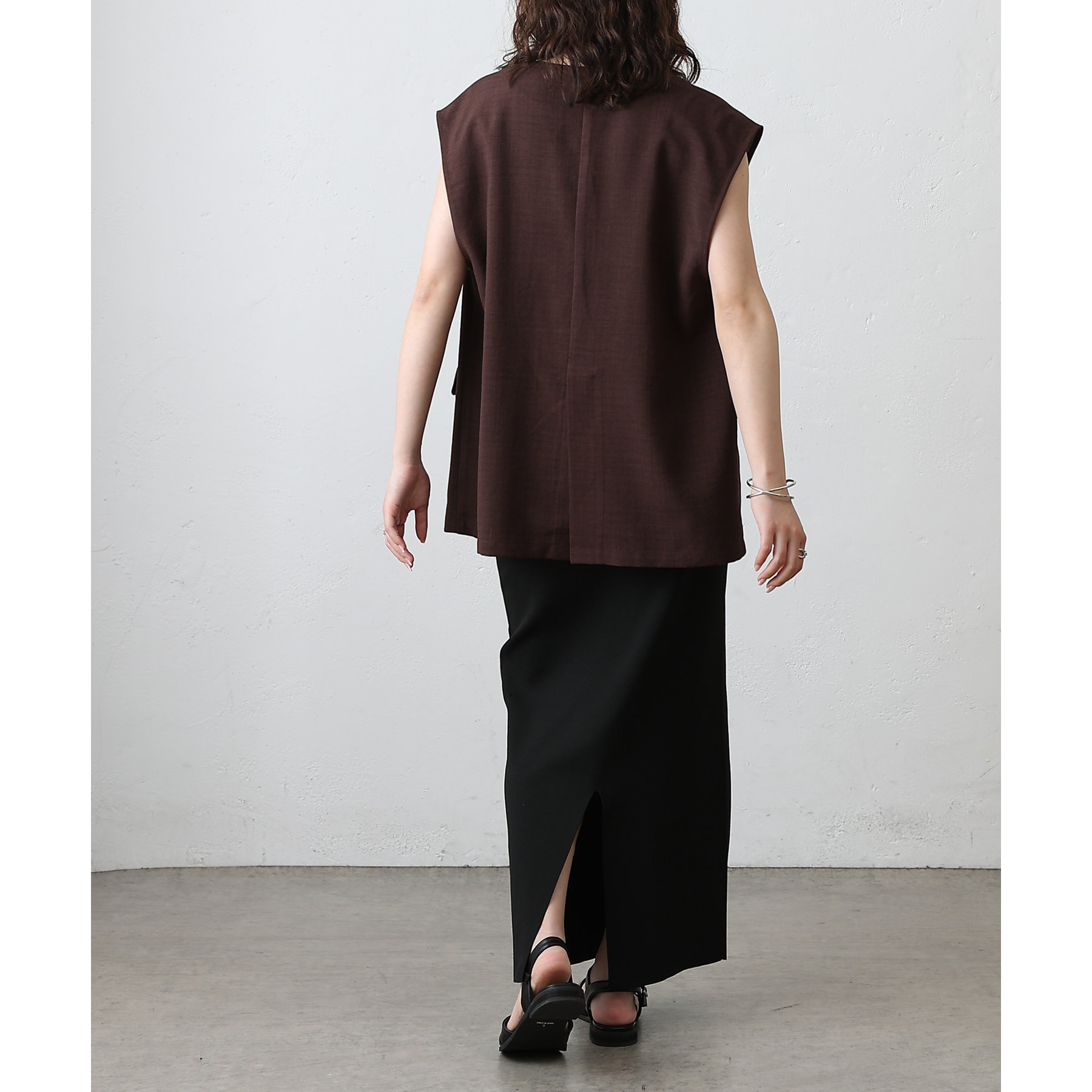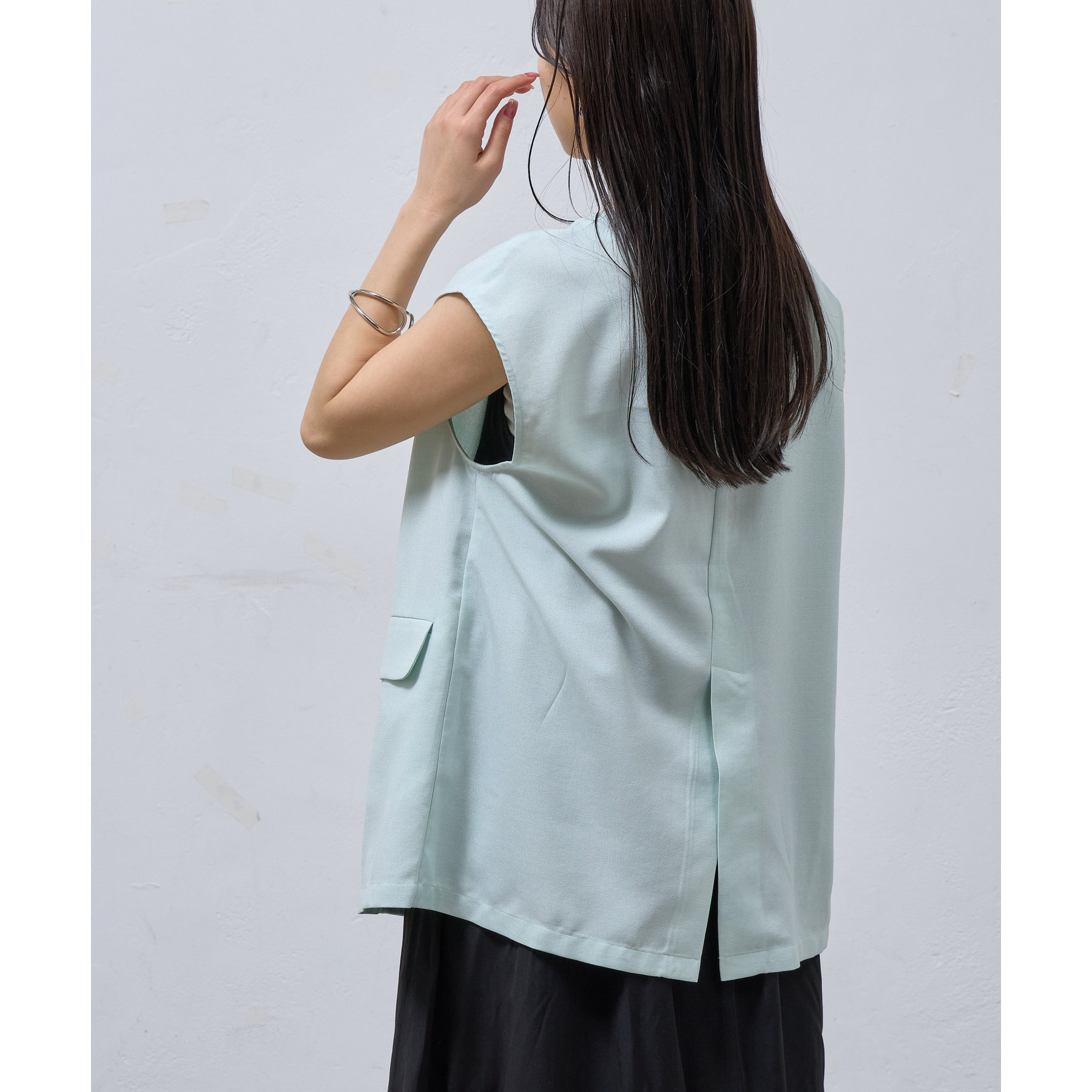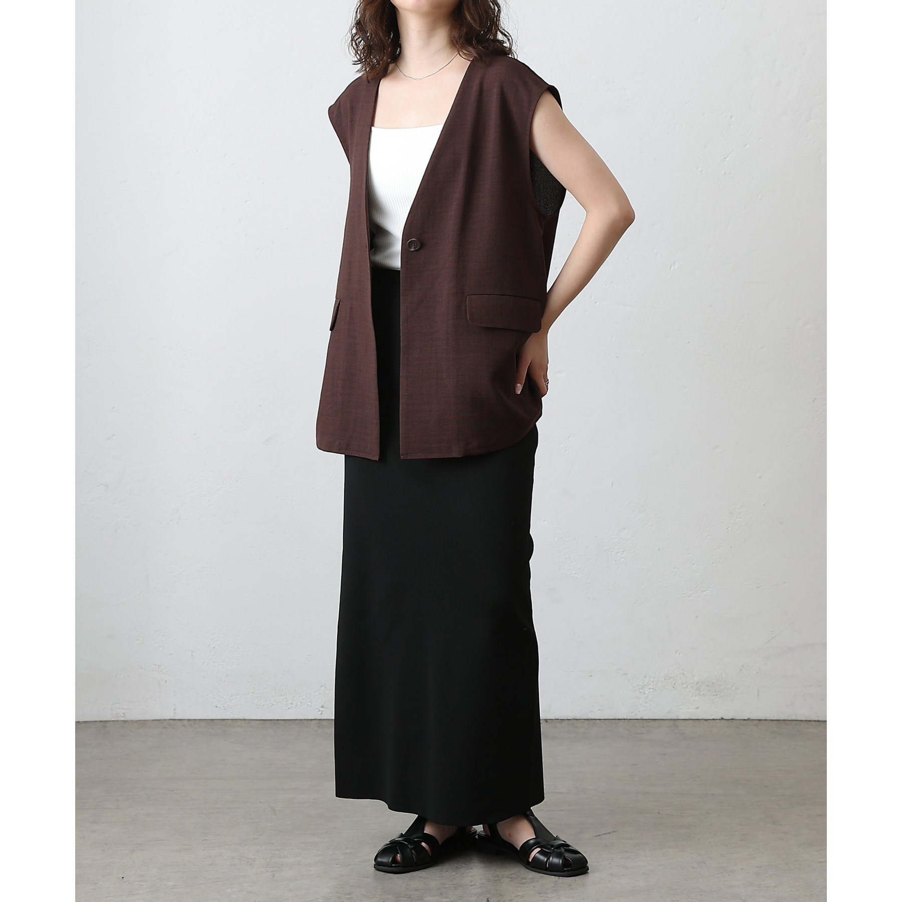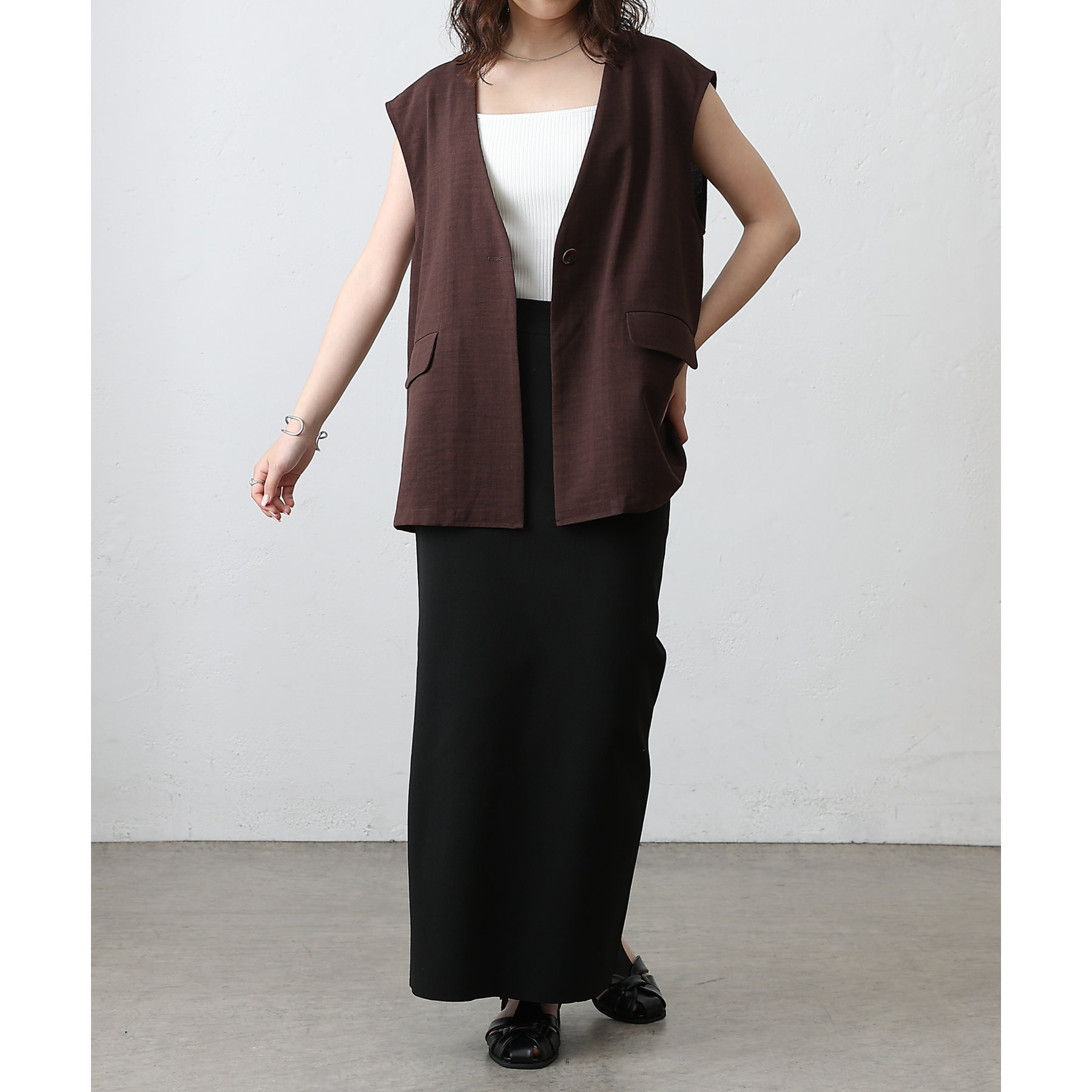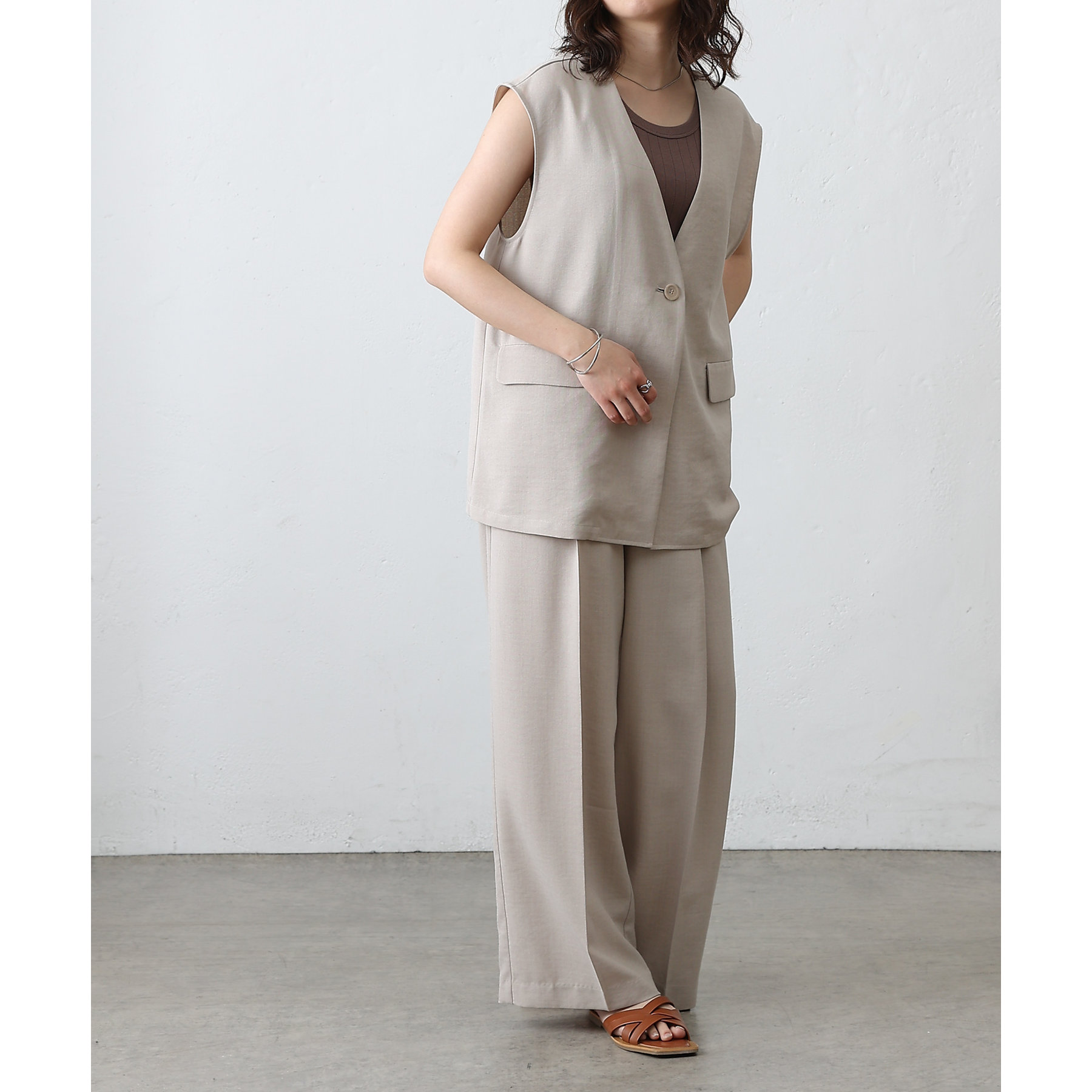 普段のコーデに1枚合わせるだけで、すっきり上品見えが叶うノーカラージレ。