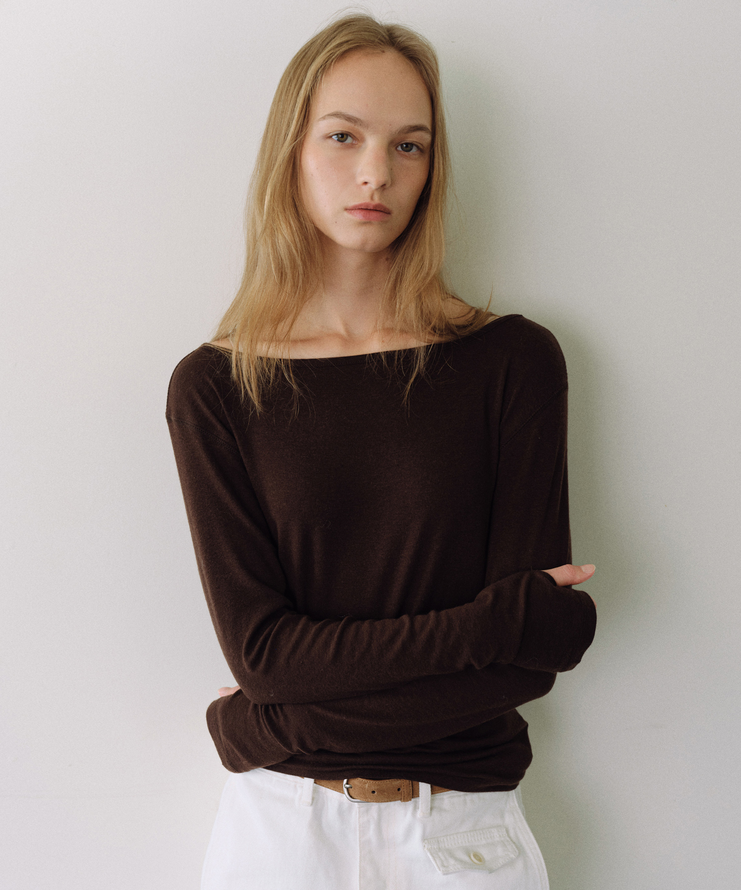 - ロングスリーブTシャツは前後ともに同じ深さのボートネックデザインで、首元を華奢に見せ、アームホール部分に施したステッチディテールがシンプルながらも繊細な魅力を引き立てます。