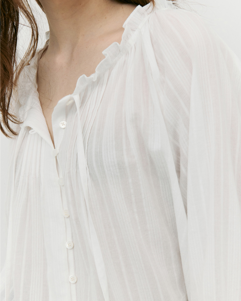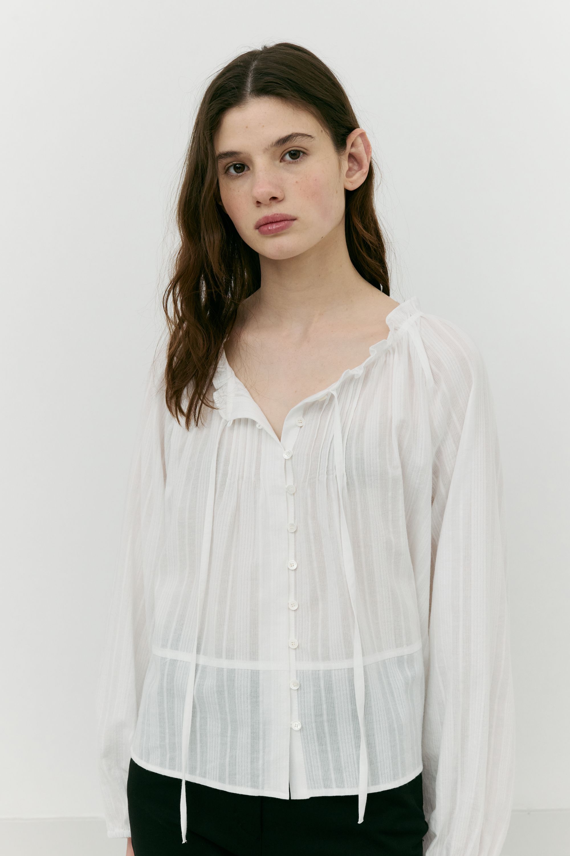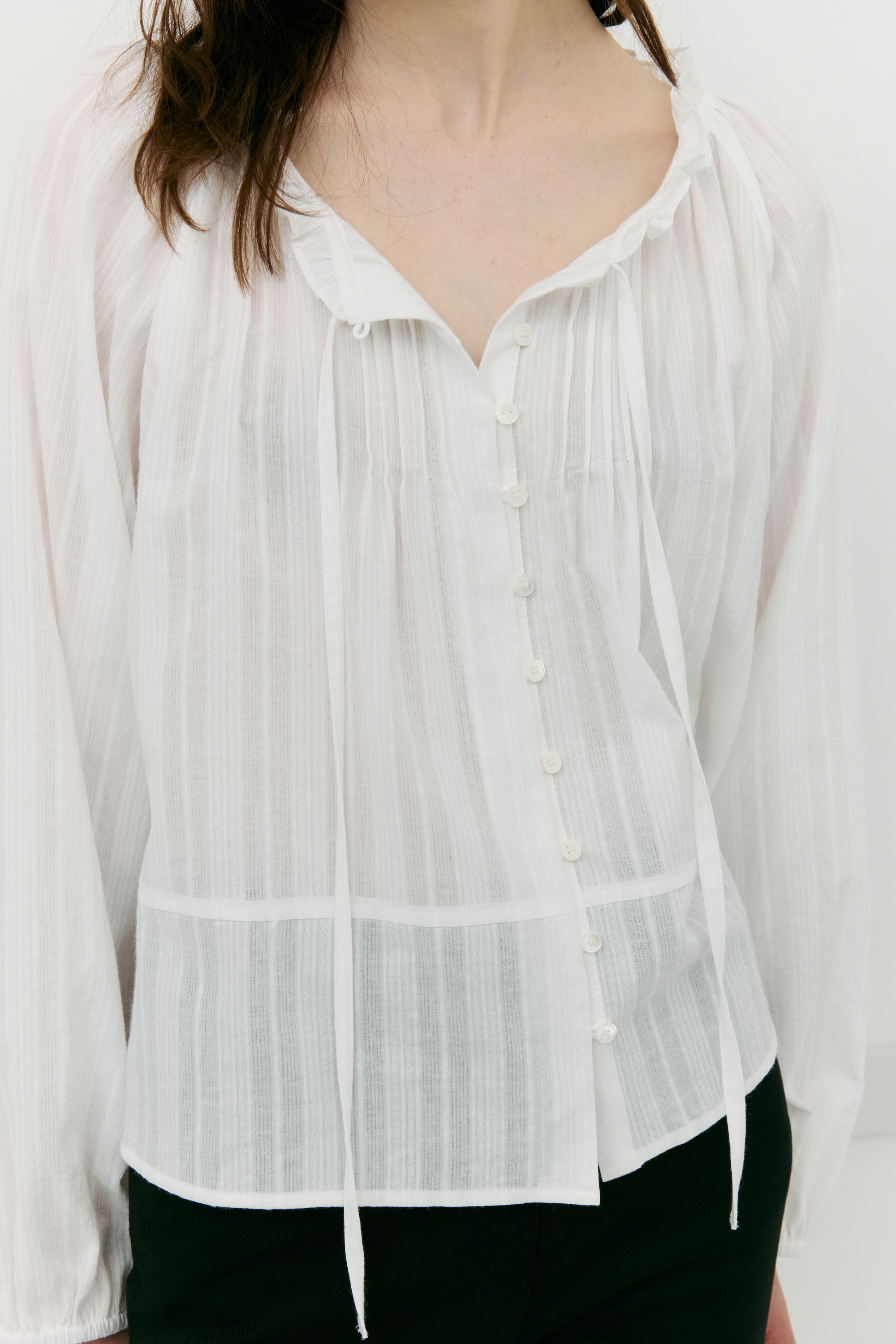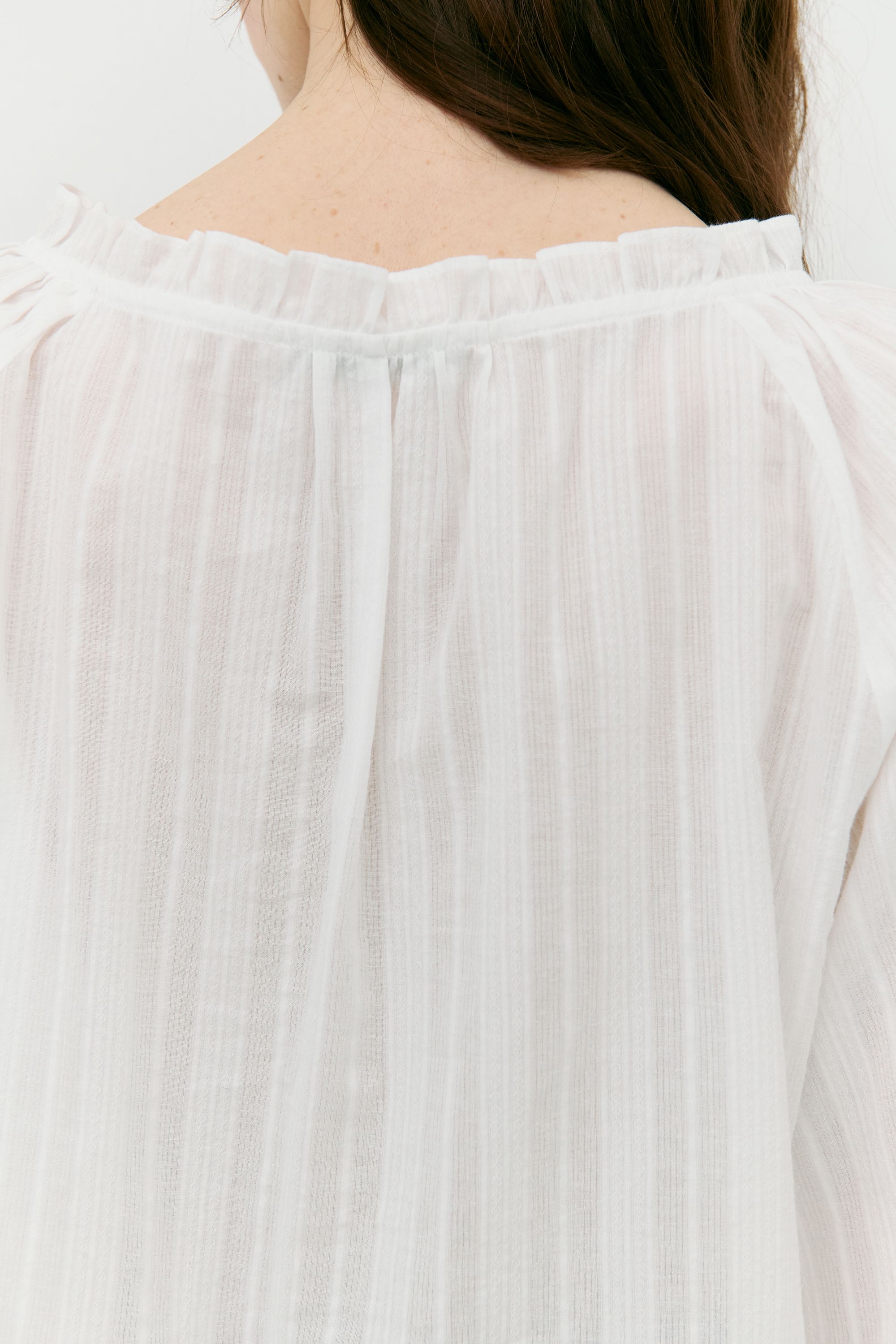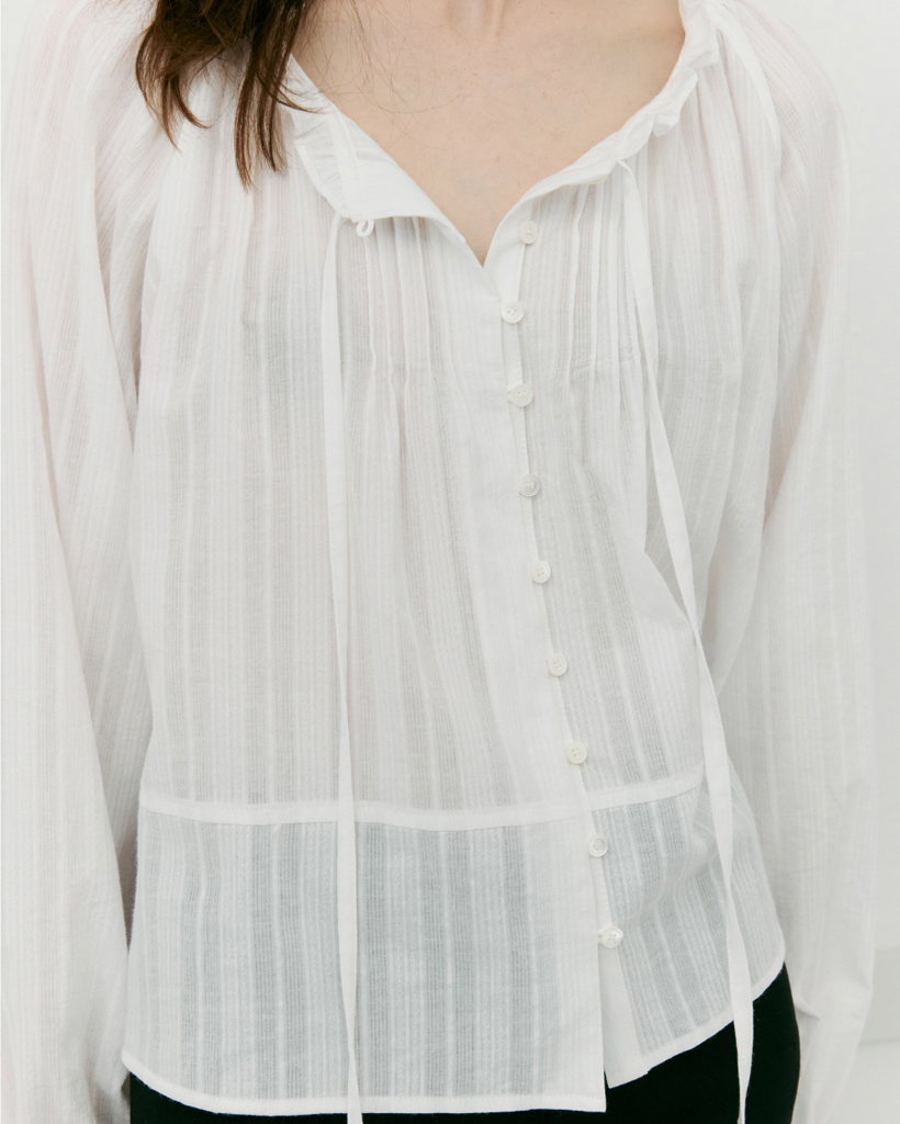 ほのかな柄感のある軽やかなコットン素材を使用し、フェミニンなムードを演出するブラウスです。