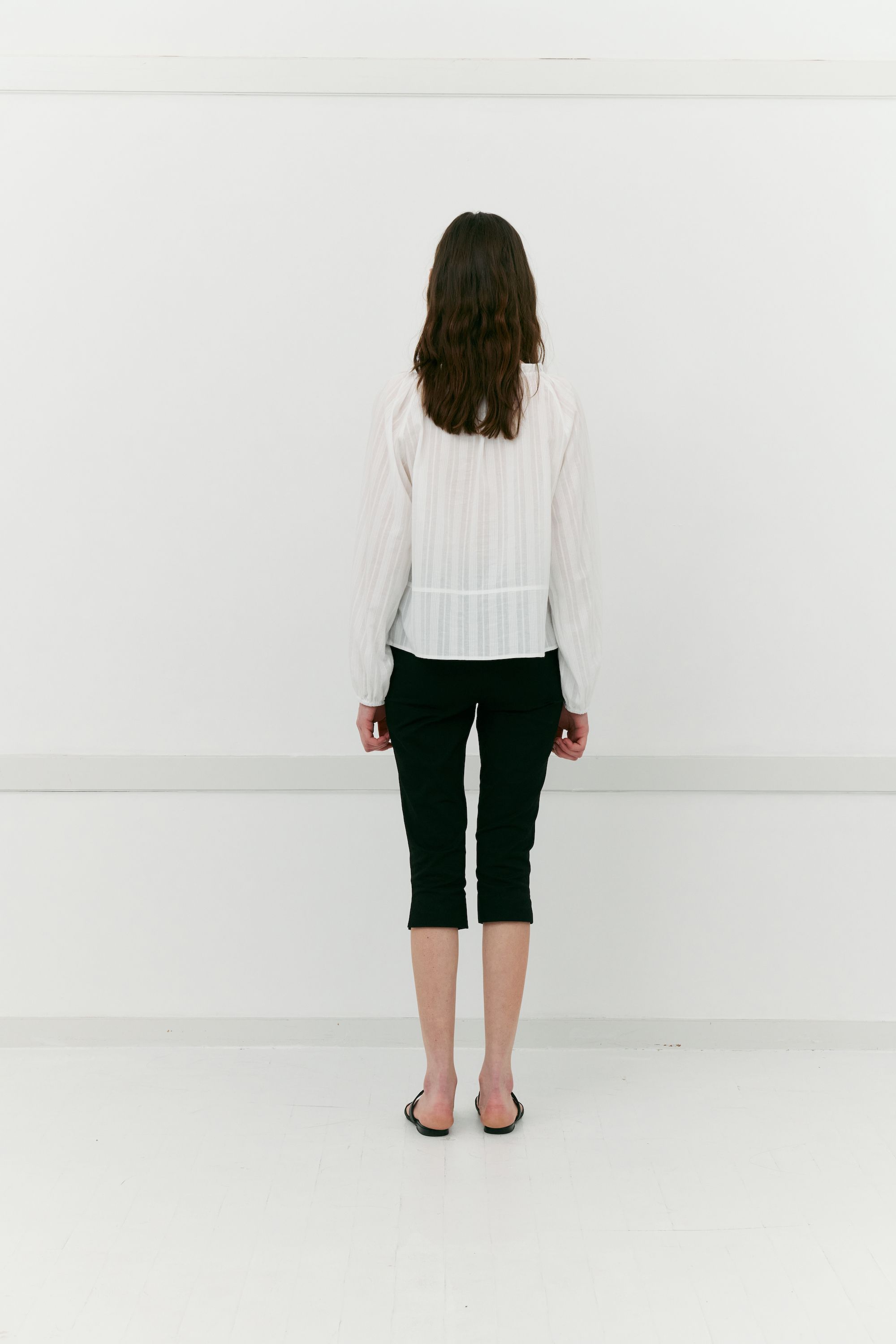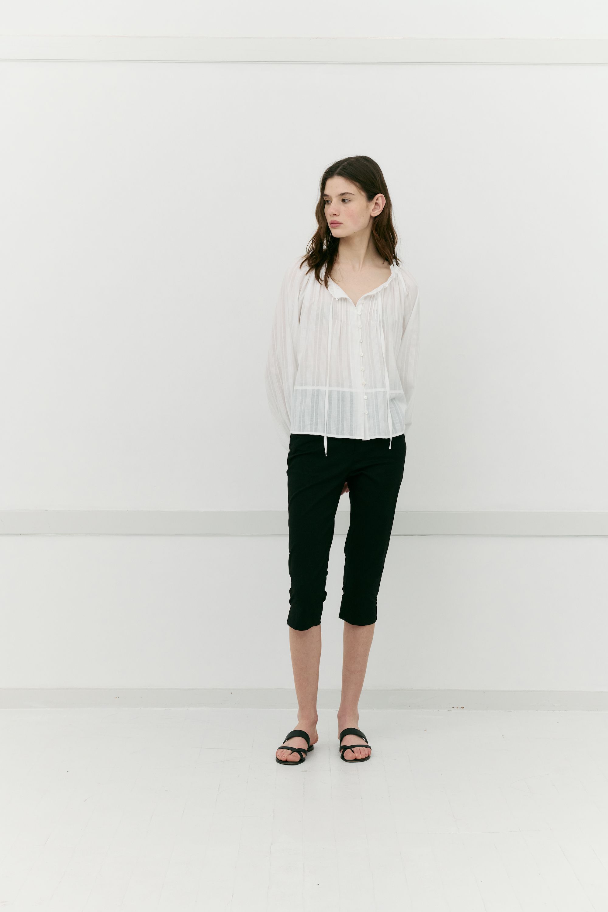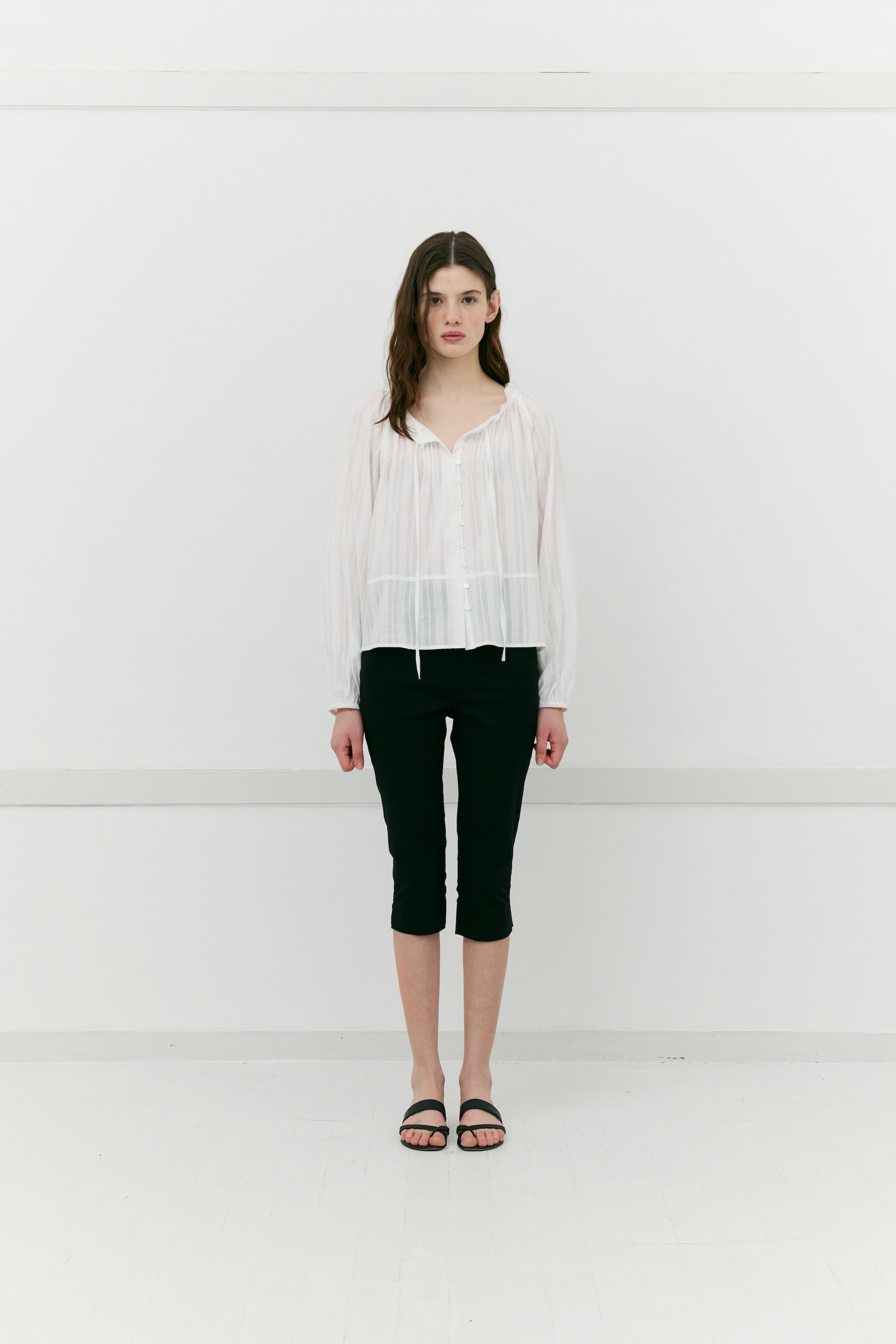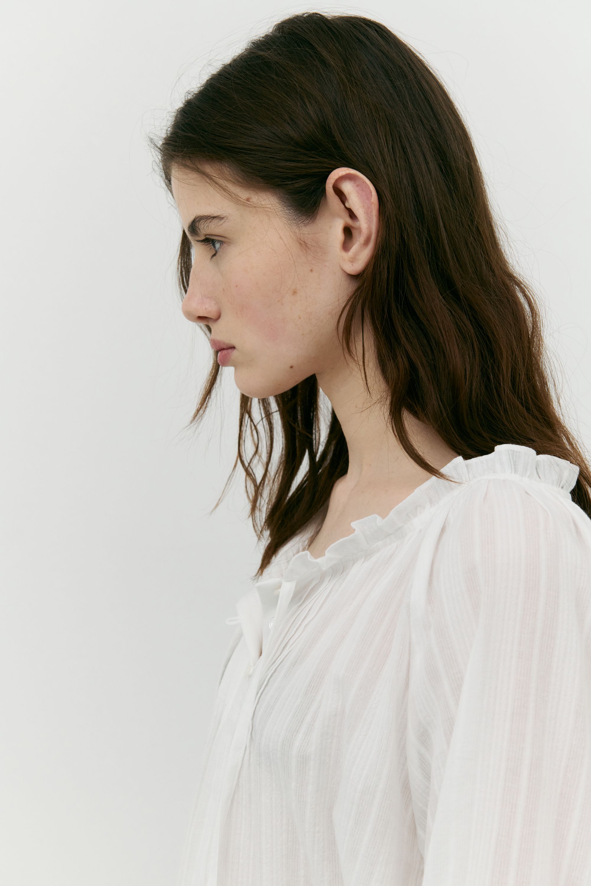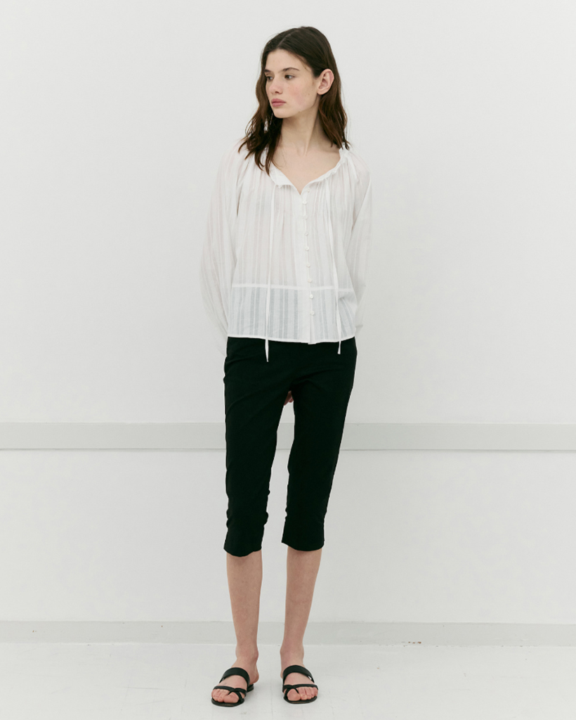 ほのかな柄感のある軽やかなコットン素材を使用し、フェミニンなムードを演出するブラウスです。