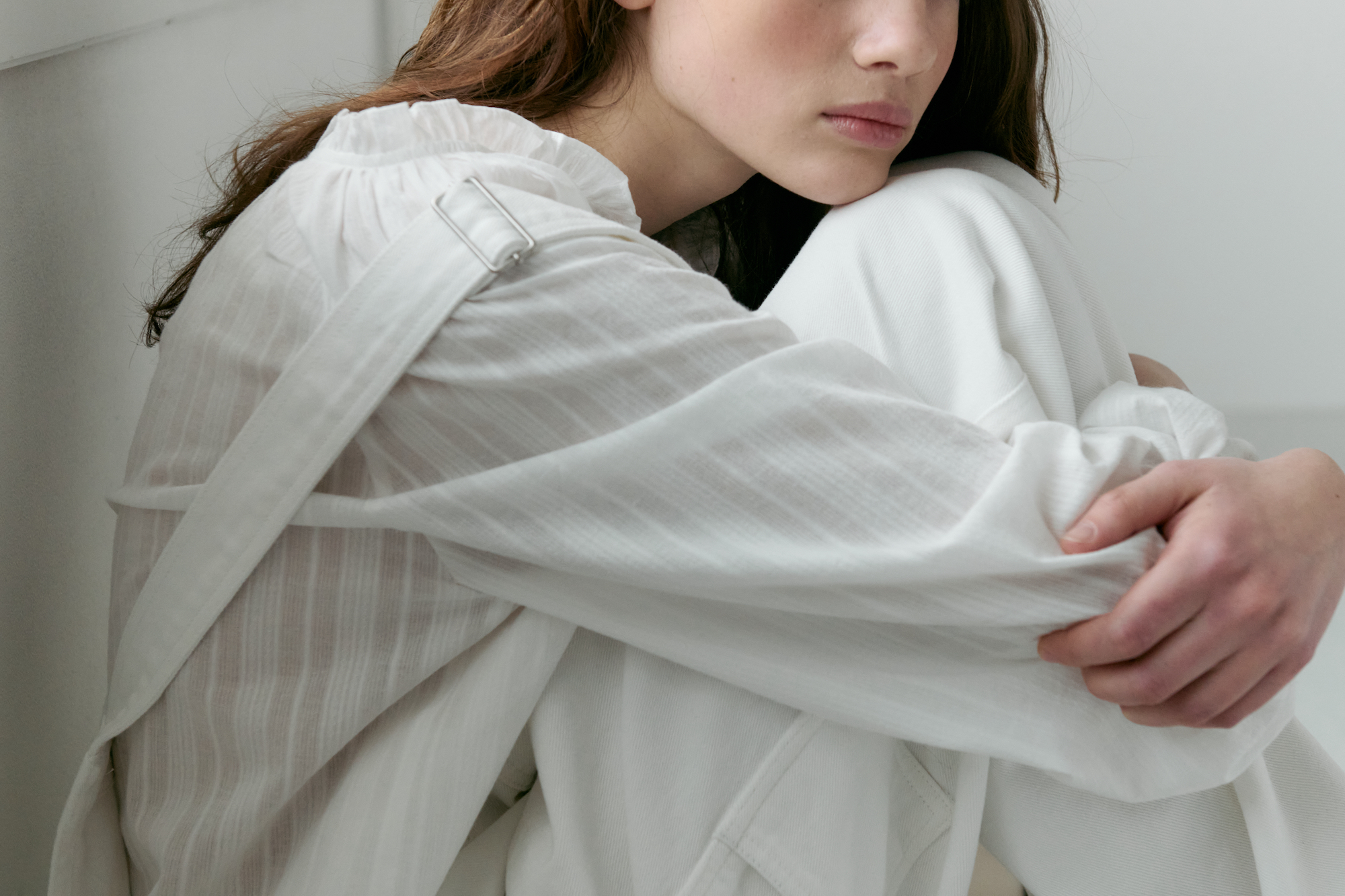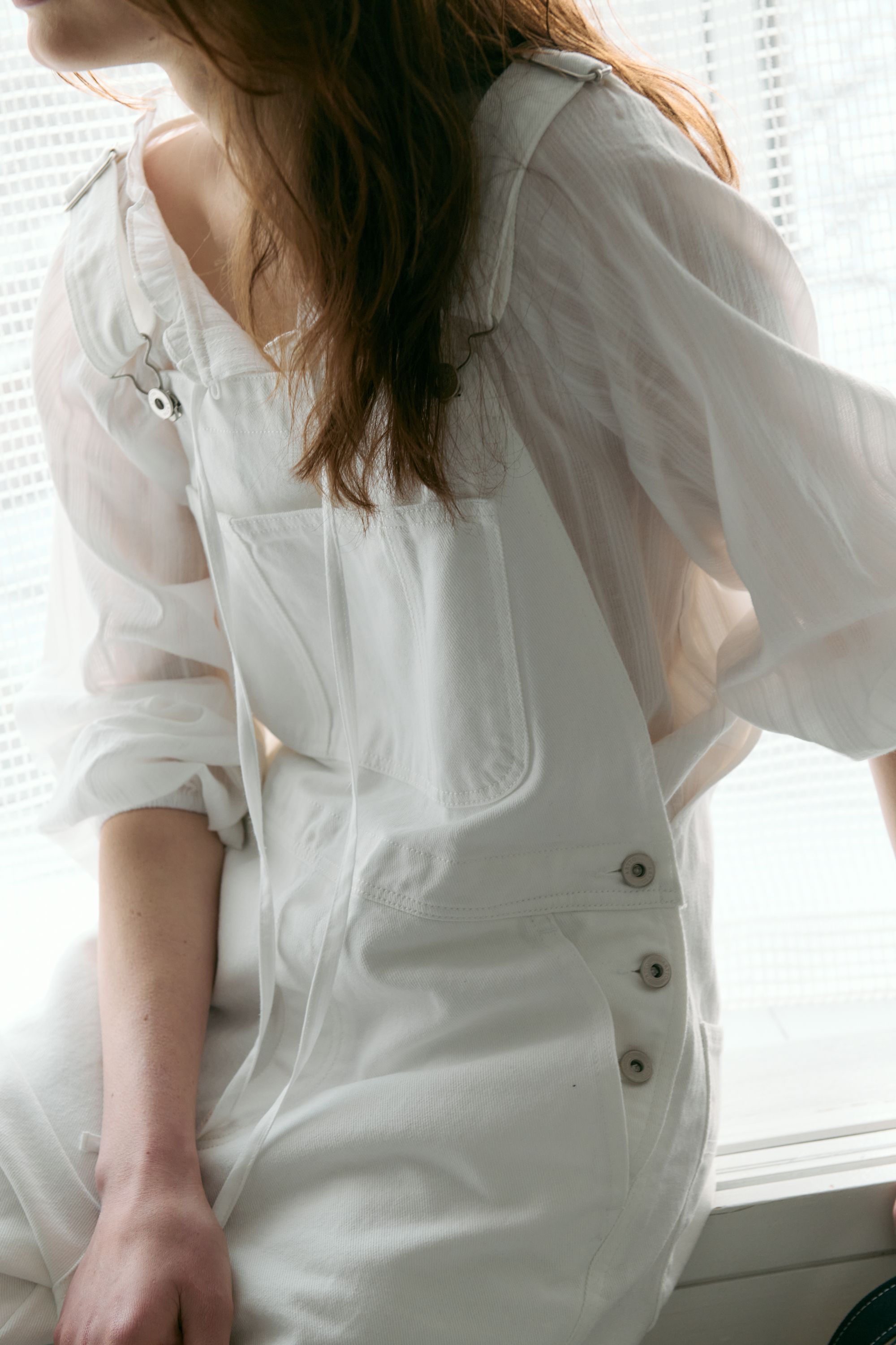 フロントネック中央のストラップディテールは、リボン結びにしたり、ラフに垂らしたりと、さまざまなスタイリングを楽しめます。