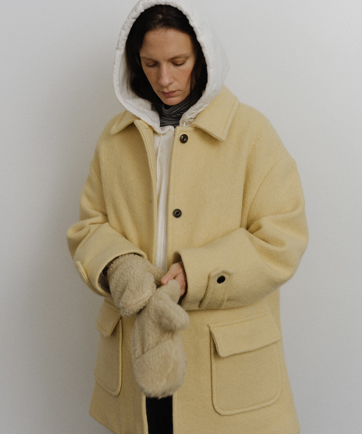 - 表面はブークレのように立体感のあるテクスチャーが特徴で、内側にはボンディング加工を施し、保温性を高めながら形が崩れにくい安定感を持たせました。