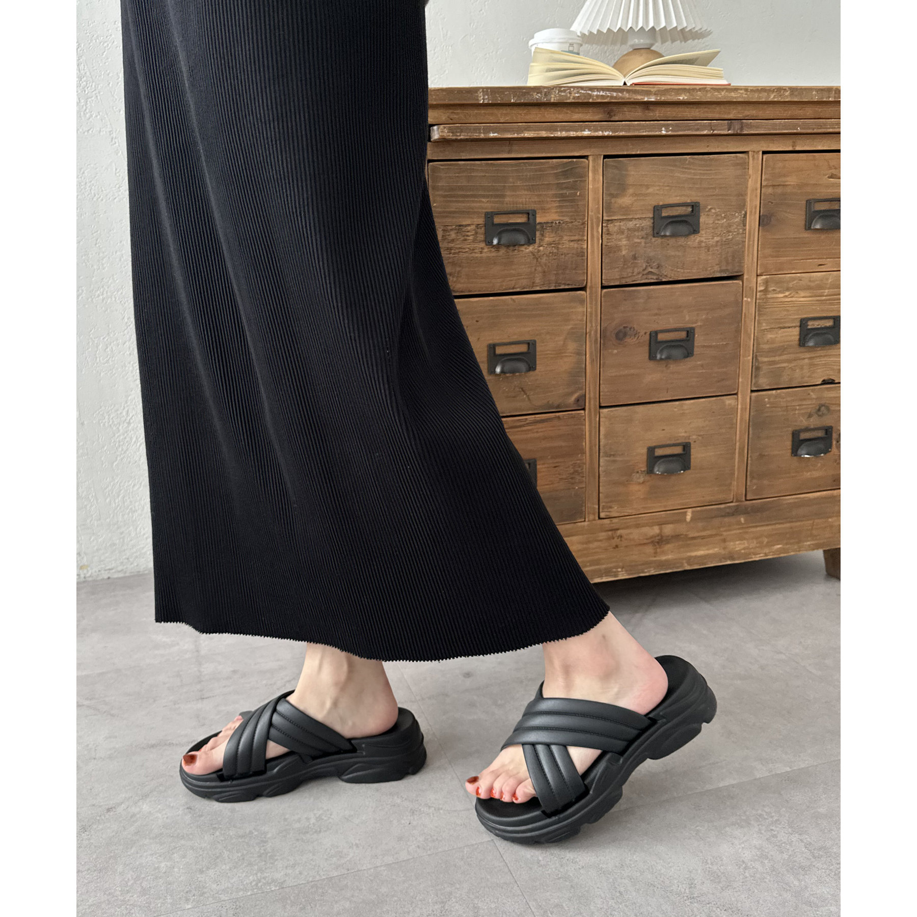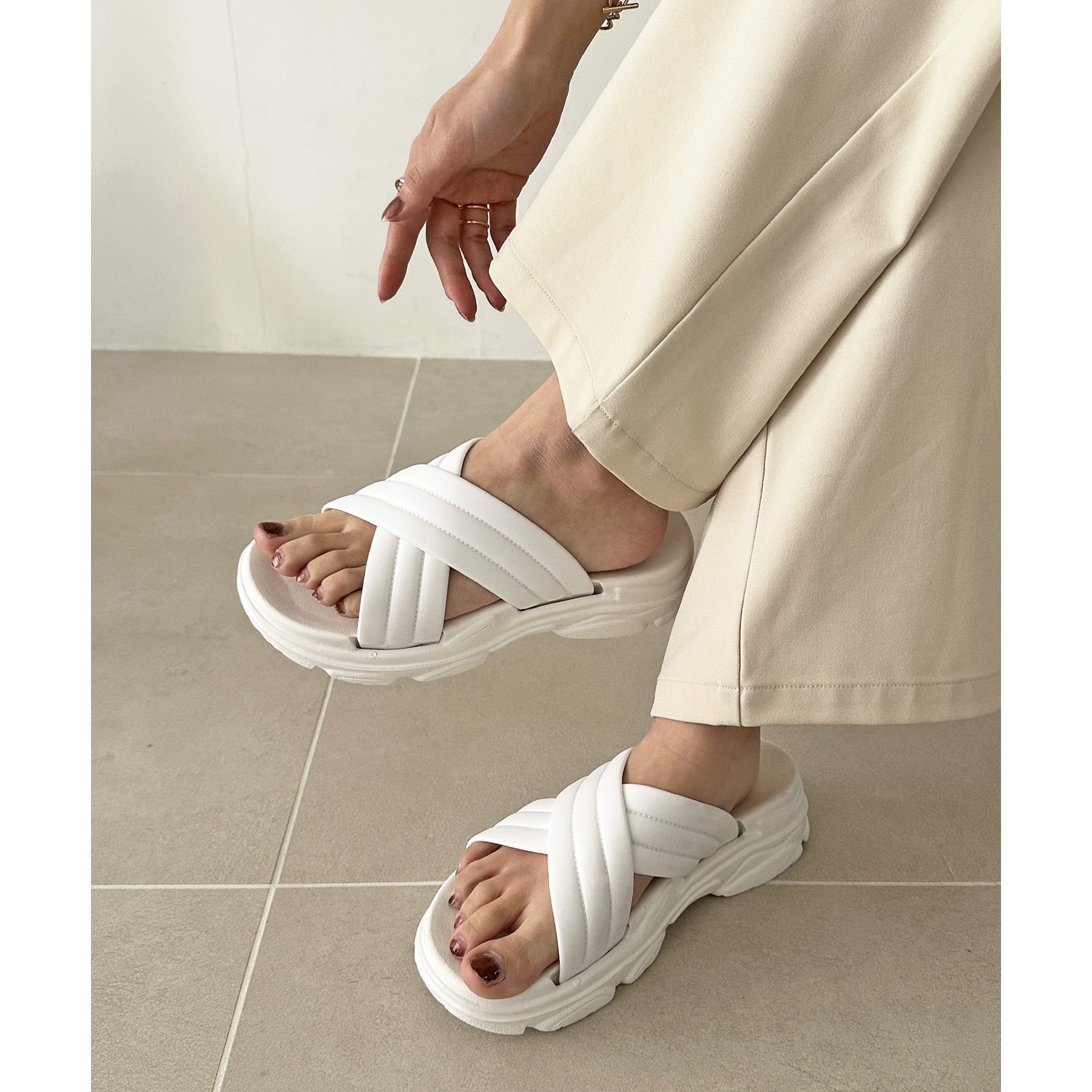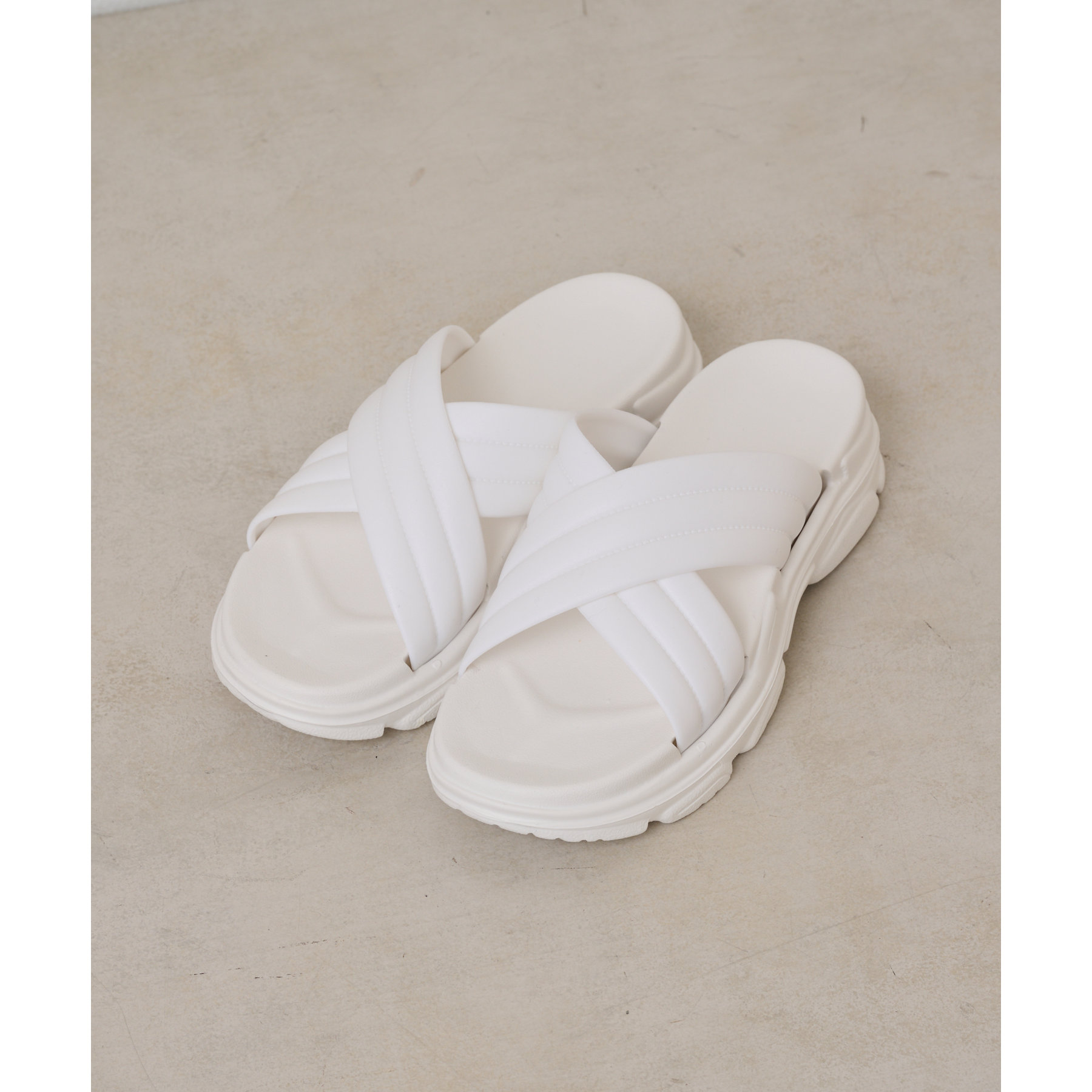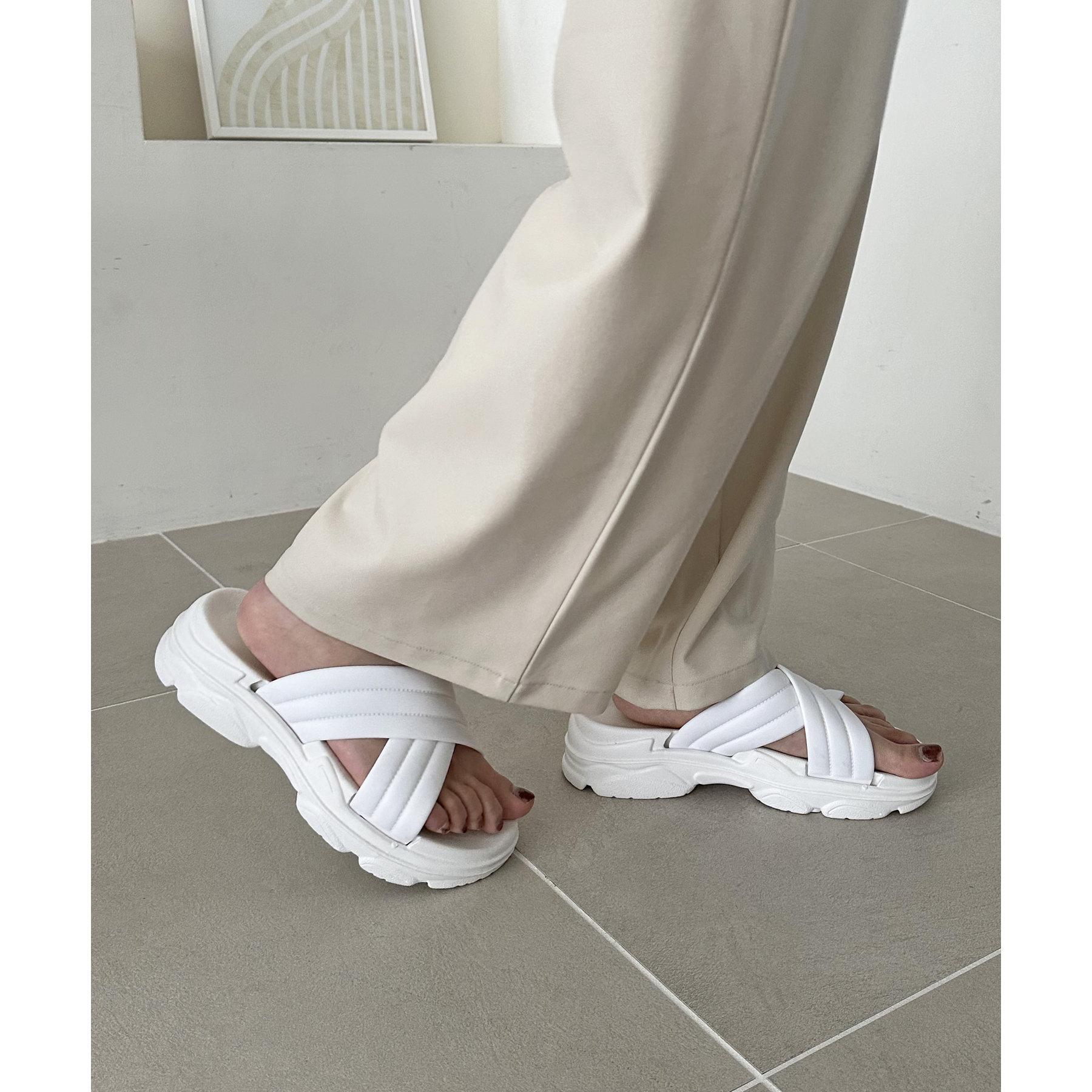 柔らかで弾力があるEVA素材なので、馴染みやすく気軽に履けます♪シンプルなデザインでありながらも厚底なので存在感もあり、履くだけでスタイルアップ効果も◎クロスデザインなので、履いた時に足をしっかりとホールドしてくれ安定感のある履き心地です。脱ぎ履きしやすいので、ちょっとしたお出掛けにもピッタリです。カジュアルにデニムと合わせたり、幅広いコーデに合わせやすい一足です。
