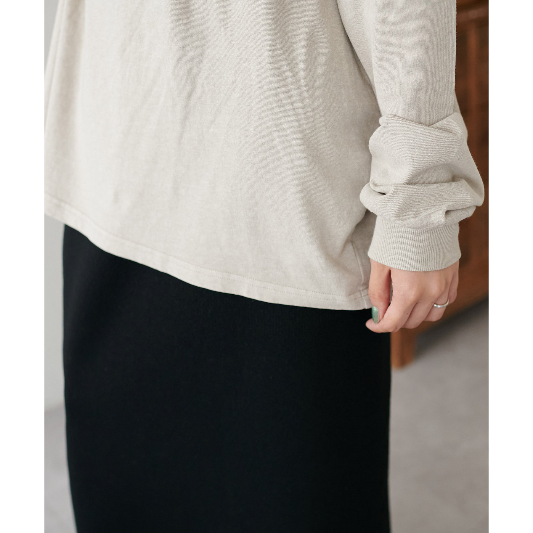 157cmレディーススタッフ:柔らかな生地感なので、スカートやパンツにインもしやすいです〇